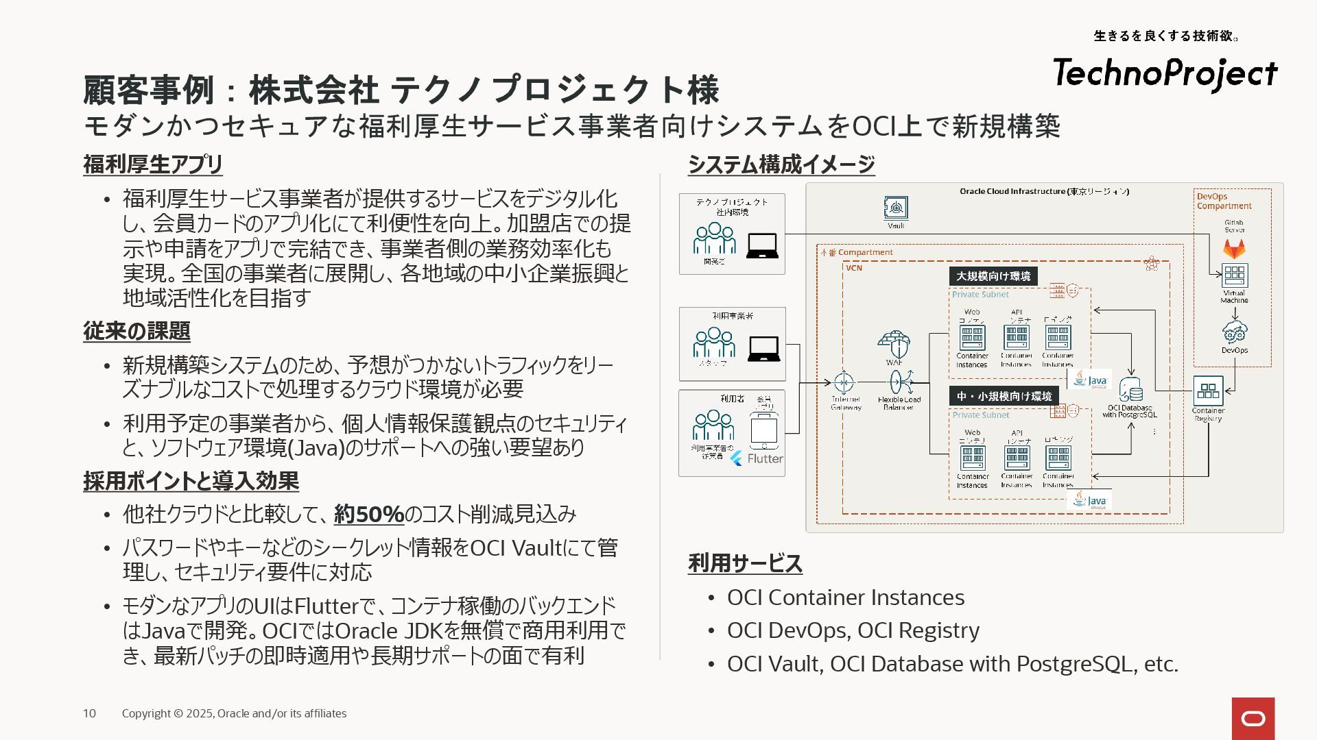 モダンかつセキュアな福利厚生サービス事業者向けシステムをOCI上で新規構築 福利厚生アプリ • 福利厚生サービス事業者が提供するサービスをデジタル化 し、会員カードのアプリ化にて利便性を向上。加盟店での提 示や申請をアプリで完結でき、事業者側の業務効率化も 実現。全国の事業者に展開し、各地域の中小企業振興と 地域活性化を目指す 従来の課題 • 新規構築システムのため、予想がつかないトラフィックをリー ズナブルなコストで処理するクラウド環境が必要 • 利用予定の事業者から、個人情報保護観点のセキュリティ と、ソフトウェア環境(Java)のサポートへの強い要望あり 採用ポイントと導入効果 • 他社クラウドと比較して、約50%のコスト削減見込み • パスワードやキーなどのシークレット情報をOCI Vaultにて管 理し、セキュリティ要件に対応 • モダンなアプリのUIはFlutterで、コンテナ稼働のバックエンド はJavaで開発。OCIではOracle JDKを無償で商用利用で き、最新パッチの即時適用や長期サポートの面で有利 システム構成イメージ 利用サービス • OCI Container Instances • OCI DevOps, OCI Registry • OCI Vault, OCI Database with PostgreSQL, etc.