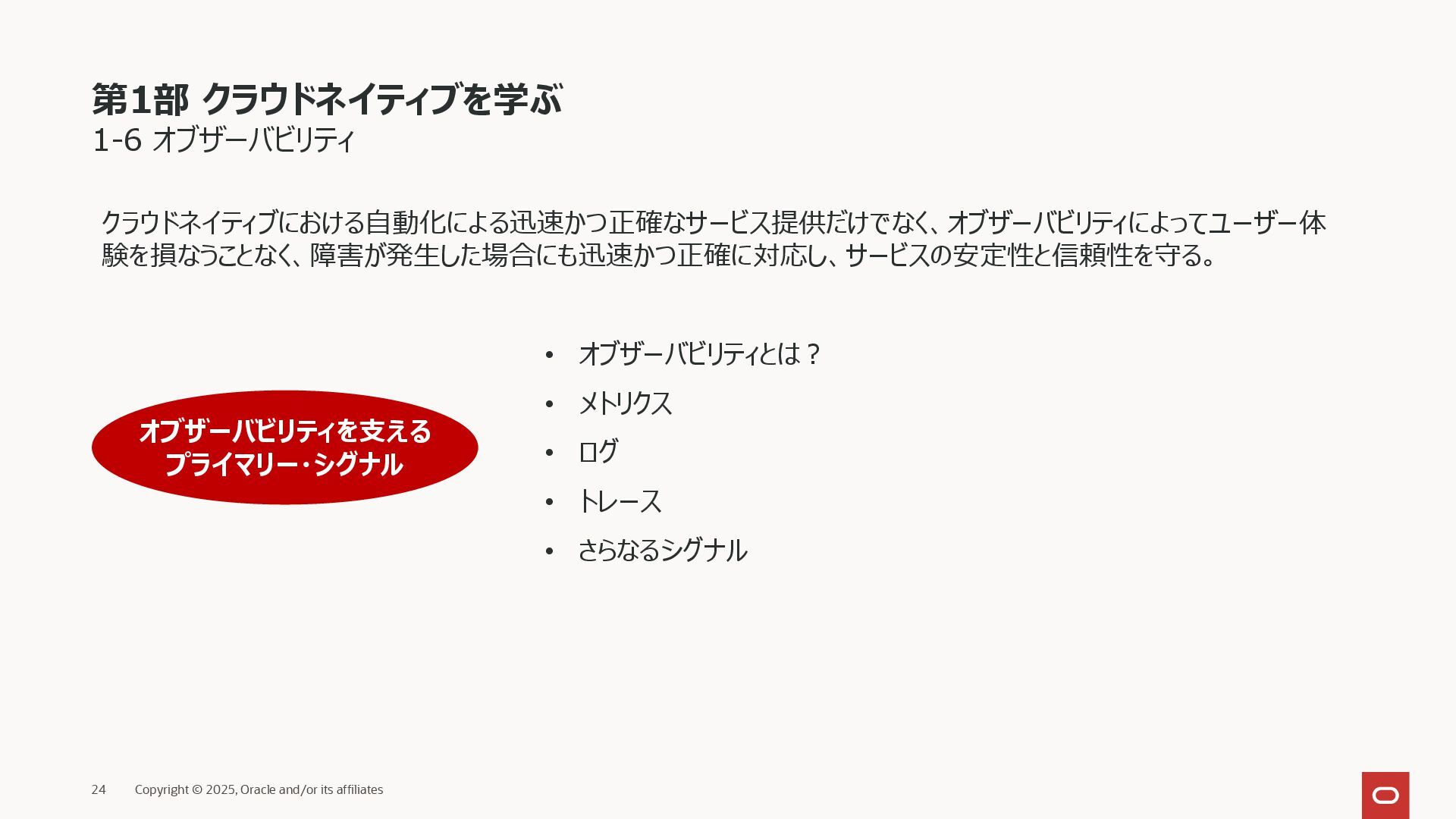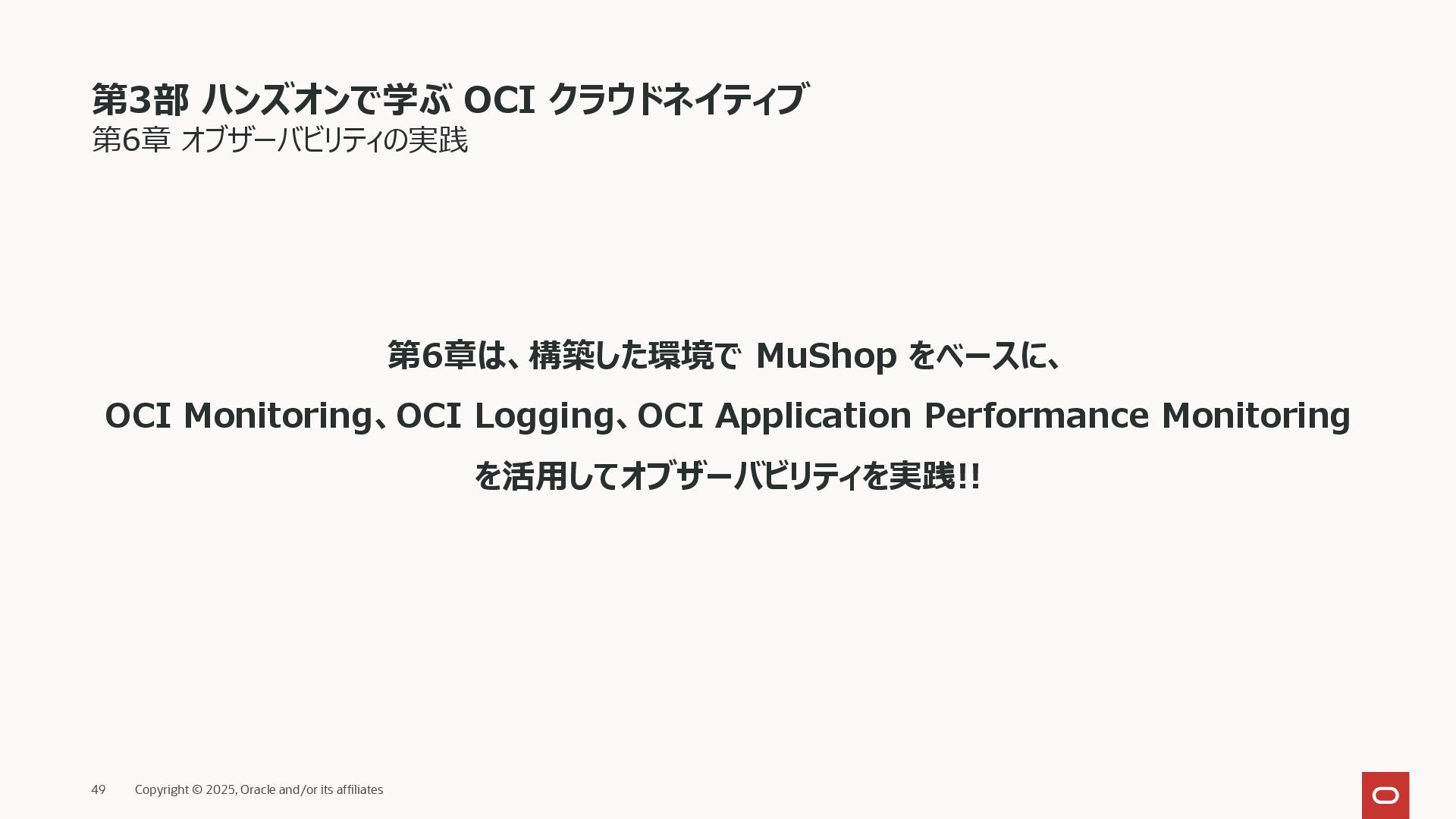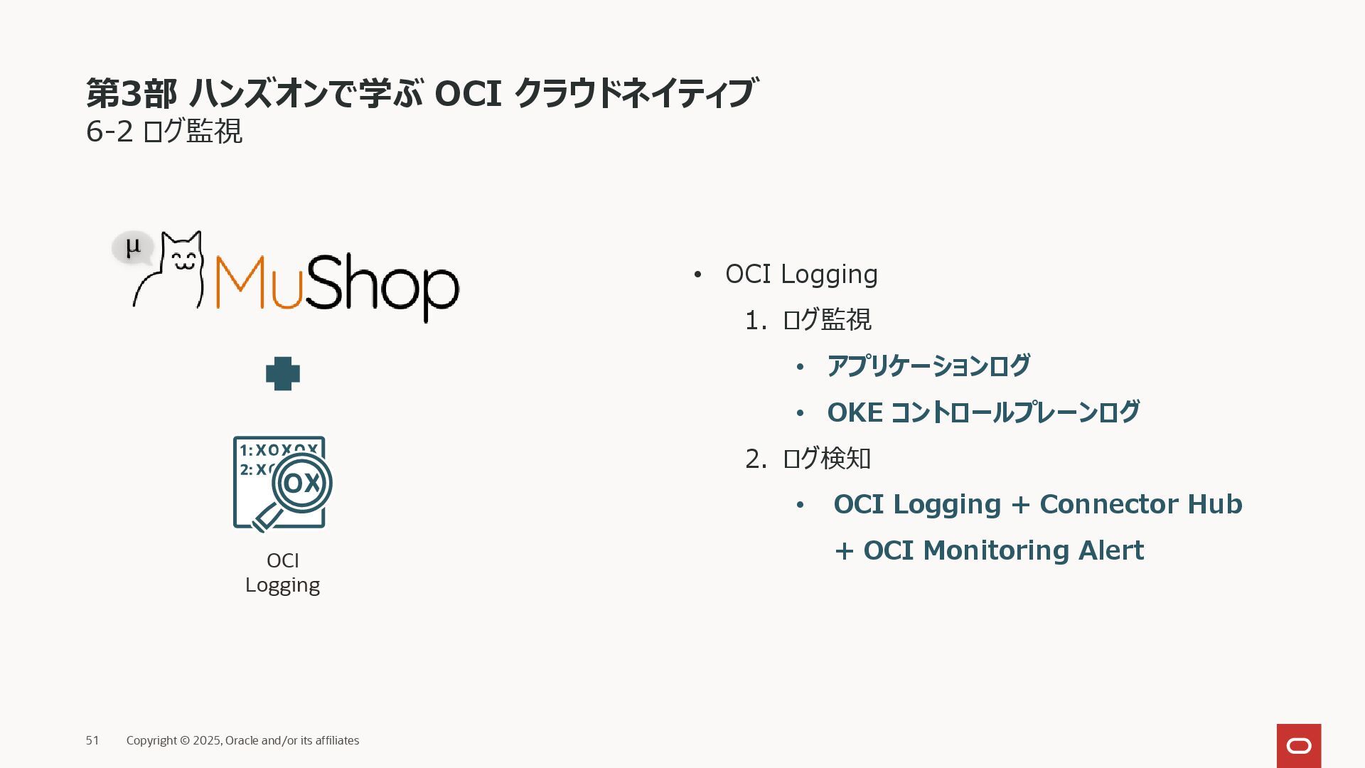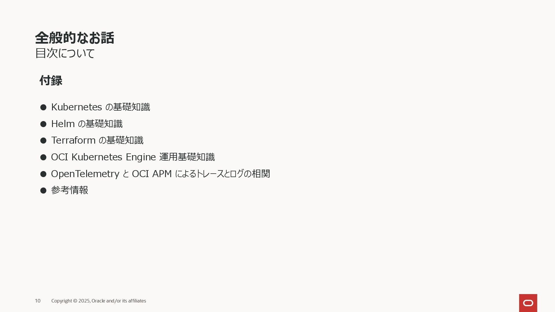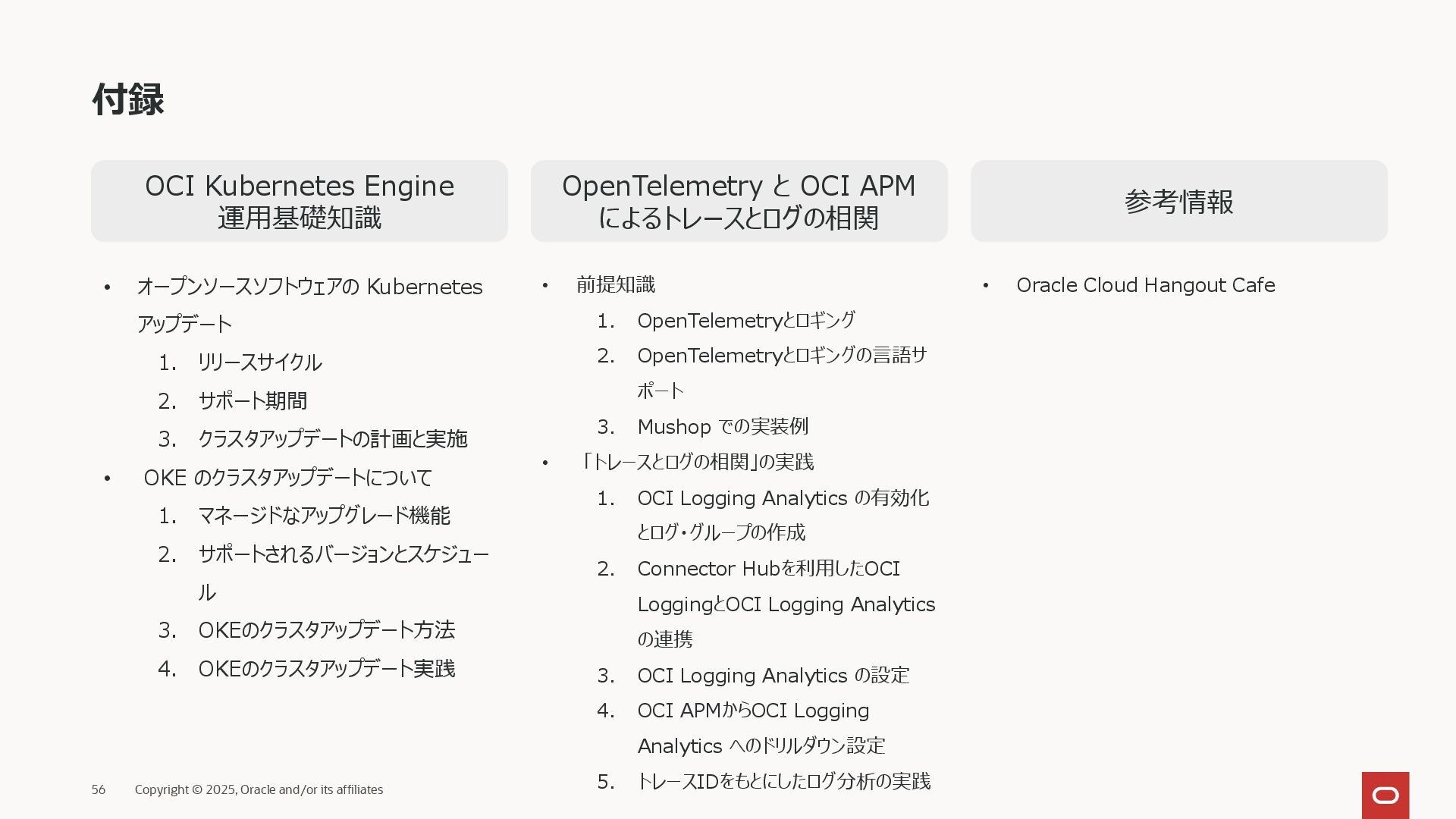Kubernetes Engine 運用基礎知識 OpenTelemetry と OCI APM によるトレースとログの相関 参考情報 • オープンソースソフトウェアの Kubernetes アップデート 1. リリースサイクル 2. サポート期間 3. クラスタアップデートの計画と実施 • OKE のクラスタアップデートについて 1. マネージドなアップグレード機能 2. サポートされるバージョンとスケジュー ル 3. OKEのクラスタアップデート方法 4. OKEのクラスタアップデート実践 • 前提知識 1. OpenTelemetryとロギング 2. OpenTelemetryとロギングの言語サ ポート 3. Mushop での実装例 • 「トレースとログの相関」の実践 1. OCI Logging Analytics の有効化 とログ・グループの作成 2. Connector Hubを利用したOCI LoggingとOCI Logging Analytics の連携 3. OCI Logging Analytics の設定 4. OCI APMからOCI Logging Analytics へのドリルダウン設定 5. トレースIDをもとにしたログ分析の実践 • Oracle Cloud Hangout Cafe
