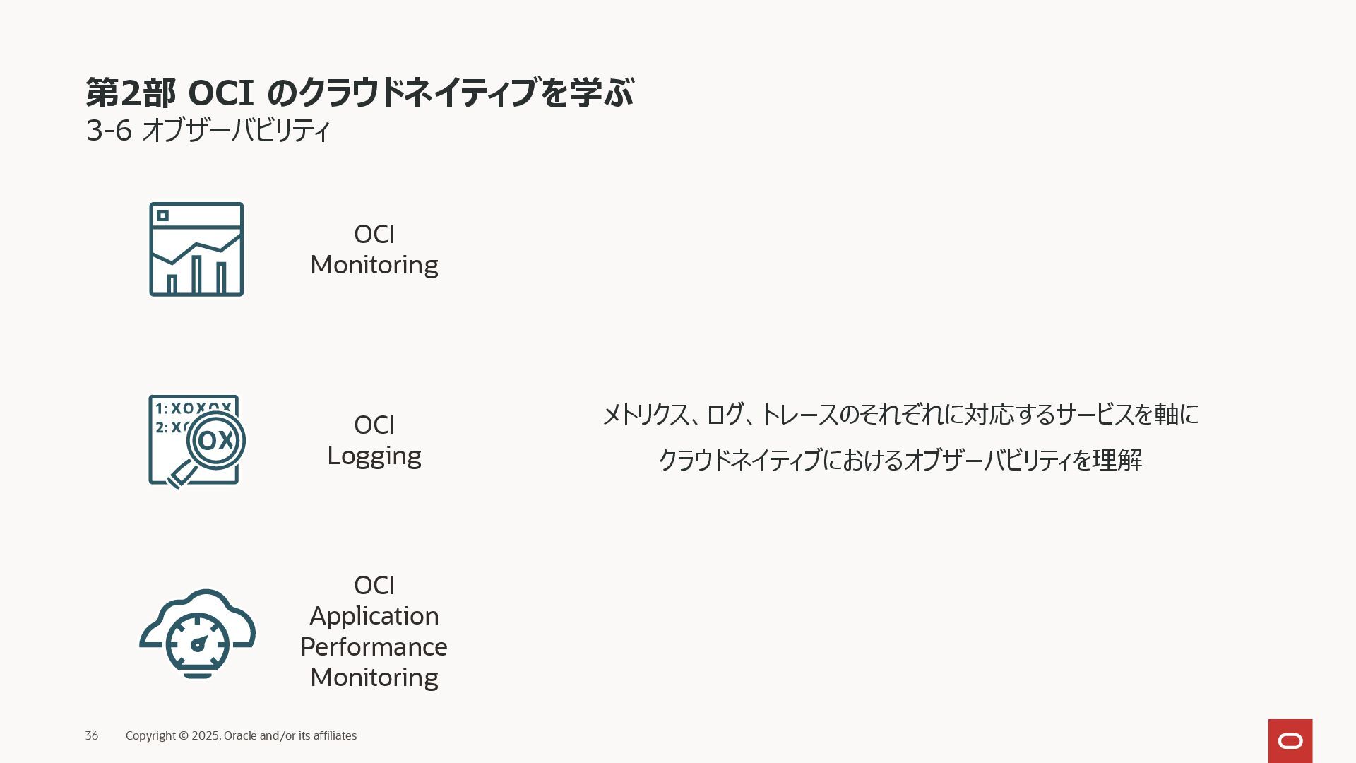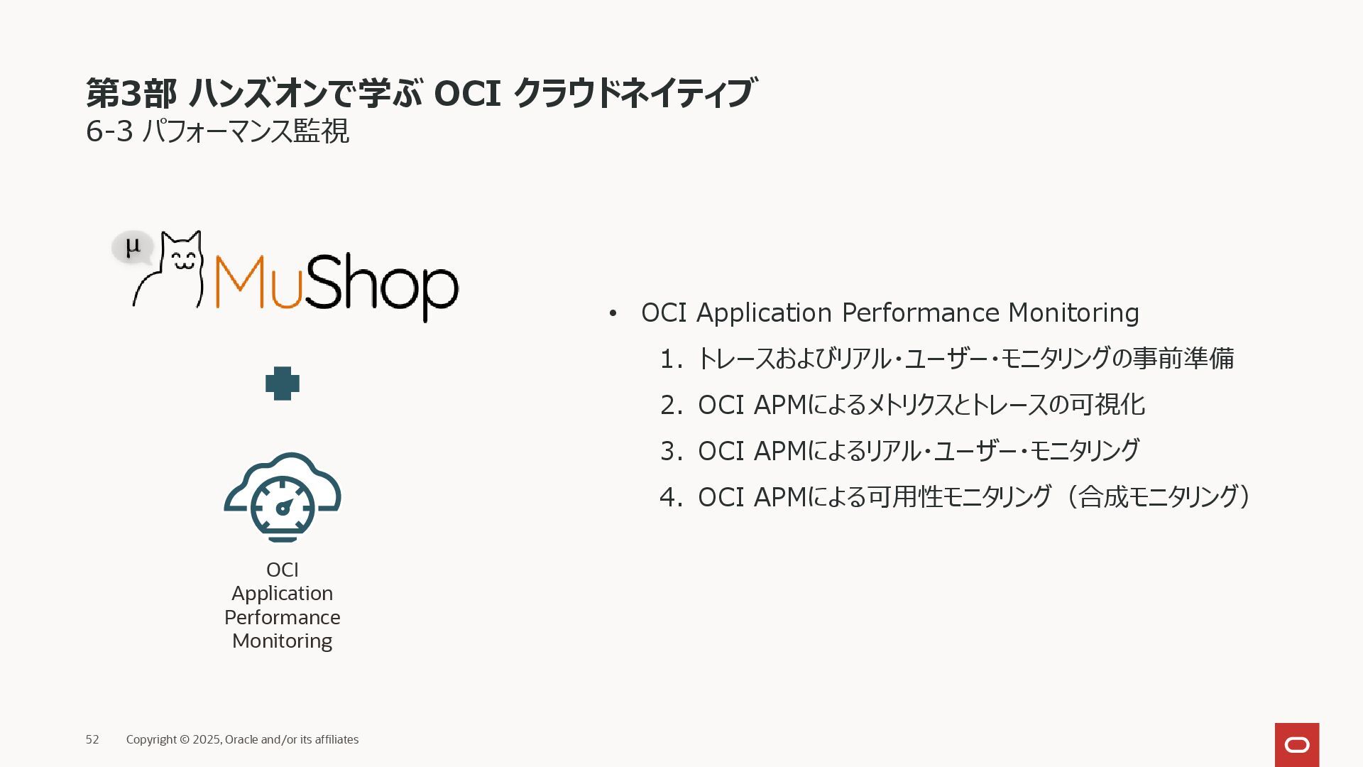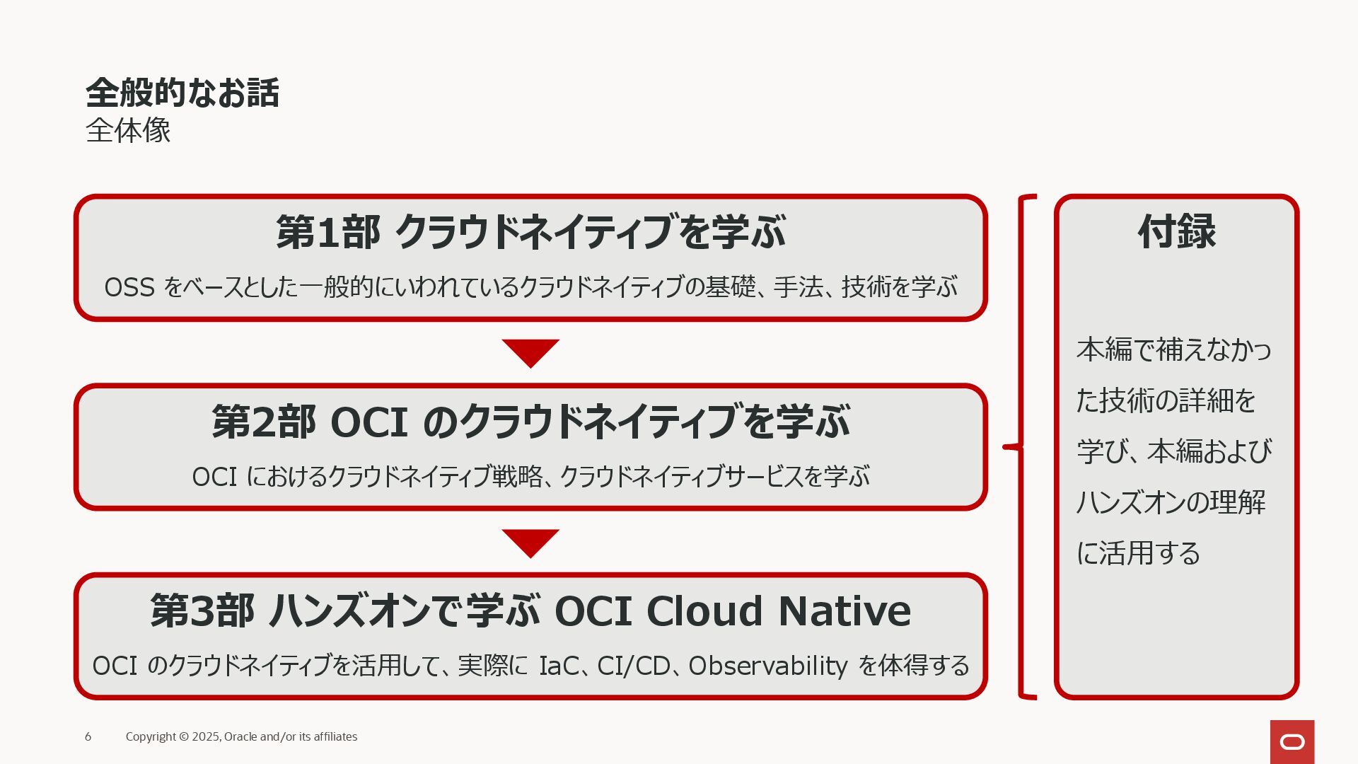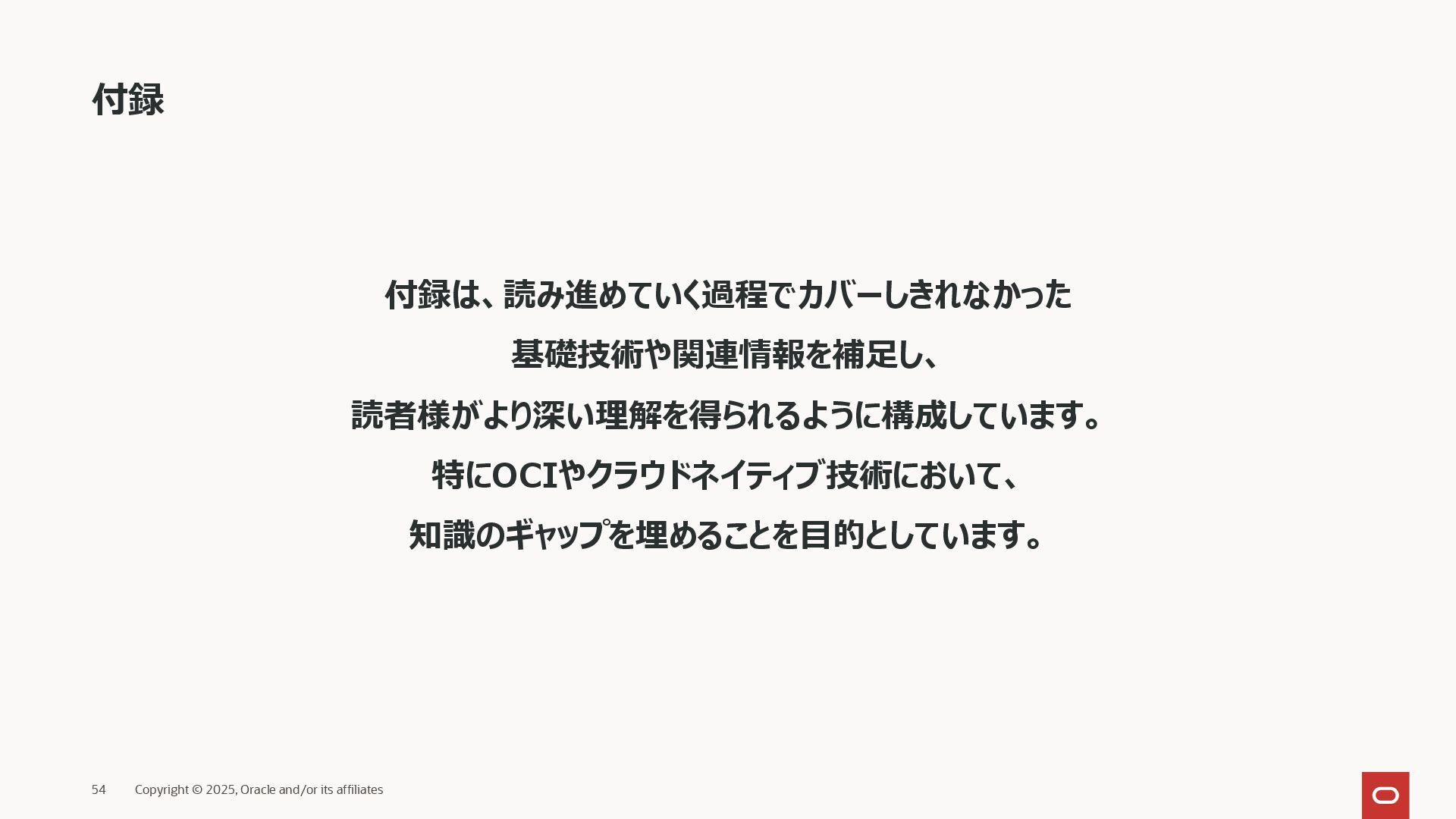 Kubernetes Engine 運用基礎知識 OpenTelemetry と OCI APM によるトレースとログの相関 参考情報 • オープンソースソフトウェアの Kubernetes アップデート 1. リリースサイクル 2. サポート期間 3. クラスタアップデートの計画と実施 • OKE のクラスタアップデートについて 1. マネージドなアップグレード機能 2. サポートされるバージョンとスケジュー ル 3. OKEのクラスタアップデート方法 4. OKEのクラスタアップデート実践 • 前提知識 1. OpenTelemetryとロギング 2. OpenTelemetryとロギングの言語サ ポート 3. Mushop での実装例 • 「トレースとログの相関」の実践 1. OCI Logging Analytics の有効化 とログ・グループの作成 2. Connector Hubを利用したOCI LoggingとOCI Logging Analytics の連携 3. OCI Logging Analytics の設定 4. OCI APMからOCI Logging Analytics へのドリルダウン設定 5. トレースIDをもとにしたログ分析の実践 • Oracle Cloud Hangout Cafe