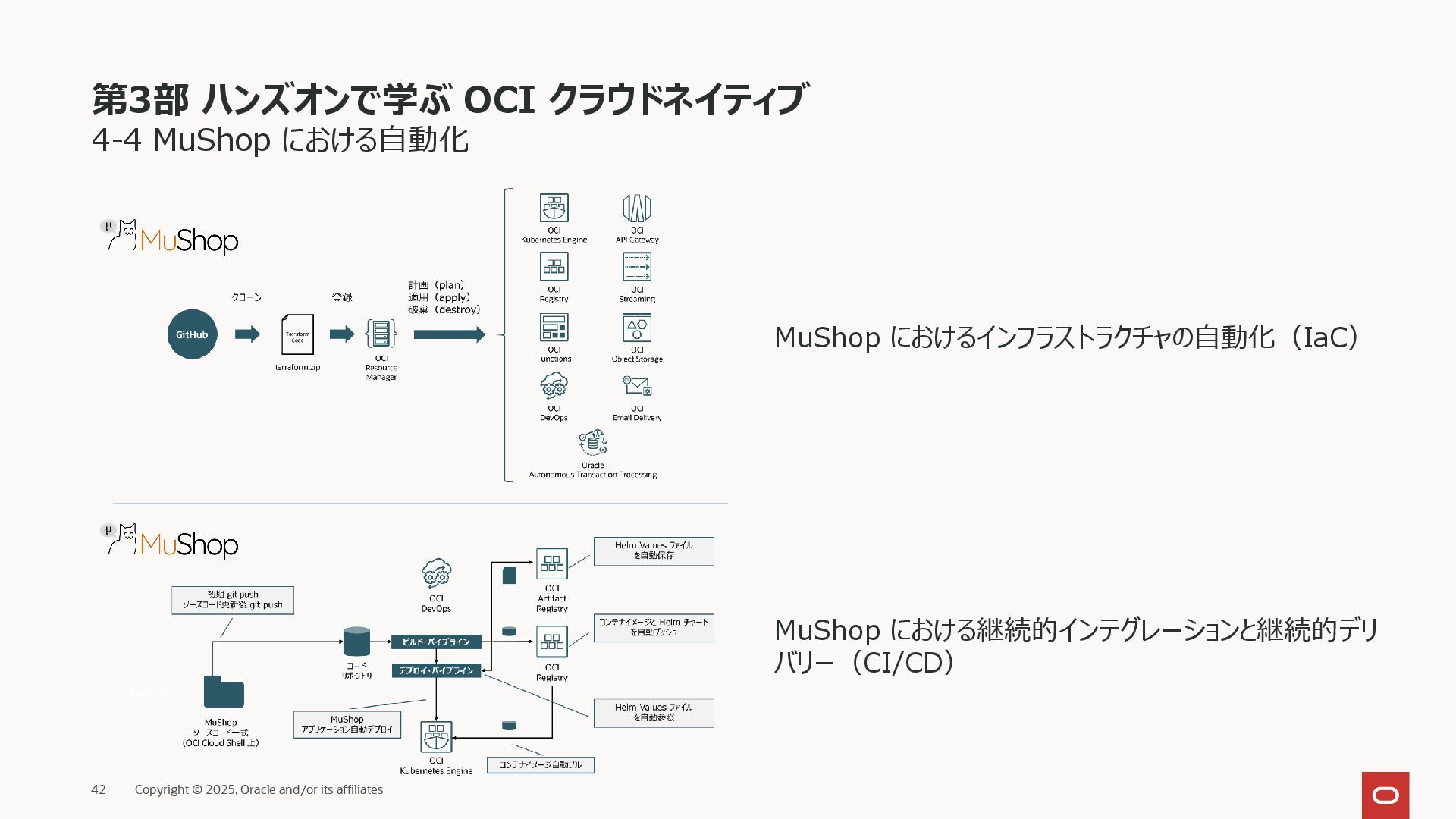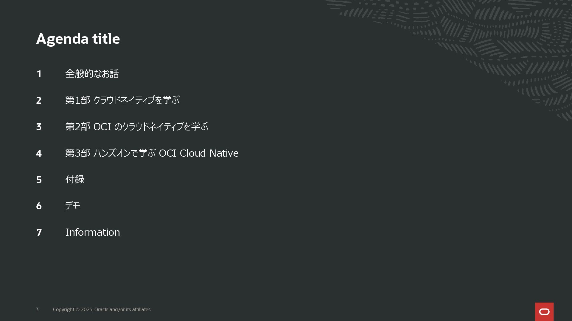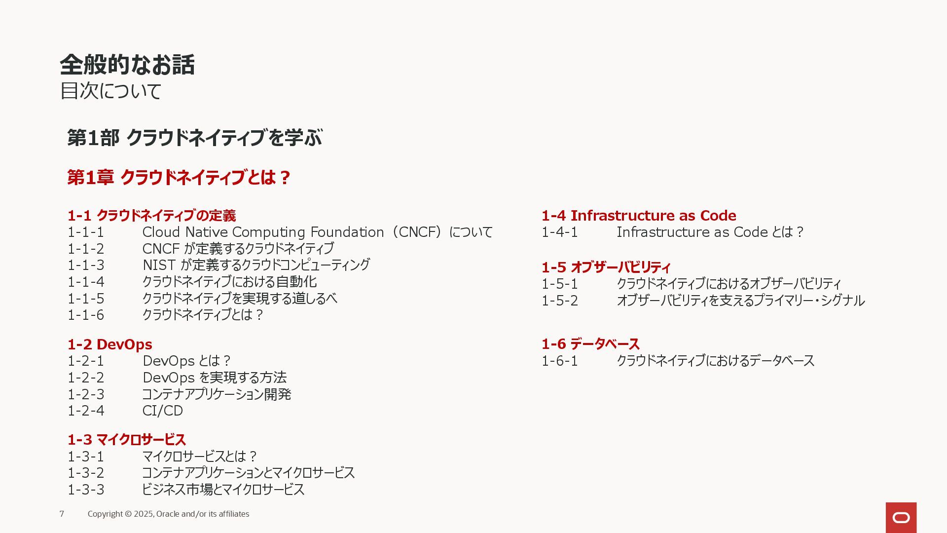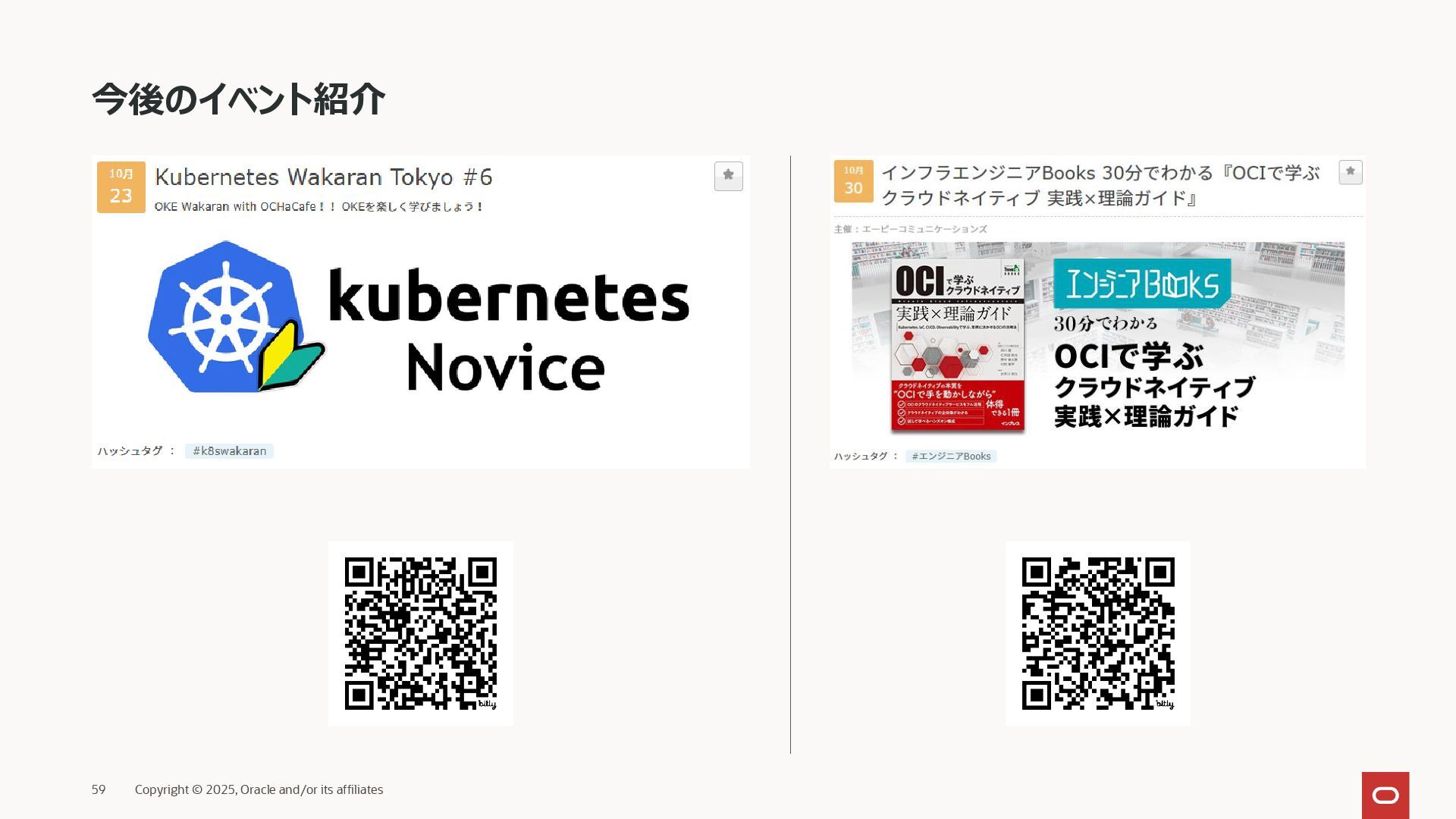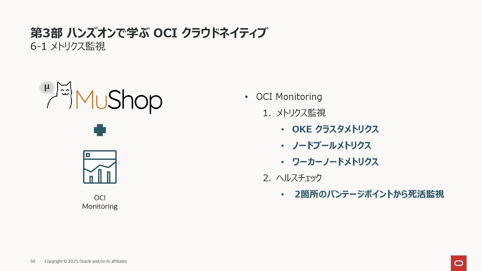 Kubernetes Engine 運用基礎知識 OpenTelemetry と OCI APM によるトレースとログの相関 参考情報 • オープンソースソフトウェアの Kubernetes アップデート 1. リリースサイクル 2. サポート期間 3. クラスタアップデートの計画と実施 • OKE のクラスタアップデートについて 1. マネージドなアップグレード機能 2. サポートされるバージョンとスケジュー ル 3. OKEのクラスタアップデート方法 4. OKEのクラスタアップデート実践 • 前提知識 1. OpenTelemetryとロギング 2. OpenTelemetryとロギングの言語サ ポート 3. Mushop での実装例 • 「トレースとログの相関」の実践 1. OCI Logging Analytics の有効化 とログ・グループの作成 2. Connector Hubを利用したOCI LoggingとOCI Logging Analytics の連携 3. OCI Logging Analytics の設定 4. OCI APMからOCI Logging Analytics へのドリルダウン設定 5. トレースIDをもとにしたログ分析の実践 • Oracle Cloud Hangout Cafe