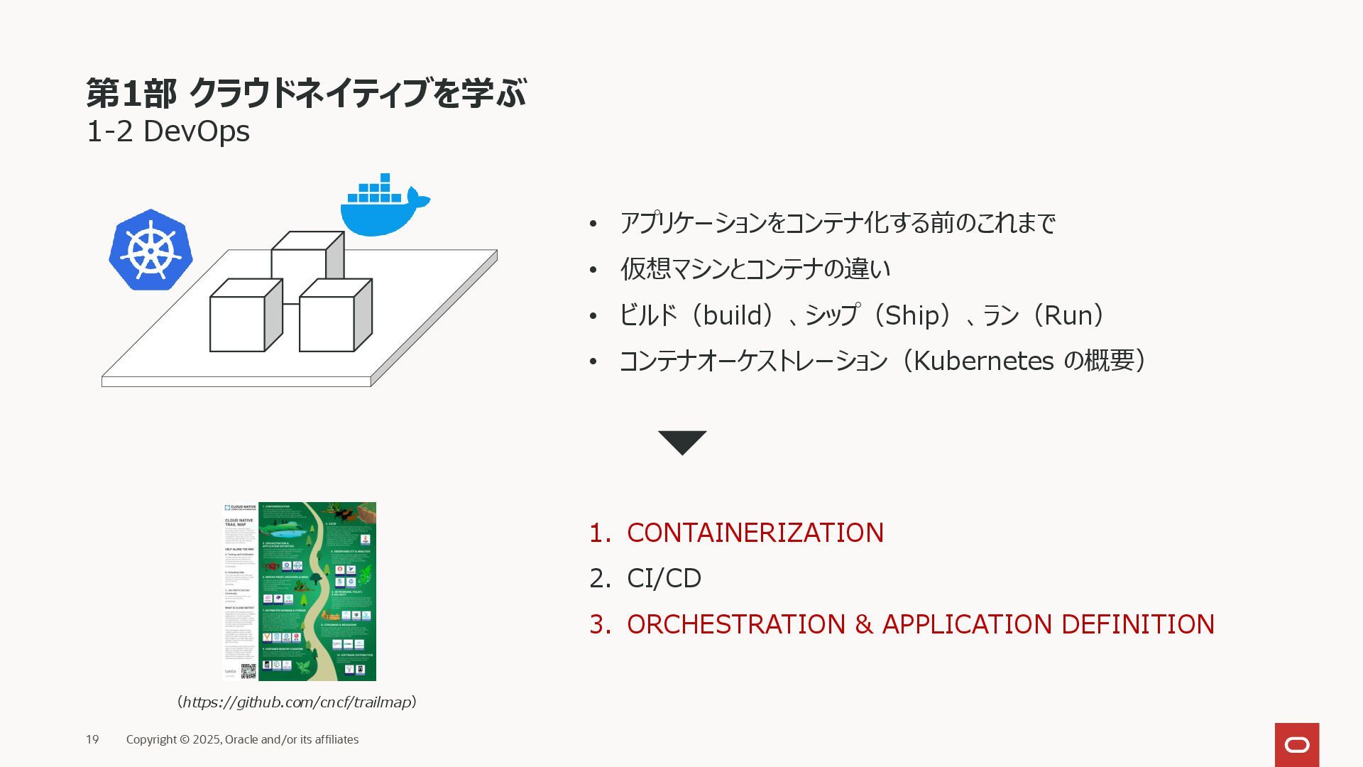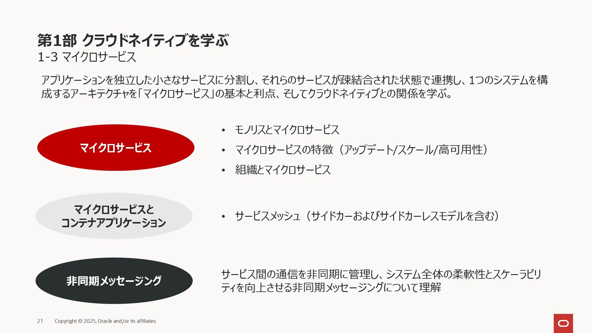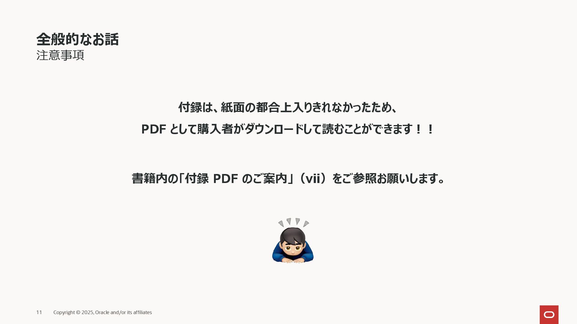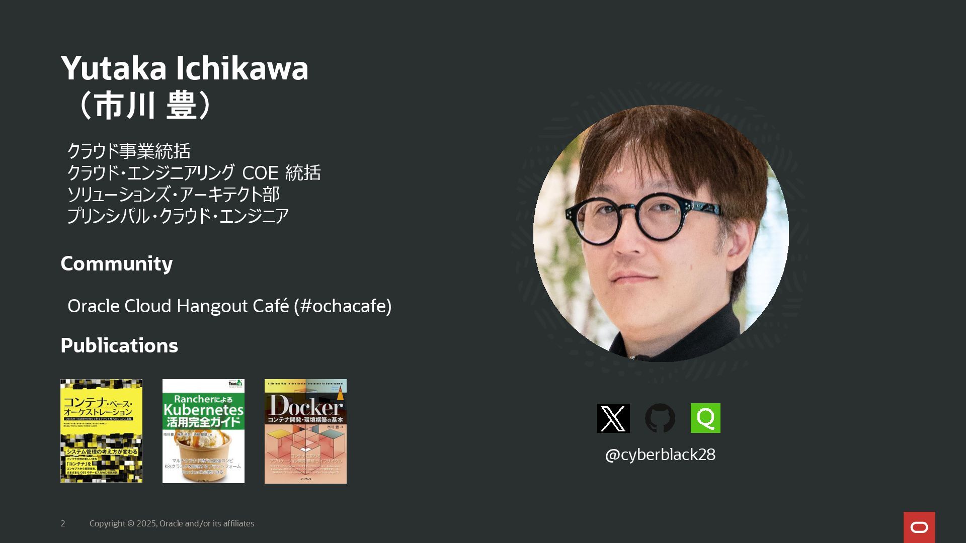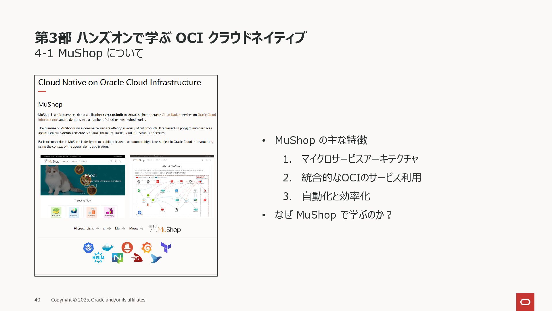 Kubernetes Engine 運用基礎知識 OpenTelemetry と OCI APM によるトレースとログの相関 参考情報 • オープンソースソフトウェアの Kubernetes アップデート 1. リリースサイクル 2. サポート期間 3. クラスタアップデートの計画と実施 • OKE のクラスタアップデートについて 1. マネージドなアップグレード機能 2. サポートされるバージョンとスケジュー ル 3. OKEのクラスタアップデート方法 4. OKEのクラスタアップデート実践 • 前提知識 1. OpenTelemetryとロギング 2. OpenTelemetryとロギングの言語サ ポート 3. Mushop での実装例 • 「トレースとログの相関」の実践 1. OCI Logging Analytics の有効化 とログ・グループの作成 2. Connector Hubを利用したOCI LoggingとOCI Logging Analytics の連携 3. OCI Logging Analytics の設定 4. OCI APMからOCI Logging Analytics へのドリルダウン設定 5. トレースIDをもとにしたログ分析の実践 • Oracle Cloud Hangout Cafe