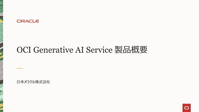 and/or its affiliates. All rights reserved. サービス 価格 単位 Large Cohere $0.0219 10,000 文字 Small Cohere $0.004 10,000 文字 Embed Cohere $0.001 10,000 文字 Llama2-70 $0.015 10,000 文字 サービス 価格 単位 Large Cohere - Dedicated $24.00 AI Unit Per Hour Small Cohere - Dedicated $6.50 AI Unit Per Hour Embed Cohere - Dedicated $10.90 AI Unit Per Hour Llama2-70 - Dedicated $12.00 AI Unit Per Hour サーバー 専有クラスタ 専有クラスタ 専有クラスタ オンデマンド: 低コストでの使用 (文字数での従量課金/インフラ共有) 専用AIクラスタ: 予測可能な料金、安定した性能 (時間課金 / インフラ専有) ※一文字単位で課金 ※入力と出力の合計の文字数が対象 ※一秒単位で課金 ※ファインチューニング用専用AIクラスタは最低 1 unit hour、ホスティング 用専用AIクラスタは最低 744 units hourの利用が必須となります