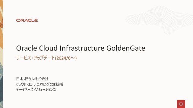 上の MySQL HeatWave • Azure 上の MySQL HeatWave • OCI PostgreSQL • PostgreSQL 用 Azure Cosmos DB • IBM Db2 for z/OS • OCI Redis クラスター • GoldenGateデプロイメントのバージョンによって、 各接続先のサポート可否、サポートバージョン、ターゲットのみのサポートか、などが異なります。 詳細はドキュメントをご確認下さい。 https://docs.oracle.com/en/cloud/paas/goldengate-service/wxntz/index.html#GUID-16ACC5AF-8474-4E86- 965D-D9AE14A45D70 OCI GoldenGate Copyright © 2024, Oracle and/or its affiliates 6 OCI GoldenGate