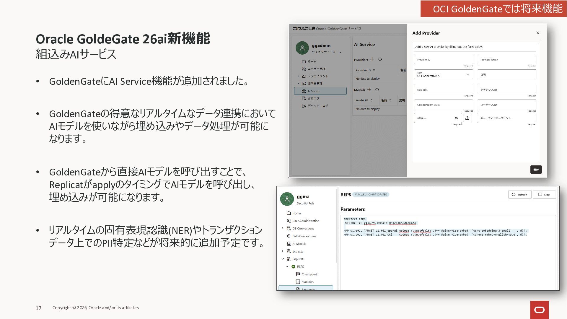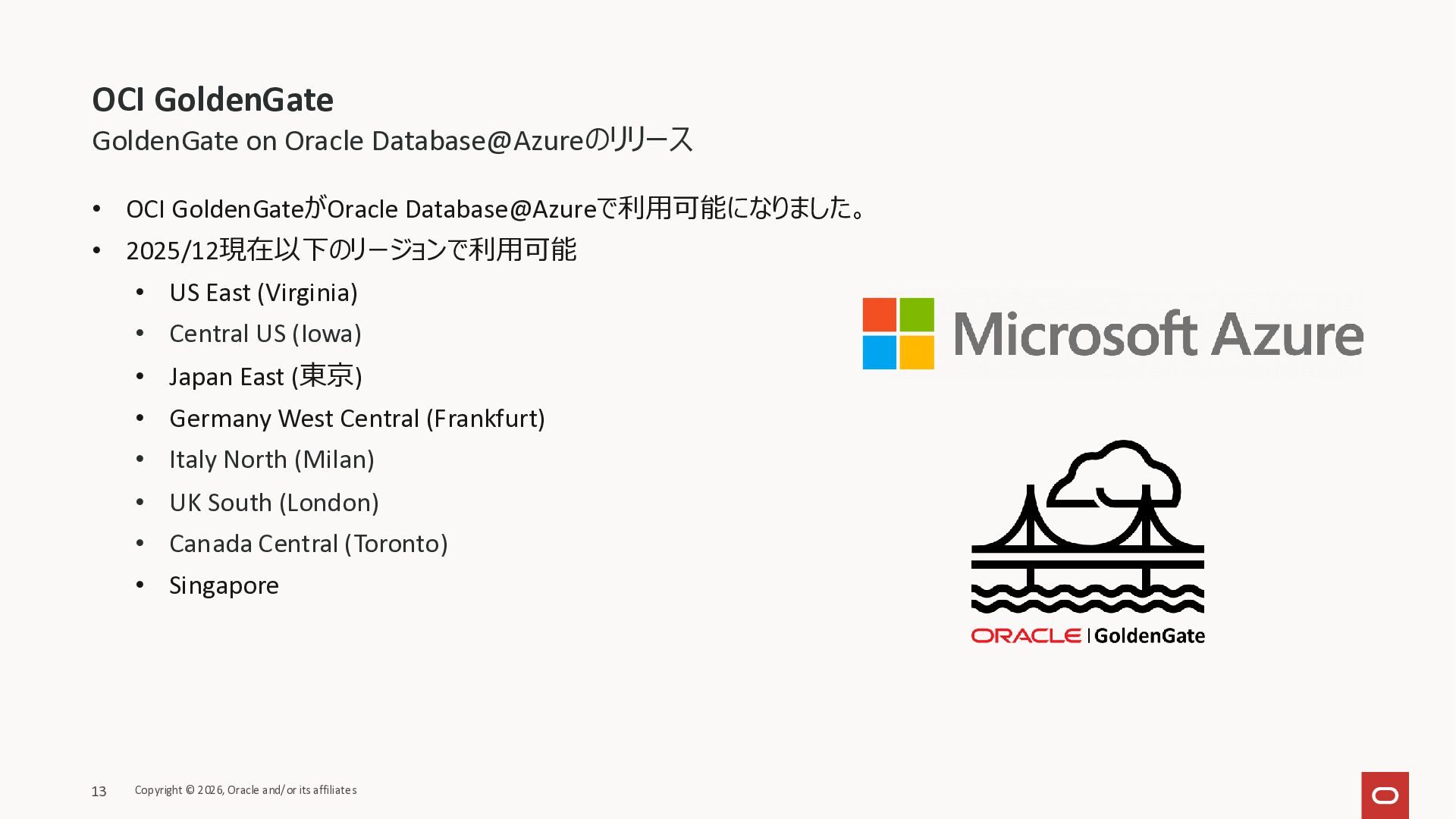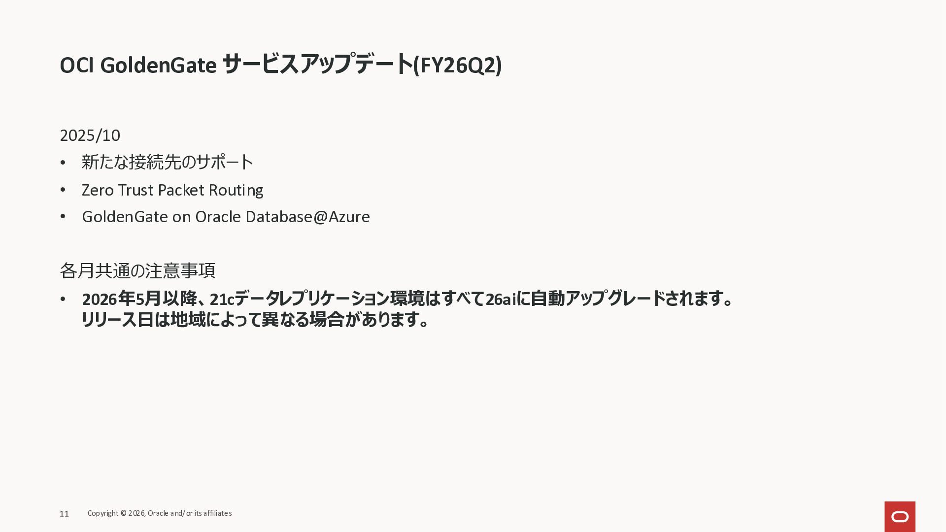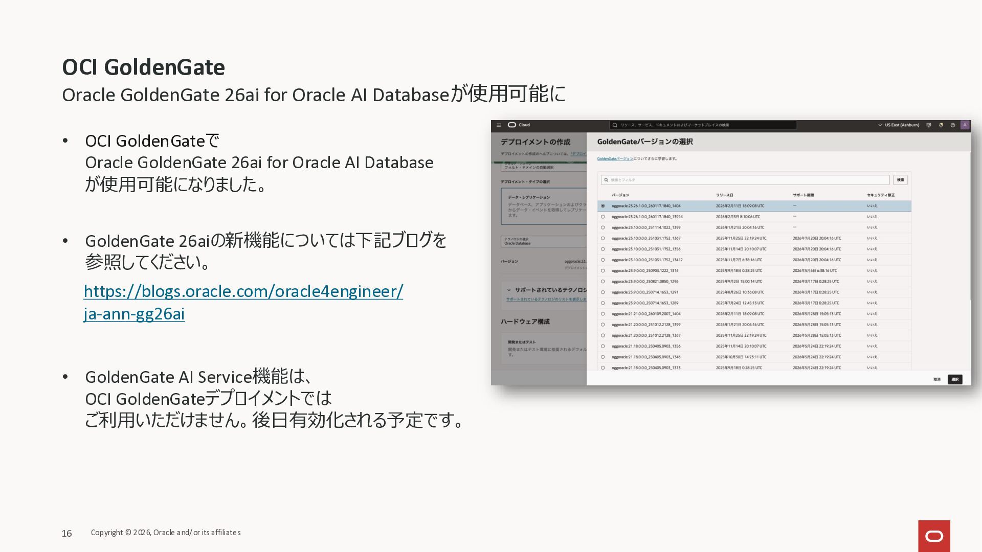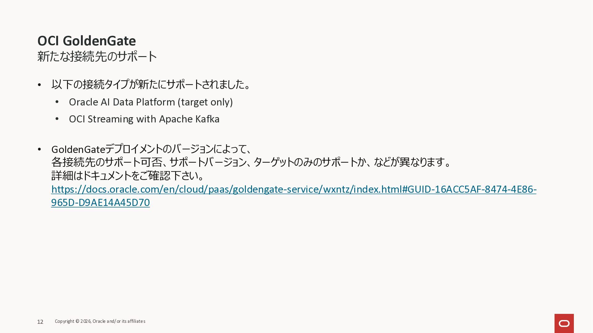 (ターゲットのみ) • Oracle API for MongoDB (ターゲットのみ) • Google Pub/Sub (ターゲットのみ) • Oracle Database@AWS - Autonomous Database • GoldenGateデプロイメントのバージョンによって、 各接続先のサポート可否、サポートバージョン、ターゲットのみのサポートか、などが異なります。 詳細はドキュメントをご確認下さい。 https://docs.oracle.com/en/cloud/paas/goldengate-service/wxntz/index.html#GUID-16ACC5AF-8474-4E86- 965D-D9AE14A45D70 Copyright © 2026, Oracle and/or its affiliates 4 OCI GoldenGate