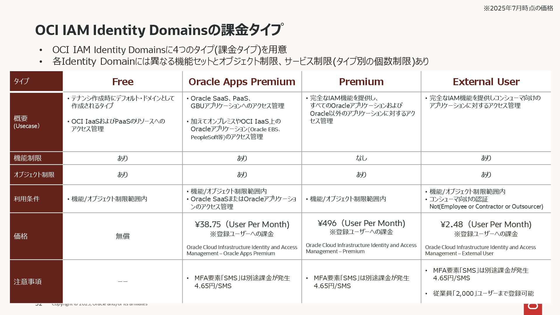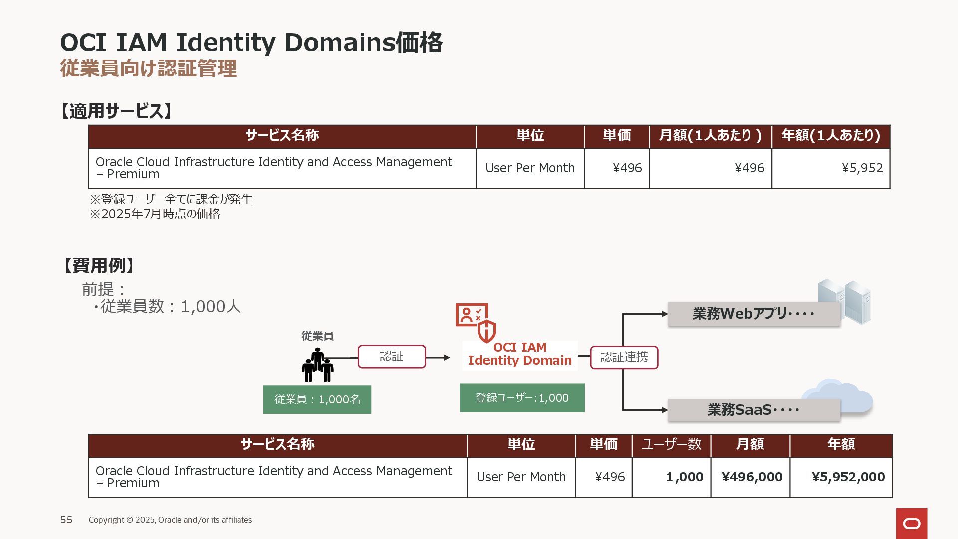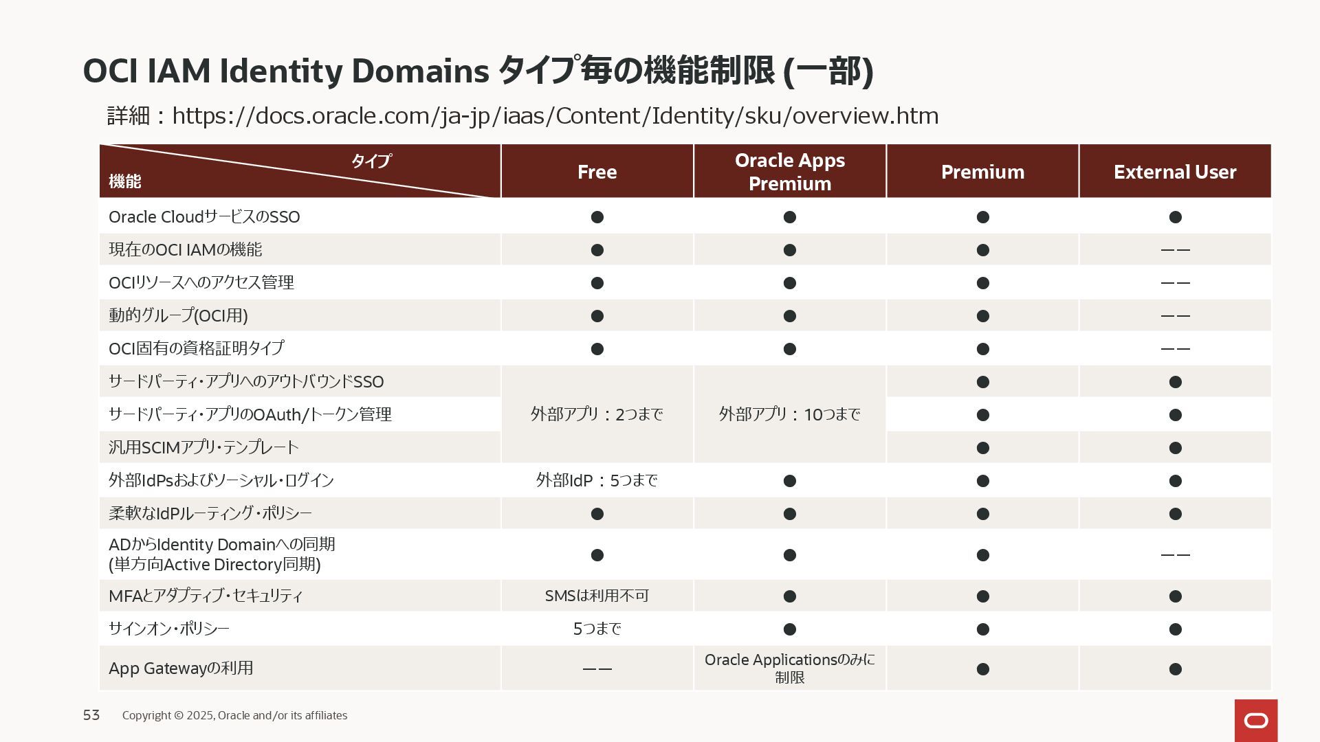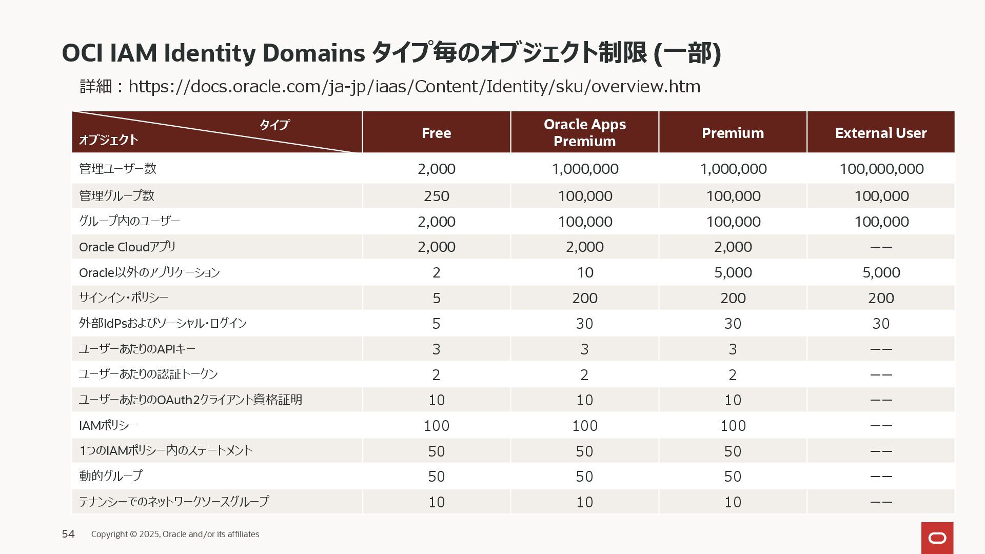 and/or its affiliates 54 詳細:https://docs.oracle.com/ja-jp/iaas/Content/Identity/sku/overview.htm タイプ オブジェクト Free Oracle Apps Premium Premium External User 管理ユーザー数 2,000 1,000,000 1,000,000 100,000,000 管理グループ数 250 100,000 100,000 100,000 グループ内のユーザー 2,000 100,000 100,000 100,000 Oracle Cloudアプリ 2,000 2,000 2,000 ーー Oracle以外のアプリケーション 2 10 5,000 5,000 サインイン・ポリシー 5 200 200 200 外部IdPsおよびソーシャル・ログイン 5 30 30 30 ユーザーあたりのAPIキー 3 3 3 ーー ユーザーあたりの認証トークン 2 2 2 ーー ユーザーあたりのOAuth2クライアント資格証明 10 10 10 ーー IAMポリシー 100 100 100 ーー 1つのIAMポリシー内のステートメント 50 50 50 ーー 動的グループ 50 50 50 ーー テナンシーでのネットワークソースグループ 10 10 10 ーー