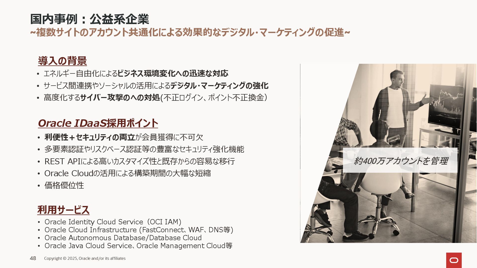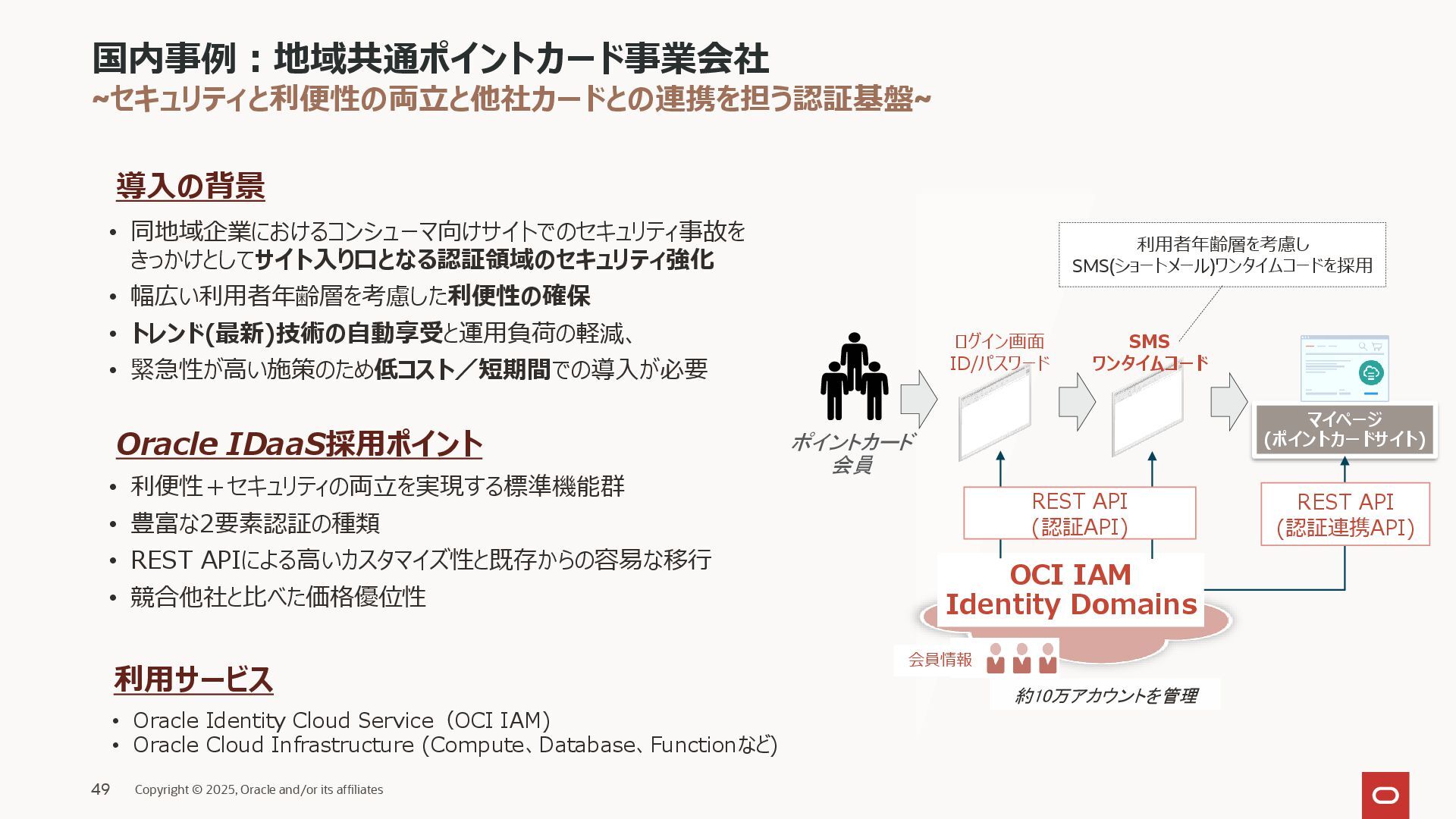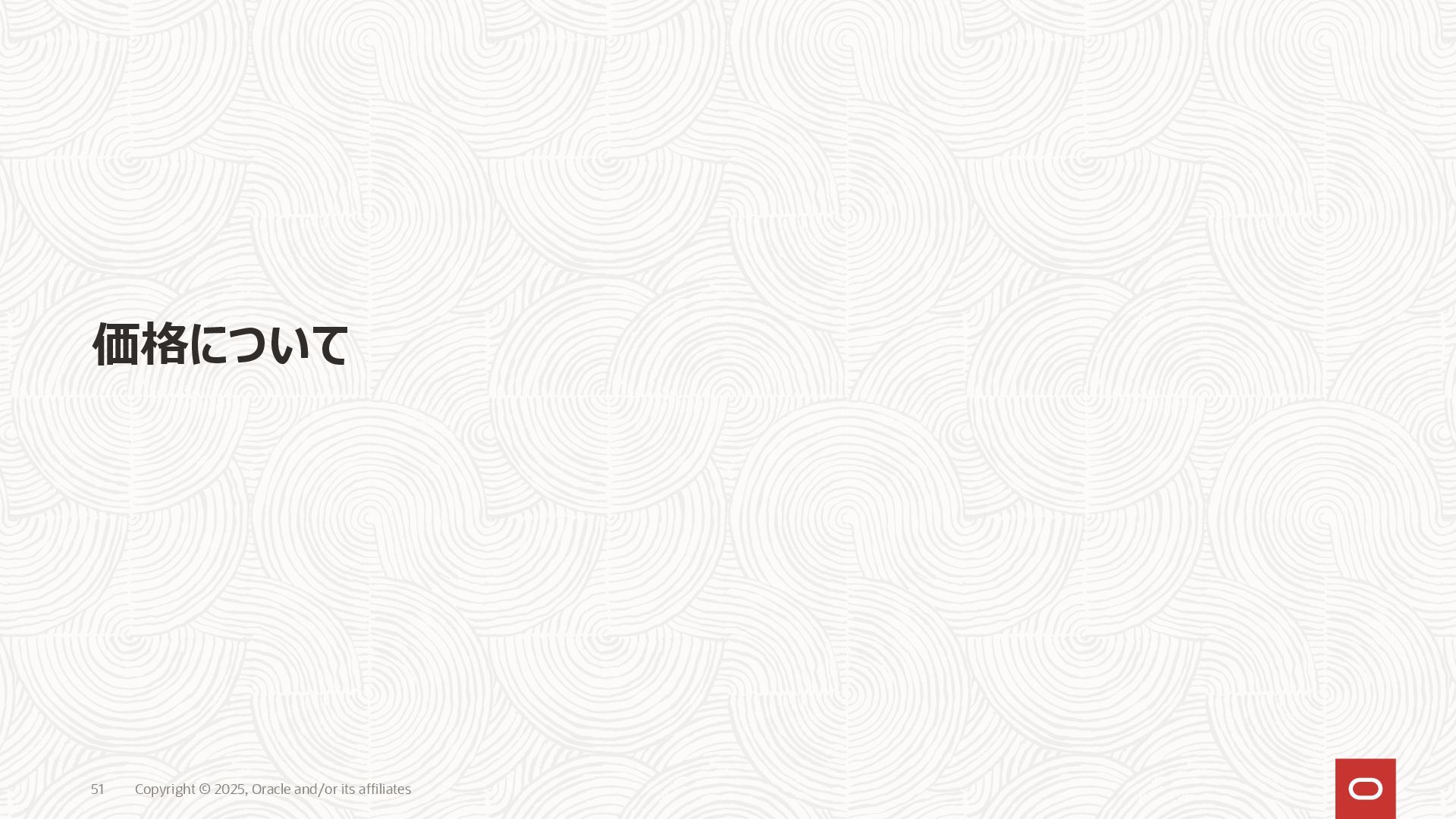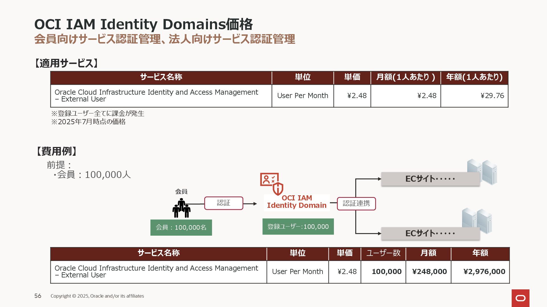 and/or its affiliates 54 詳細:https://docs.oracle.com/ja-jp/iaas/Content/Identity/sku/overview.htm タイプ オブジェクト Free Oracle Apps Premium Premium External User 管理ユーザー数 2,000 1,000,000 1,000,000 100,000,000 管理グループ数 250 100,000 100,000 100,000 グループ内のユーザー 2,000 100,000 100,000 100,000 Oracle Cloudアプリ 2,000 2,000 2,000 ーー Oracle以外のアプリケーション 2 10 5,000 5,000 サインイン・ポリシー 5 200 200 200 外部IdPsおよびソーシャル・ログイン 5 30 30 30 ユーザーあたりのAPIキー 3 3 3 ーー ユーザーあたりの認証トークン 2 2 2 ーー ユーザーあたりのOAuth2クライアント資格証明 10 10 10 ーー IAMポリシー 100 100 100 ーー 1つのIAMポリシー内のステートメント 50 50 50 ーー 動的グループ 50 50 50 ーー テナンシーでのネットワークソースグループ 10 10 10 ーー