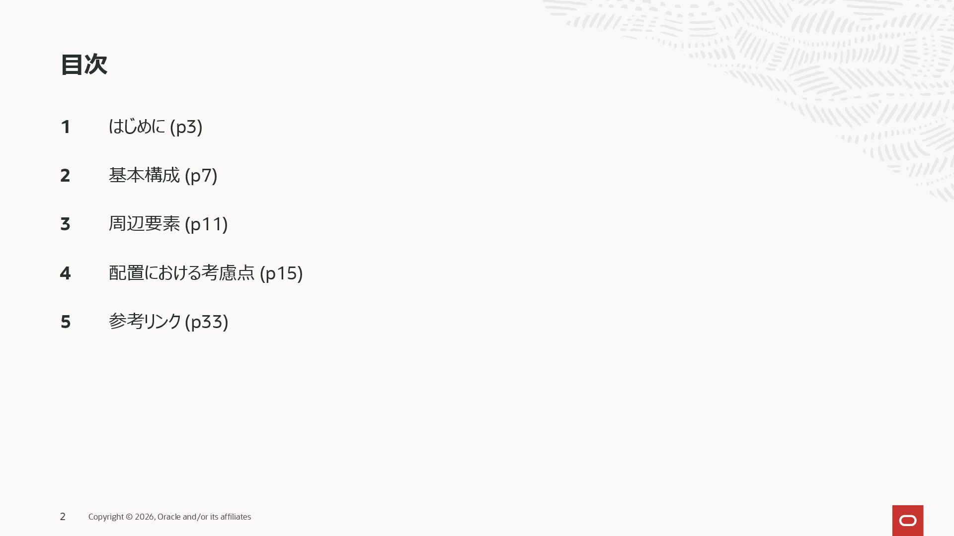 周辺要素 (p11) 配置における考慮点 (p15) 参考リンク (p33) Copyright © 2026, Oracle and/or its affiliates 2