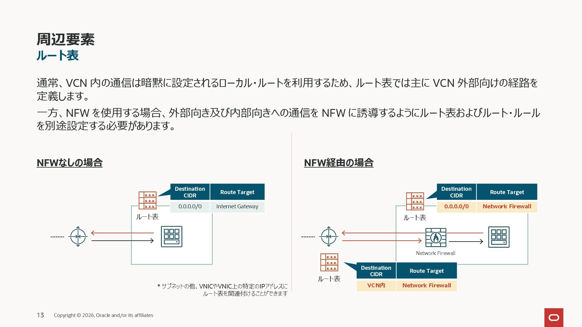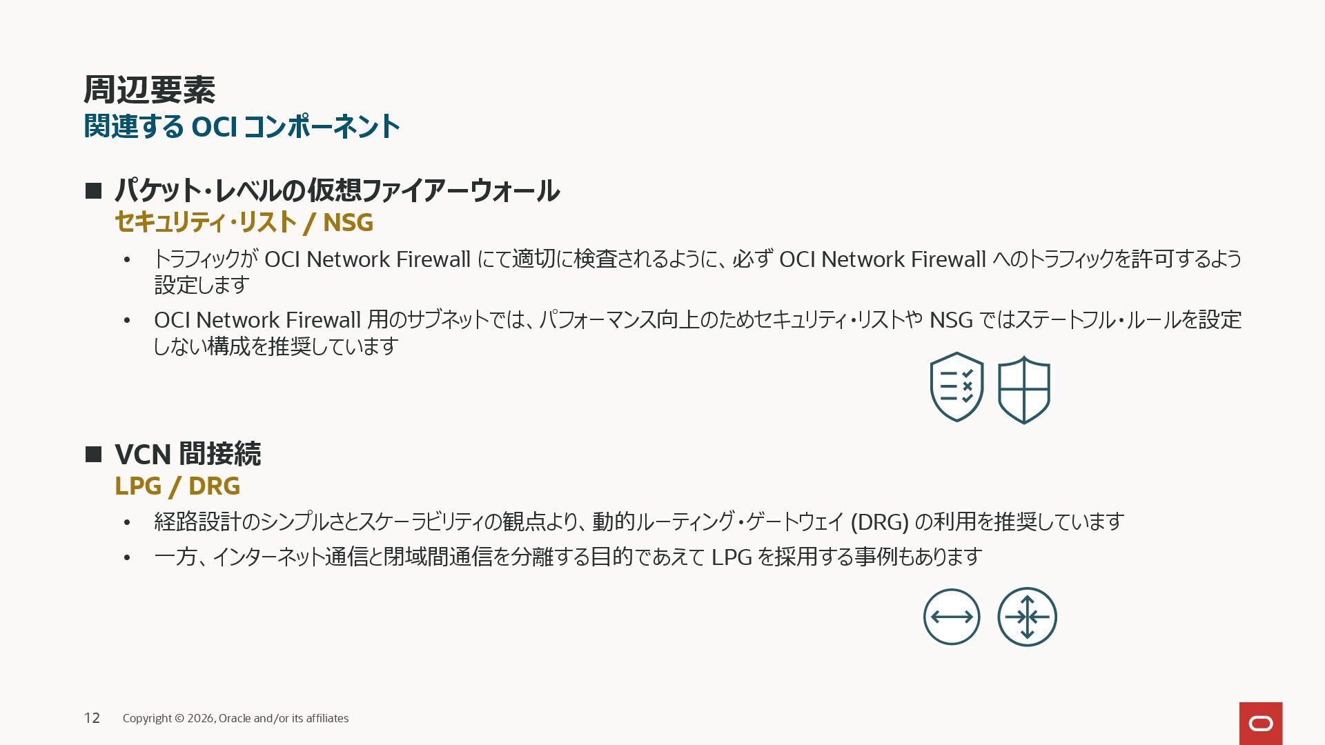 Firewall にて適切に検査されるように、必ず OCI Network Firewall へのトラフィックを許可するよう 設定します • OCI Network Firewall 用のサブネットでは、パフォーマンス向上のためセキュリティ・リストや NSG ではステートフル・ルールを設定 しない構成を推奨しています ◼ VCN 間接続 LPG / DRG • 経路設計のシンプルさとスケーラビリティの観点より、動的ルーティング・ゲートウェイ (DRG) の利用を推奨しています • 一方、インターネット通信と閉域間通信を分離する目的であえて LPG を採用する事例もあります 12 Copyright © 2026, Oracle and/or its affiliates 関連する OCI コンポーネント