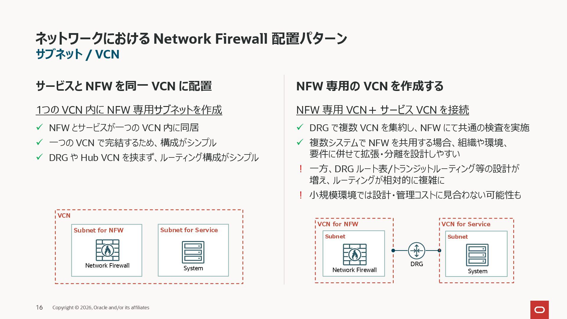 VCN 内に NFW 専用サブネットを作成 ✓ NFW とサービスが一つの VCN 内に同居 ✓ 一つの VCN で完結するため、構成がシンプル ✓ DRG や Hub VCN を挟まず、ルーティング構成がシンプル NFW 専用の VCN を作成する NFW 専用 VCN+ サービス VCN を接続 ✓ DRG で複数 VCN を集約し、NFW にて共通の検査を実施 ✓ 複数システムで NFW を共用する場合、組織や環境、 要件に併せて拡張・分離を設計しやすい ︕ 一方、DRG ルート表/トランジットルーティング等の設計が 増え、ルーティングが相対的に複雑に ︕ 小規模環境では設計・管理コストに見合わない可能性も 16 Copyright © 2026, Oracle and/or its affiliates サブネット / VCN Subnet for NFW Network Firewall VCN Subnet for Service System Subnet VCN for NFW Network Firewall VCN for Service DRG Subnet System