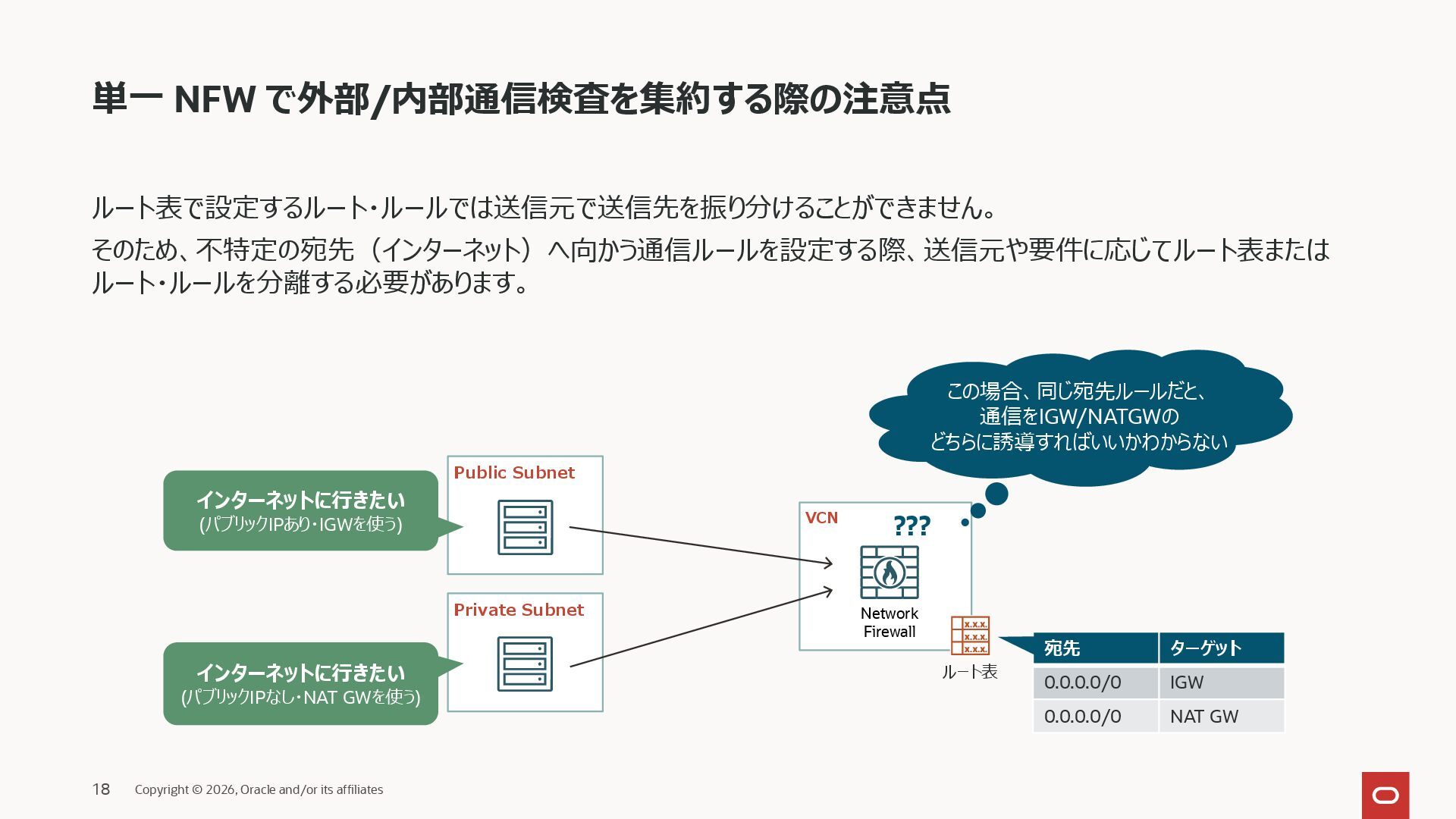 Oracle and/or its affiliates VCN Network Firewall 宛先 ターゲット 0.0.0.0/0 IGW 0.0.0.0/0 NAT GW Public Subnet Private Subnet インターネットに行きたい (パブリックIPあり・IGWを使う) インターネットに行きたい (パブリックIPなし・NAT GWを使う) ルート表 この場合、同じ宛先ルールだと、 通信をIGW/NATGWの どちらに誘導すればいいかわからない ???
