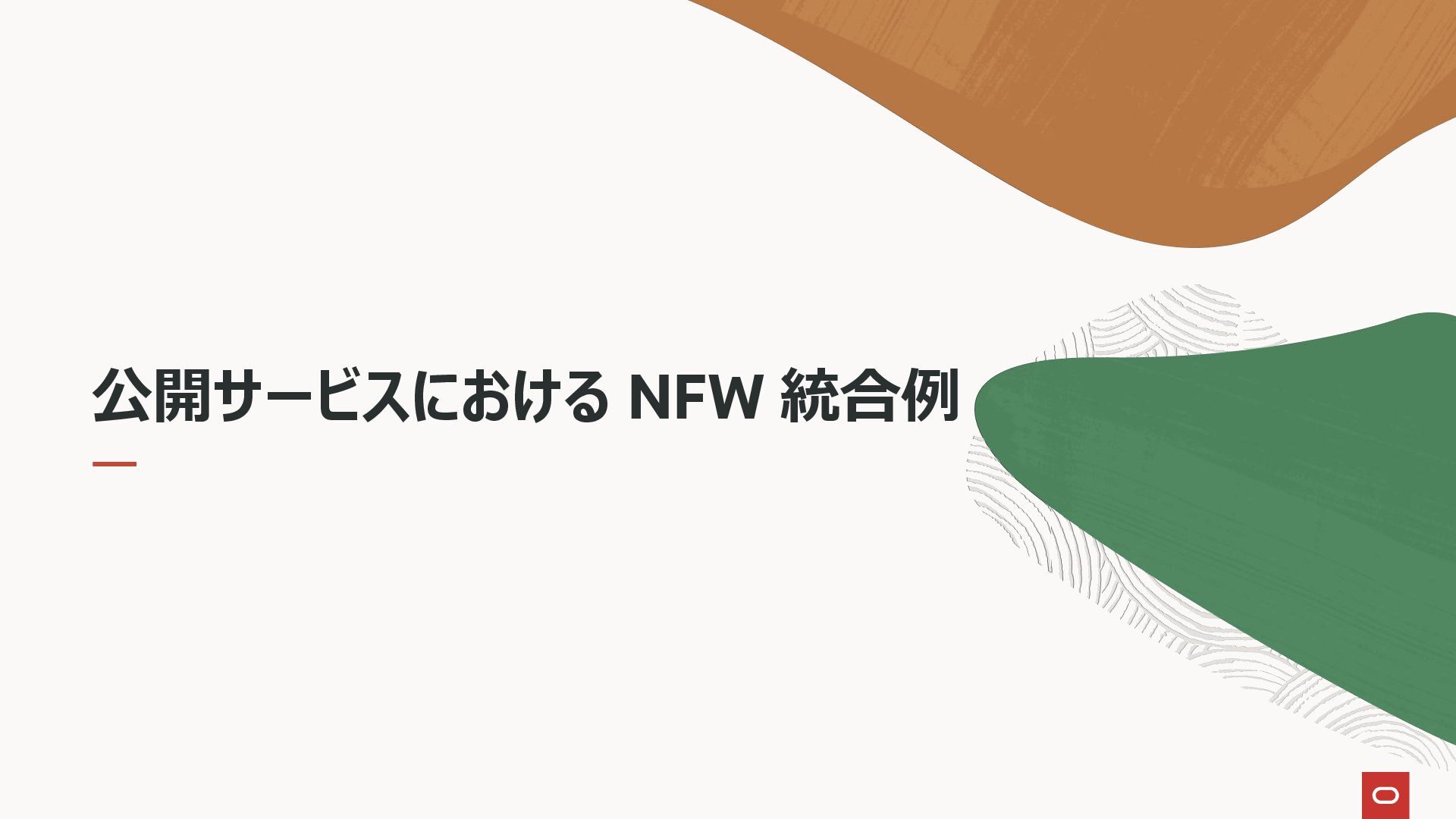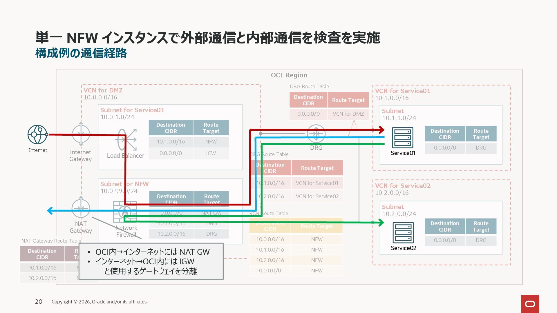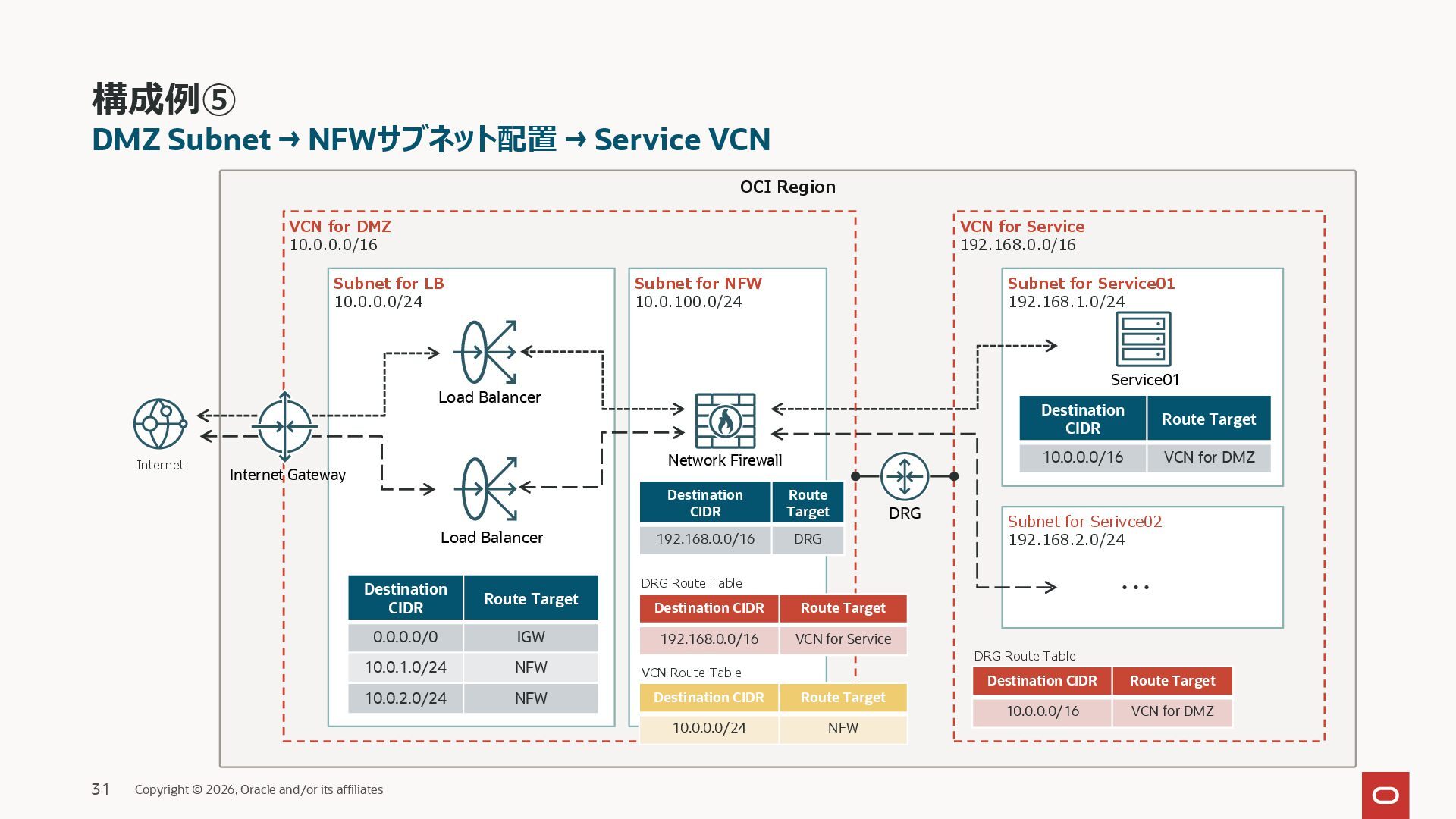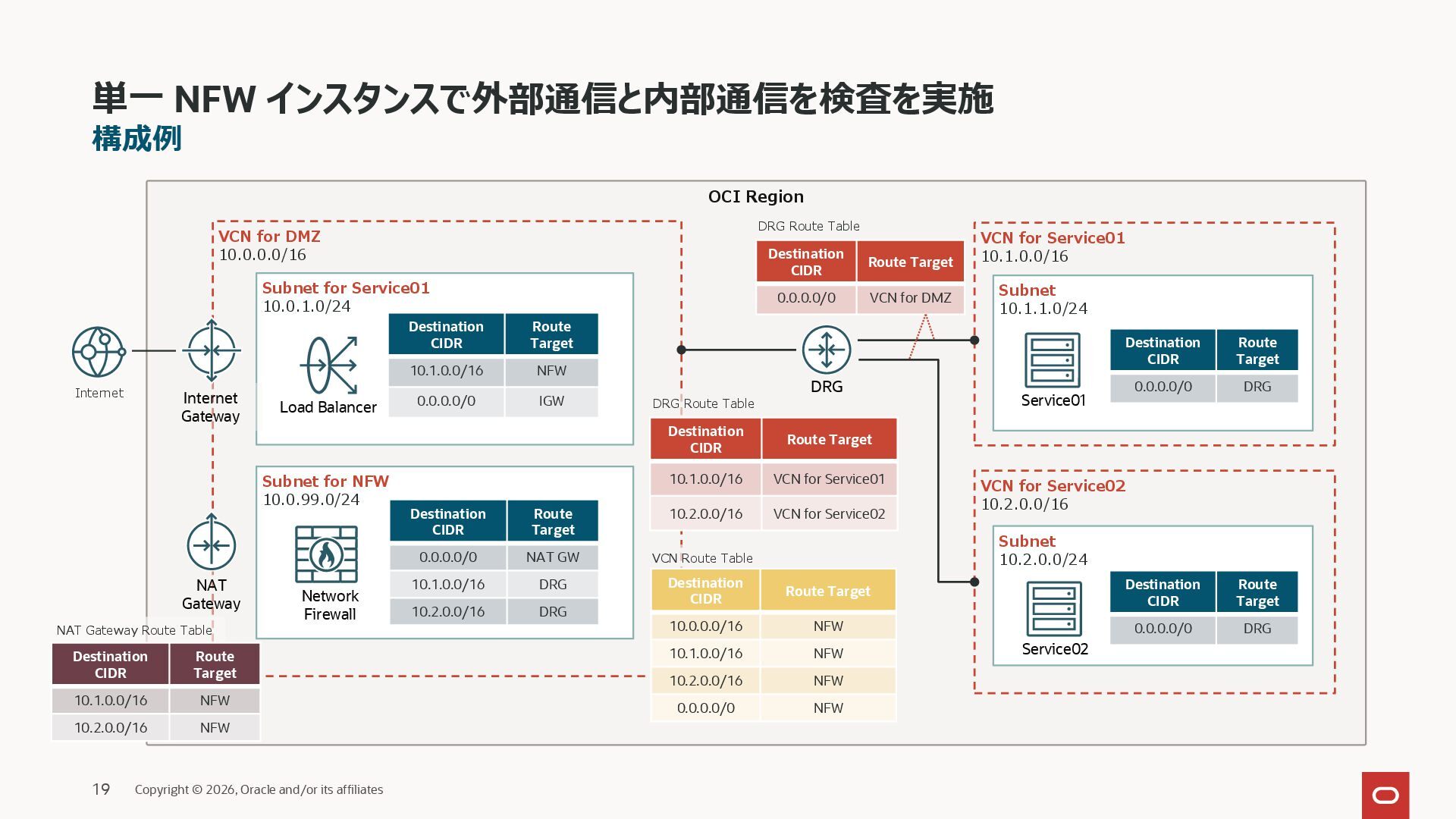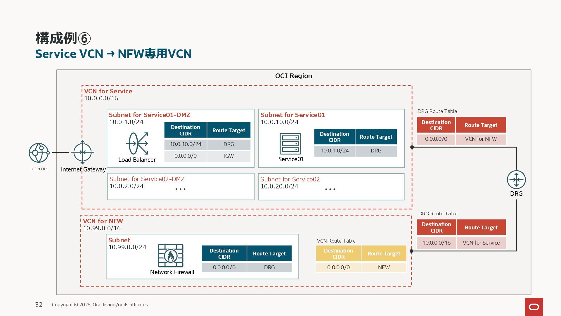 and/or its affiliates NFW専用VCN → Service VCN OCI Region Subnet 10.1.100.0/24 Load Balancer VCN for Service01 10.1.0.0/16 Subnet 10.0.99.0/24 Network Firewall Destination CIDR Route Target 0.0.0.0/0 DRG Destination CIDR Route Target 0.0.0.0/0 VCN for NFW DRG Route Table Destination CIDR Route Target 0.0.0.0/0 DRG Subnet 10.1.1.0/24 Service01 Destination CIDR Route Target 10.1.0.0/24 VCN for Service01 … On-Premise/Other OCI DRG Route Table ・・・ VCN for Service02 10.2.0.0/16 DRG VCN for NFW 10.99.0.0/16 CPE DRG Destination CIDR Route Target 10.1.0.0/24 VCN for NFW … … DRG Route Table Destination CIDR Route Target 0.0.0.0/0 NFW VCN Route Table