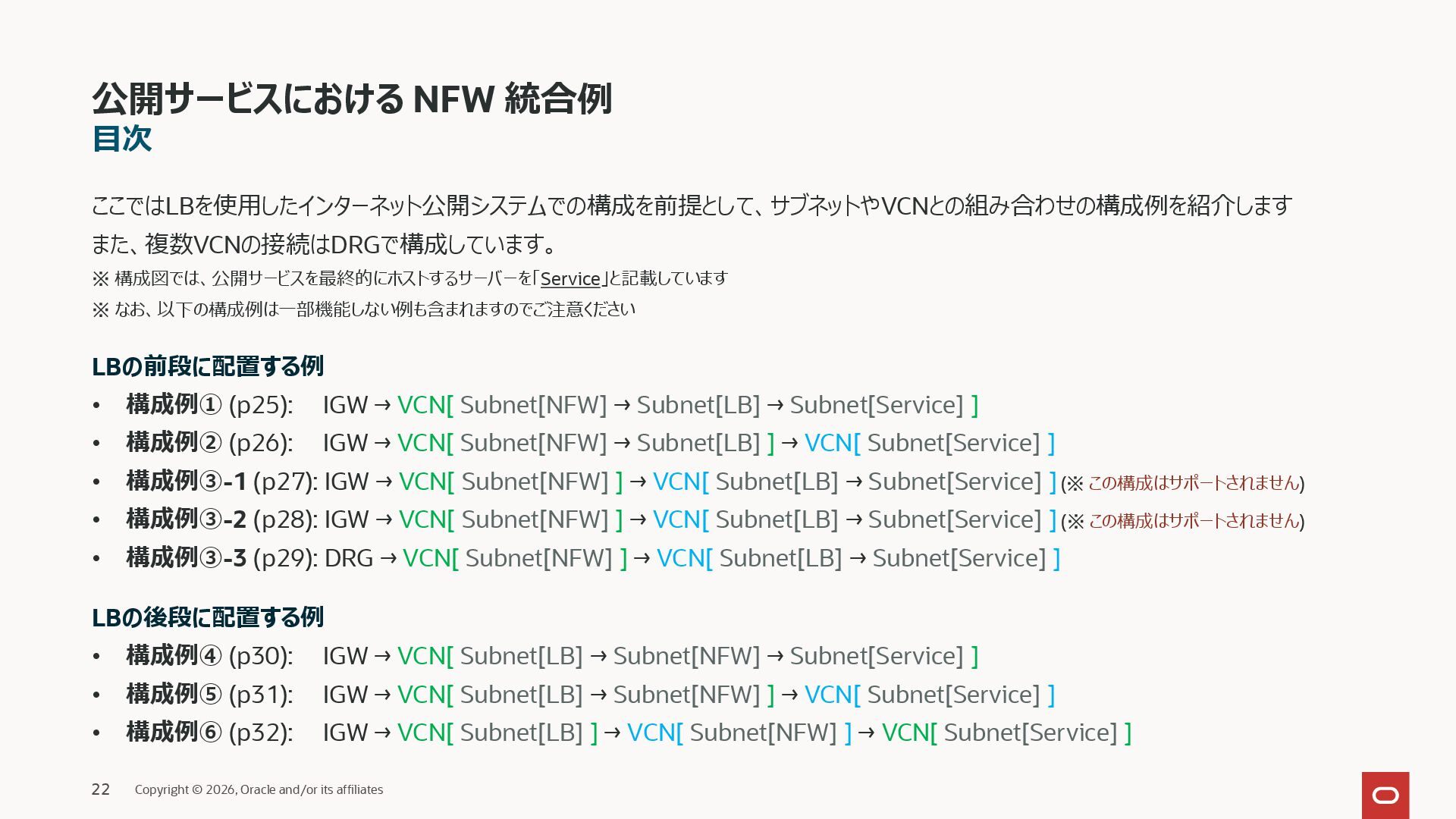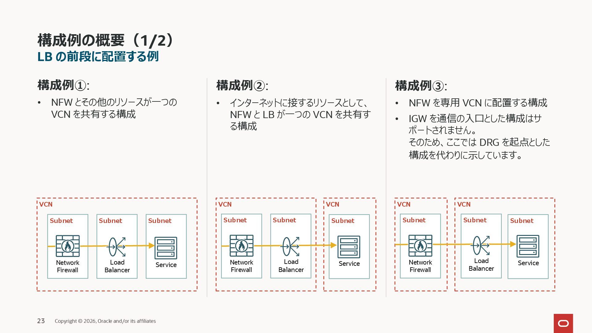 • 構成例① (p25): IGW → VCN[ Subnet[NFW] → Subnet[LB] → Subnet[Service] ] • 構成例② (p26): IGW → VCN[ Subnet[NFW] → Subnet[LB] ] → VCN[ Subnet[Service] ] • 構成例③-1 (p27): IGW → VCN[ Subnet[NFW] ] → VCN[ Subnet[LB] → Subnet[Service] ] (※ この構成はサポートされません) • 構成例③-2 (p28): IGW → VCN[ Subnet[NFW] ] → VCN[ Subnet[LB] → Subnet[Service] ] (※ この構成はサポートされません) • 構成例③-3 (p29): DRG → VCN[ Subnet[NFW] ] → VCN[ Subnet[LB] → Subnet[Service] ] LBの後段に配置する例 • 構成例④ (p30): IGW → VCN[ Subnet[LB] → Subnet[NFW] → Subnet[Service] ] • 構成例⑤ (p31): IGW → VCN[ Subnet[LB] → Subnet[NFW] ] → VCN[ Subnet[Service] ] • 構成例⑥ (p32): IGW → VCN[ Subnet[LB] ] → VCN[ Subnet[NFW] ] → VCN[ Subnet[Service] ] 22 Copyright © 2026, Oracle and/or its affiliates 目次