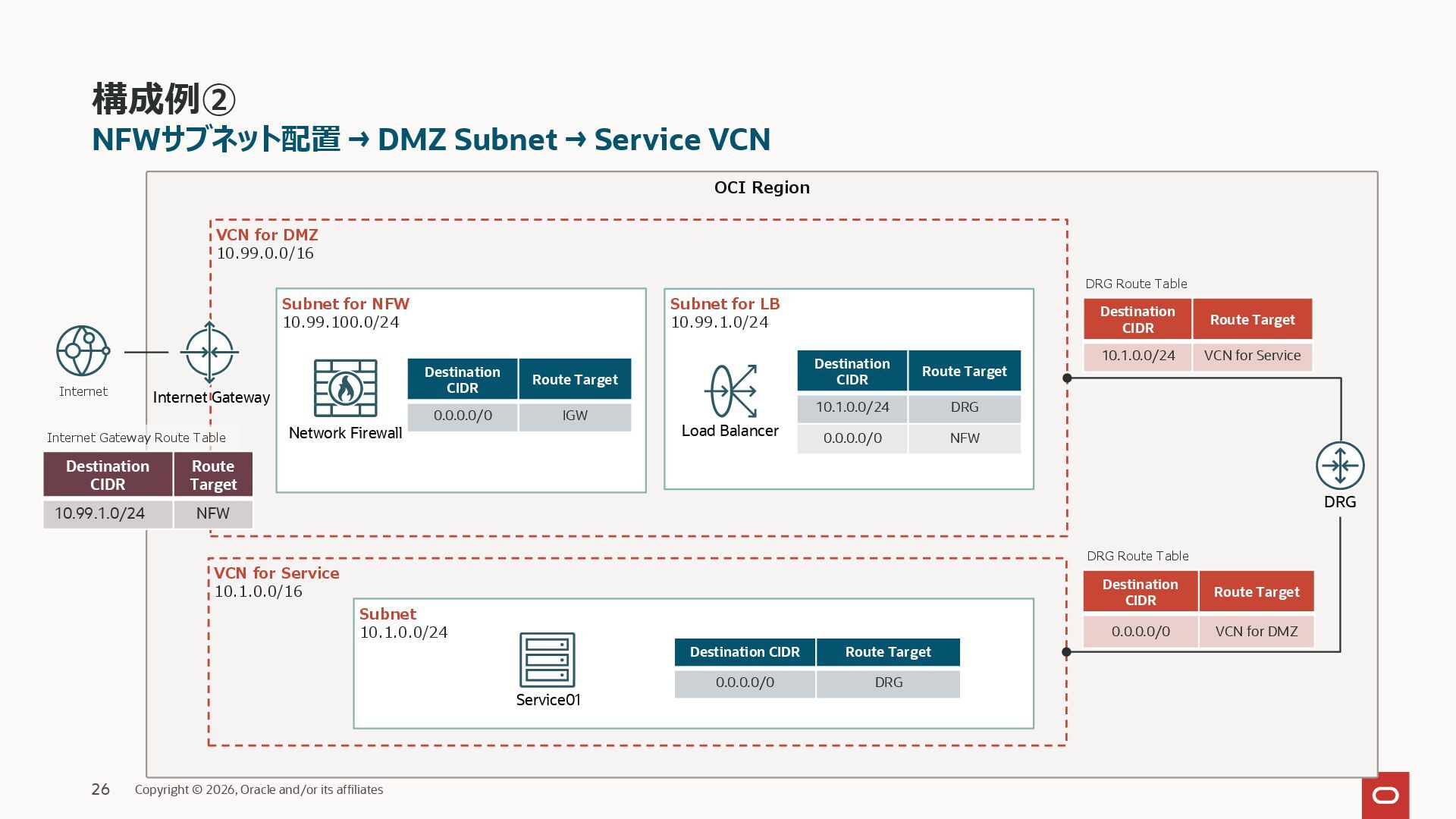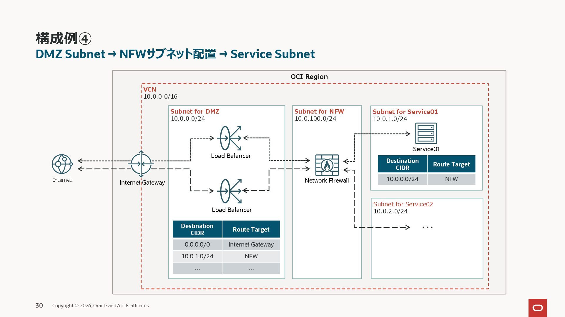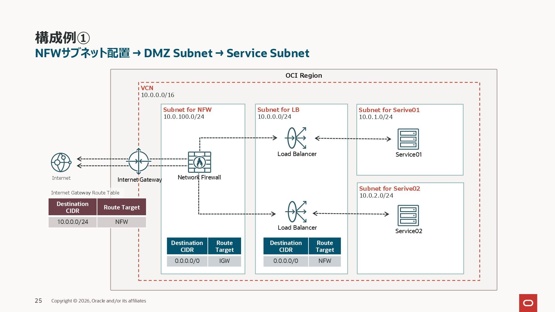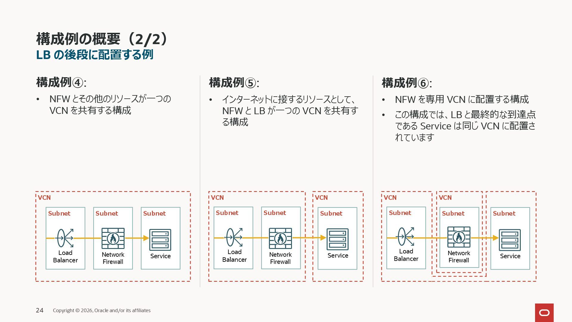 • インターネットに接するリソースとして、 NFW と LB が一つの VCN を共有す る構成 構成例③: • NFW を専用 VCN に配置する構成 • IGW を通信の入口とした構成はサ ポートされません。 そのため、ここでは DRG を起点とした 構成を代わりに示しています。 Copyright © 2026, Oracle and/or its affiliates 23 VCN Subnet Subnet Subnet Service VCN Subnet Subnet Subnet Service VCN VCN Subnet Subnet Subnet Service VCN Network Firewall Load Balancer Load Balancer Network Firewall Load Balancer Network Firewall
