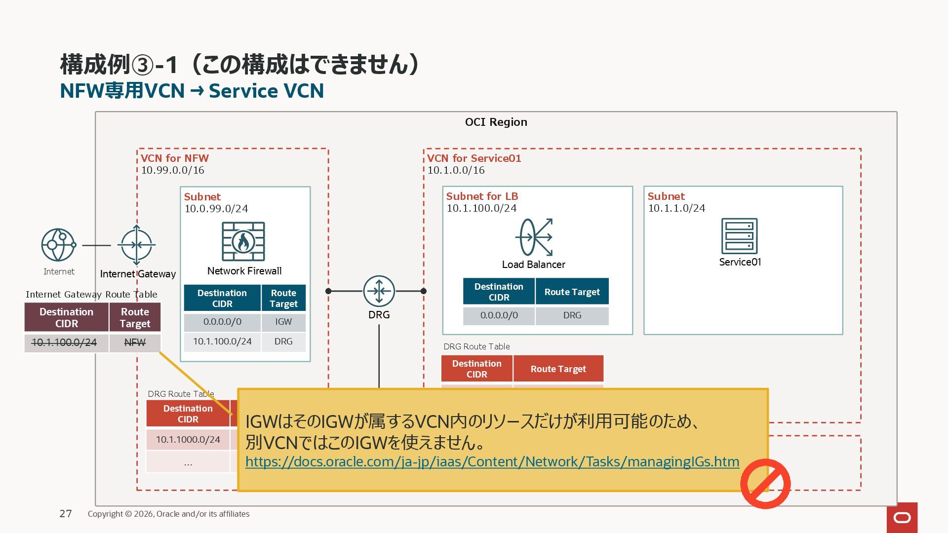 → Service VCN OCI Region VCN for NFW 10.99.0.0/16 Subnet for LB 10.1.100.0/24 Load Balancer VCN for Service01 10.1.0.0/16 Subnet 10.0.99.0/24 Network Firewall Internet Gateway Destination CIDR Route Target 0.0.0.0/0 DRG Destination CIDR Route Target 0.0.0.0/0 VCN for NFW DRG Route Table Internet Destination CIDR Route Target 0.0.0.0/0 IGW 10.1.100.0/24 DRG Subnet 10.1.1.0/24 Service01 Destination CIDR Route Target 10.1.1000.0/24 VCN for Service01 … … DRG Route Table ・・・ VCN for Service02 10.2.0.0/16 DRG Destination CIDR Route Target 10.1.100.0/24 NFW Internet Gateway Route Table IGWはそのIGWが属するVCN内のリソースだけが利用可能のため、 別VCNではこのIGWを使えません。 https://docs.oracle.com/ja-jp/iaas/Content/Network/Tasks/managingIGs.htm