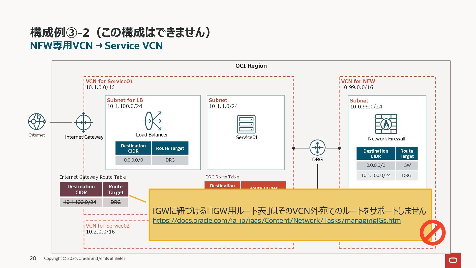 構成例③-1(この構成はできません) 27 Copyright © 2026, Oracle and/or its affiliates NFW専用VCN