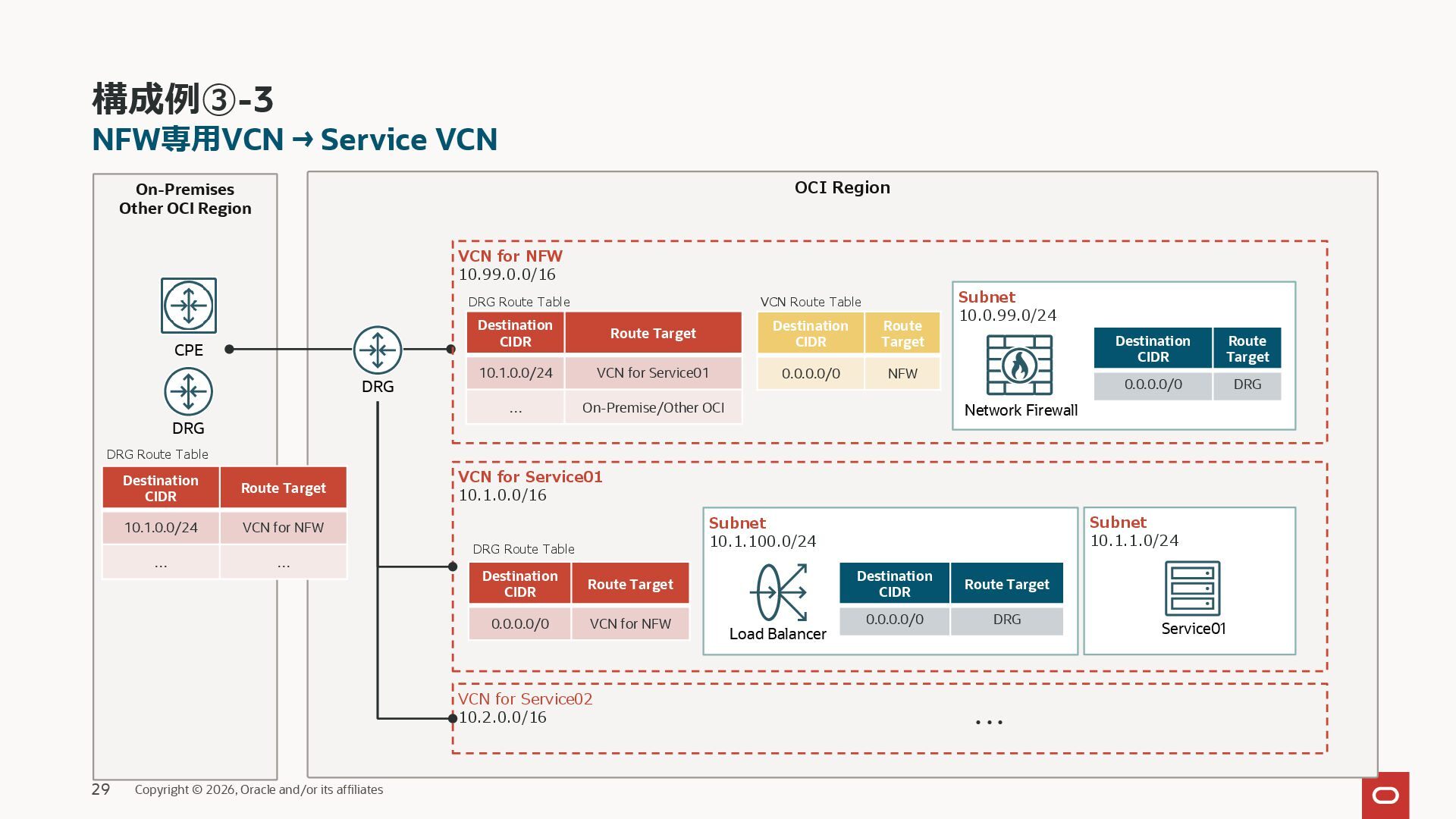 Service VCN OCI Region VCN for NFW 10.99.0.0/16 Subnet for LB 10.1.100.0/24 Load Balancer VCN for Service01 10.1.0.0/16 Subnet 10.0.99.0/24 Network Firewall Internet Gateway Destination CIDR Route Target 0.0.0.0/0 DRG Destination CIDR Route Target 0.0.0.0/0 VCN for NFW DRG Route Table Internet Destination CIDR Route Target 0.0.0.0/0 IGW 10.1.100.0/24 DRG Subnet 10.1.1.0/24 Service01 Destination CIDR Route Target 10.1.1000.0/24 VCN for Service01 … … DRG Route Table ・・・ VCN for Service02 10.2.0.0/16 DRG Destination CIDR Route Target 10.1.100.0/24 DRG Internet Gateway Route Table IGWに紐づける「IGW用ルート表」はそのVCN外宛てのルートをサポートしません https://docs.oracle.com/ja-jp/iaas/Content/Network/Tasks/managingIGs.htm 28