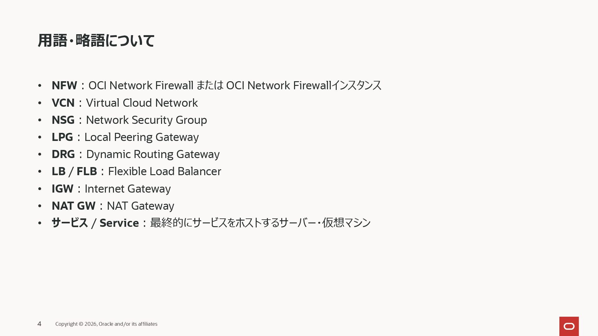 用語・略語について • NFW:OCI Network Firewall または OCI Network Firewallインスタンス •