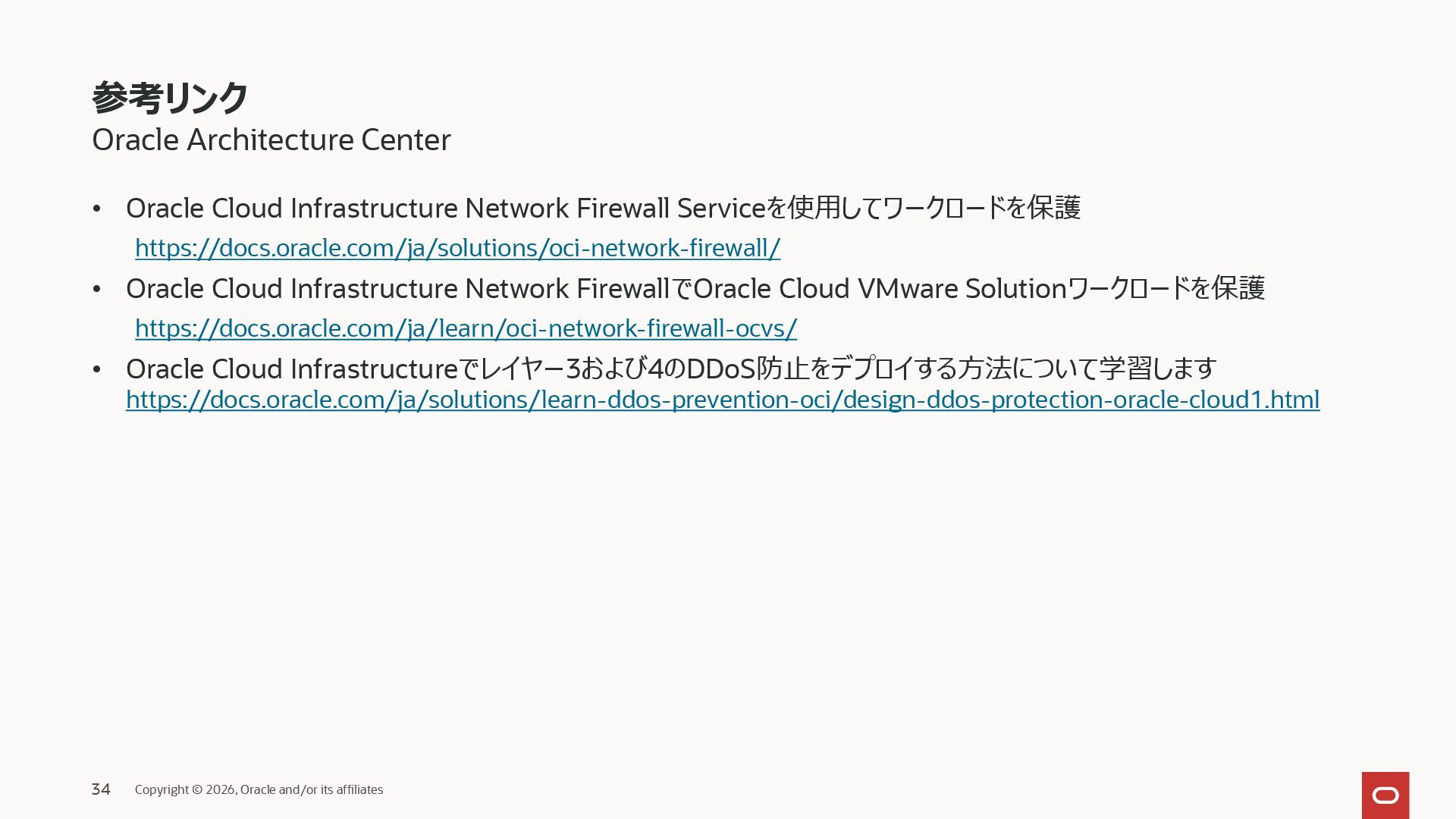 Oracle Cloud Infrastructure Network FirewallでOracle Cloud VMware Solutionワークロードを保護 https://docs.oracle.com/ja/learn/oci-network-firewall-ocvs/ • Oracle Cloud Infrastructureでレイヤー3および4のDDoS防止をデプロイする方法について学習します https://docs.oracle.com/ja/solutions/learn-ddos-prevention-oci/design-ddos-protection-oracle-cloud1.html 34 Copyright © 2026, Oracle and/or its affiliates Oracle Architecture Center