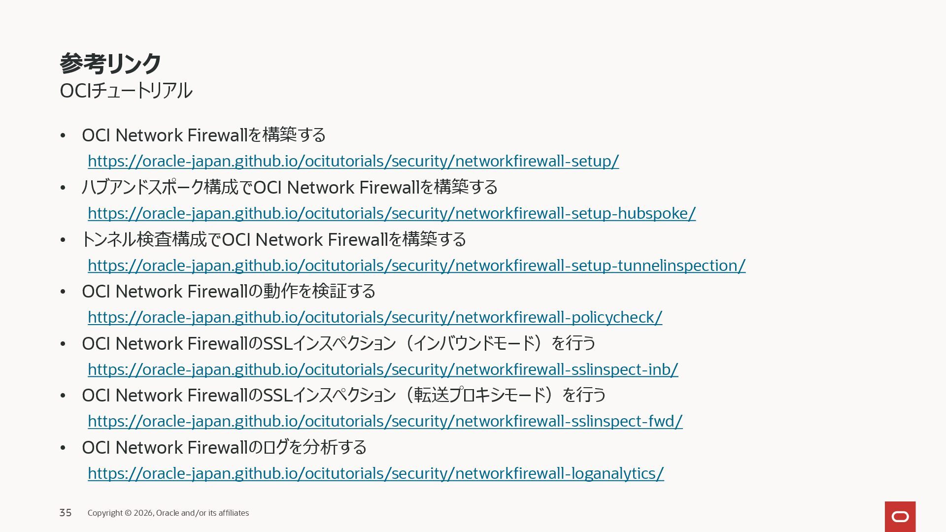 https://oracle-japan.github.io/ocitutorials/security/networkfirewall-setup-hubspoke/ • トンネル検査構成でOCI Network Firewallを構築する https://oracle-japan.github.io/ocitutorials/security/networkfirewall-setup-tunnelinspection/ • OCI Network Firewallの動作を検証する https://oracle-japan.github.io/ocitutorials/security/networkfirewall-policycheck/ • OCI Network FirewallのSSLインスペクション(インバウンドモード)を行う https://oracle-japan.github.io/ocitutorials/security/networkfirewall-sslinspect-inb/ • OCI Network FirewallのSSLインスペクション(転送プロキシモード)を行う https://oracle-japan.github.io/ocitutorials/security/networkfirewall-sslinspect-fwd/ • OCI Network Firewallのログを分析する https://oracle-japan.github.io/ocitutorials/security/networkfirewall-loganalytics/ 35 Copyright © 2026, Oracle and/or its affiliates OCIチュートリアル
