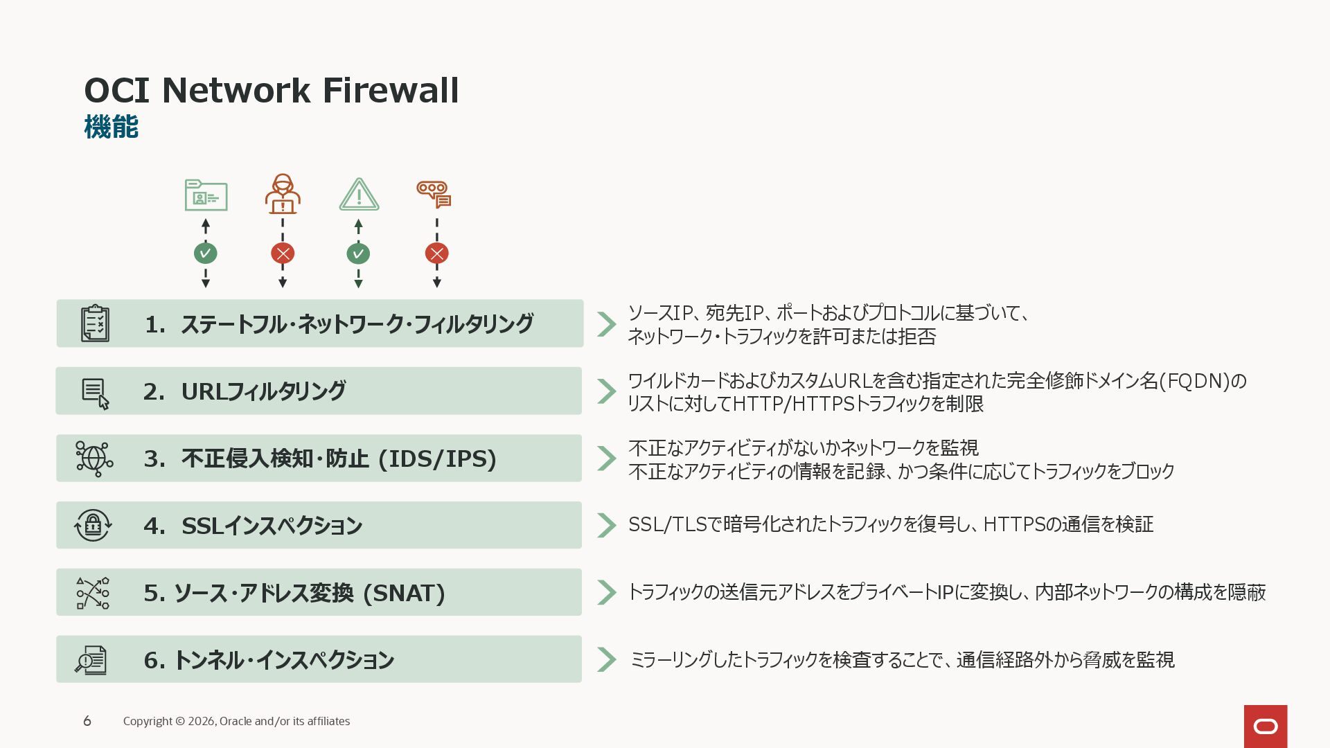 Oracle and/or its affiliates ソースIP、宛先IP、ポートおよびプロトコルに基づいて、 ネットワーク・トラフィックを許可または拒否 ワイルドカードおよびカスタムURLを含む指定された完全修飾ドメイン名(FQDN)の リストに対してHTTP/HTTPSトラフィックを制限 不正なアクティビティがないかネットワークを監視 不正なアクティビティの情報を記録、かつ条件に応じてトラフィックをブロック SSL/TLSで暗号化されたトラフィックを復号し、HTTPSの通信を検証 ミラーリングしたトラフィックを検査することで、通信経路外から脅威を監視 5. ソース・アドレス変換 (SNAT) 4. SSLインスペクション 2. URLフィルタリング 3. 不正侵入検知・防止 (IDS/IPS) 1. ステートフル・ネットワーク・フィルタリング ✕ ✓ ✕ ✓ トラフィックの送信元アドレスをプライベートIPに変換し、内部ネットワークの構成を隠蔽