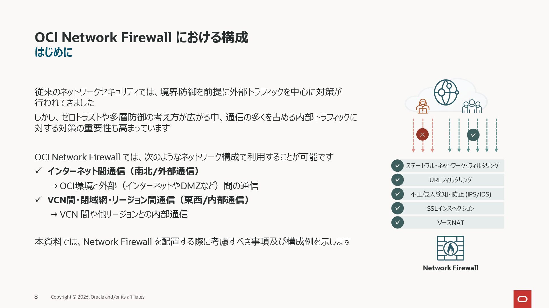 its affiliates はじめに 従来のネットワークセキュリティでは、境界防御を前提に外部トラフィックを中心に対策が 行われてきました しかし、ゼロトラストや多層防御の考え方が広がる中、通信の多くを占める内部トラフィックに 対する対策の重要性も高まっています OCI Network Firewall では、次のようなネットワーク構成で利用することが可能です ✓ インターネット間通信(南北/外部通信) → OCI環境と外部(インターネットやDMZなど)間の通信 ✓ VCN間・閉域網・リージョン間通信(東西/内部通信) → VCN 間や他リージョンとの内部通信 本資料では、Network Firewall を配置する際に考慮すべき事項及び構成例を示します Network Firewall ステートフル・ネットワーク・フィルタリング ✓ URLフィルタリング ✓ 不正侵入検知・防止 (IPS/IDS) ✓ SSLインスペクション ✓ ✕ ソースNAT ✓ ✓