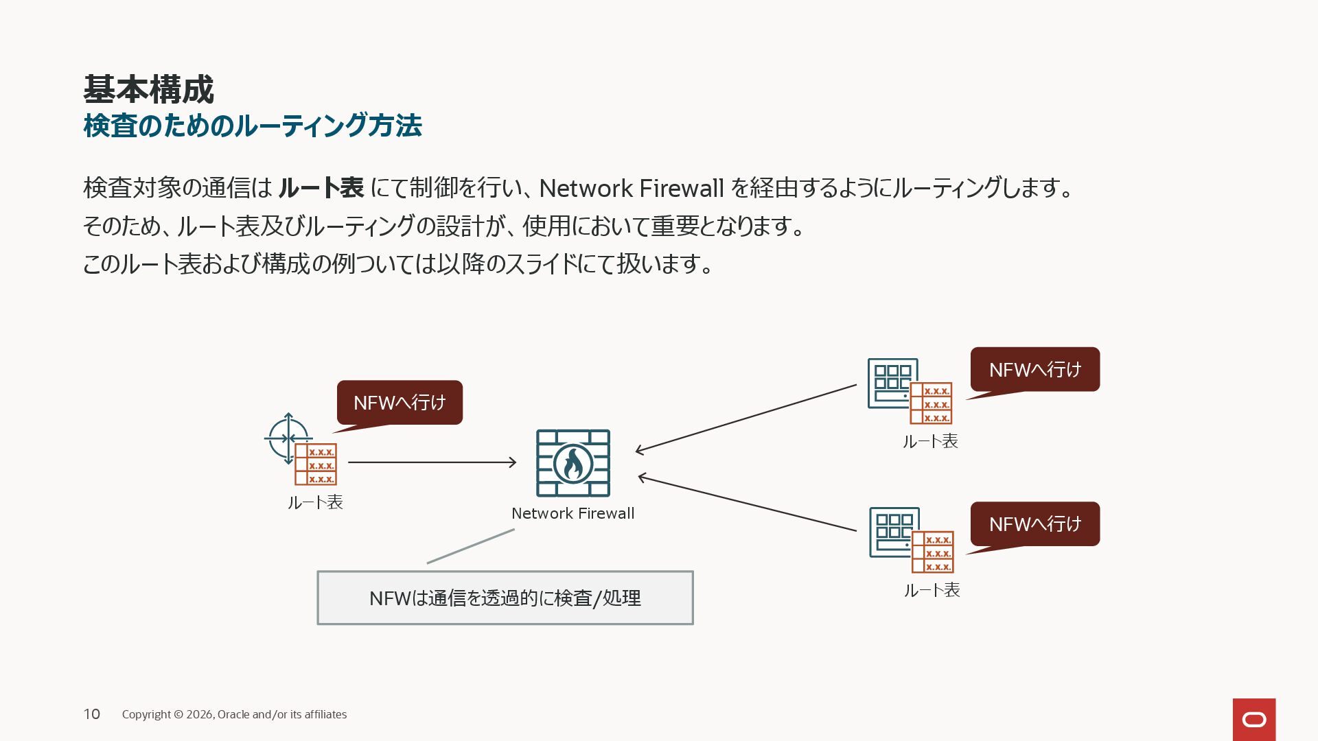 © 2026, Oracle and/or its affiliates 検査のためのルーティング方法 Network Firewall ルート表 NFWへ行け NFWへ行け NFWへ行け ルート表 ルート表 NFWは通信を透過的に検査/処理