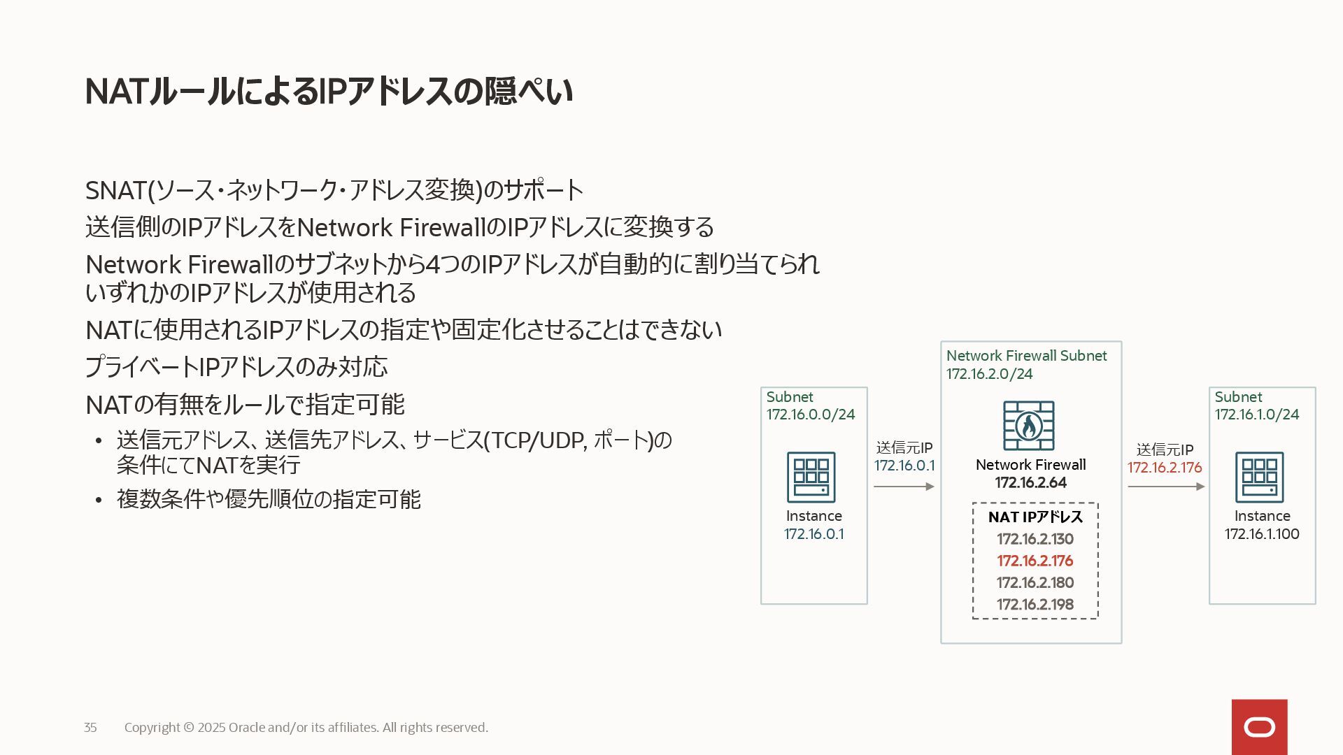 送信元アドレス、送信先アドレス、サービス(TCP/UDP, ポート)の 条件にてNATを実行 • 複数条件や優先順位の指定可能 NATルールによるIPアドレスの隠ぺい Copyright © 2025 Oracle and/or its affiliates. All rights reserved. 35 Network Firewall Subnet 172.16.2.0/24 Network Firewall 172.16.2.64 NAT IPアドレス 172.16.2.130 172.16.2.176 172.16.2.180 172.16.2.198 Subnet 172.16.0.0/24 Instance 172.16.0.1 Subnet 172.16.1.0/24 Instance 172.16.1.100 送信元IP 172.16.0.1 送信元IP 172.16.2.176