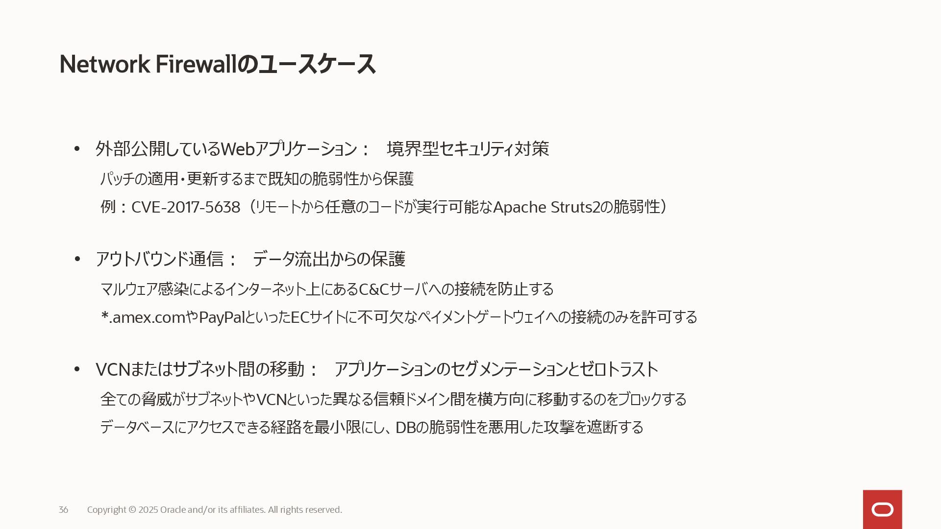 アウトバウンド通信: データ流出からの保護 マルウェア感染によるインターネット上にあるC&Cサーバへの接続を防止する *.amex.comやPayPalといったECサイトに不可欠なペイメントゲートウェイへの接続のみを許可する • VCNまたはサブネット間の移動: アプリケーションのセグメンテーションとゼロトラスト 全ての脅威がサブネットやVCNといった異なる信頼ドメイン間を横方向に移動するのをブロックする データベースにアクセスできる経路を最小限にし、DBの脆弱性を悪用した攻撃を遮断する Copyright © 2025 Oracle and/or its affiliates. All rights reserved.