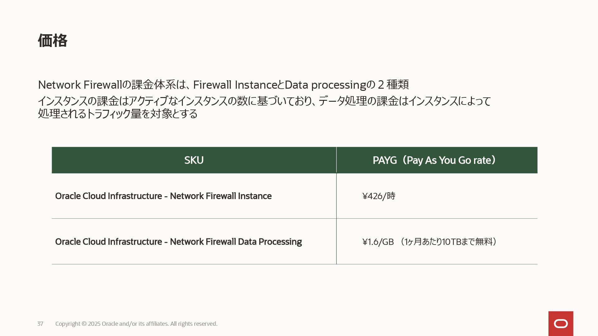 2025 Oracle and/or its affiliates. All rights reserved. SKU PAYG(Pay As You Go rate) Oracle Cloud Infrastructure - Network Firewall Instance ¥426/時 Oracle Cloud Infrastructure - Network Firewall Data Processing ¥1.6/GB (1ヶ月あたり10TBまで無料)