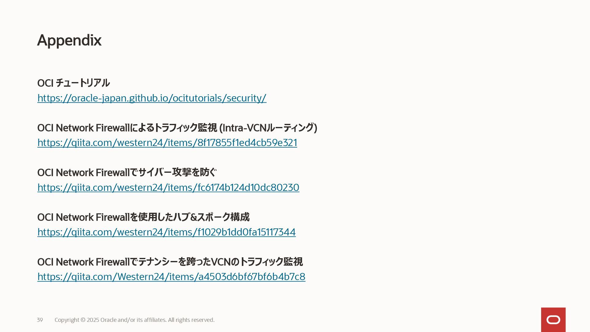 Firewallでサイバー攻撃を防ぐ https://qiita.com/western24/items/fc6174b124d10dc80230 OCI Network Firewallを使用したハブ&スポーク構成 https://qiita.com/western24/items/f1029b1dd0fa15117344 OCI Network Firewallでテナンシーを跨ったVCNのトラフィック監視 https://qiita.com/Western24/items/a4503d6bf67bf6b4b7c8 Appendix Copyright © 2025 Oracle and/or its affiliates. All rights reserved. 39