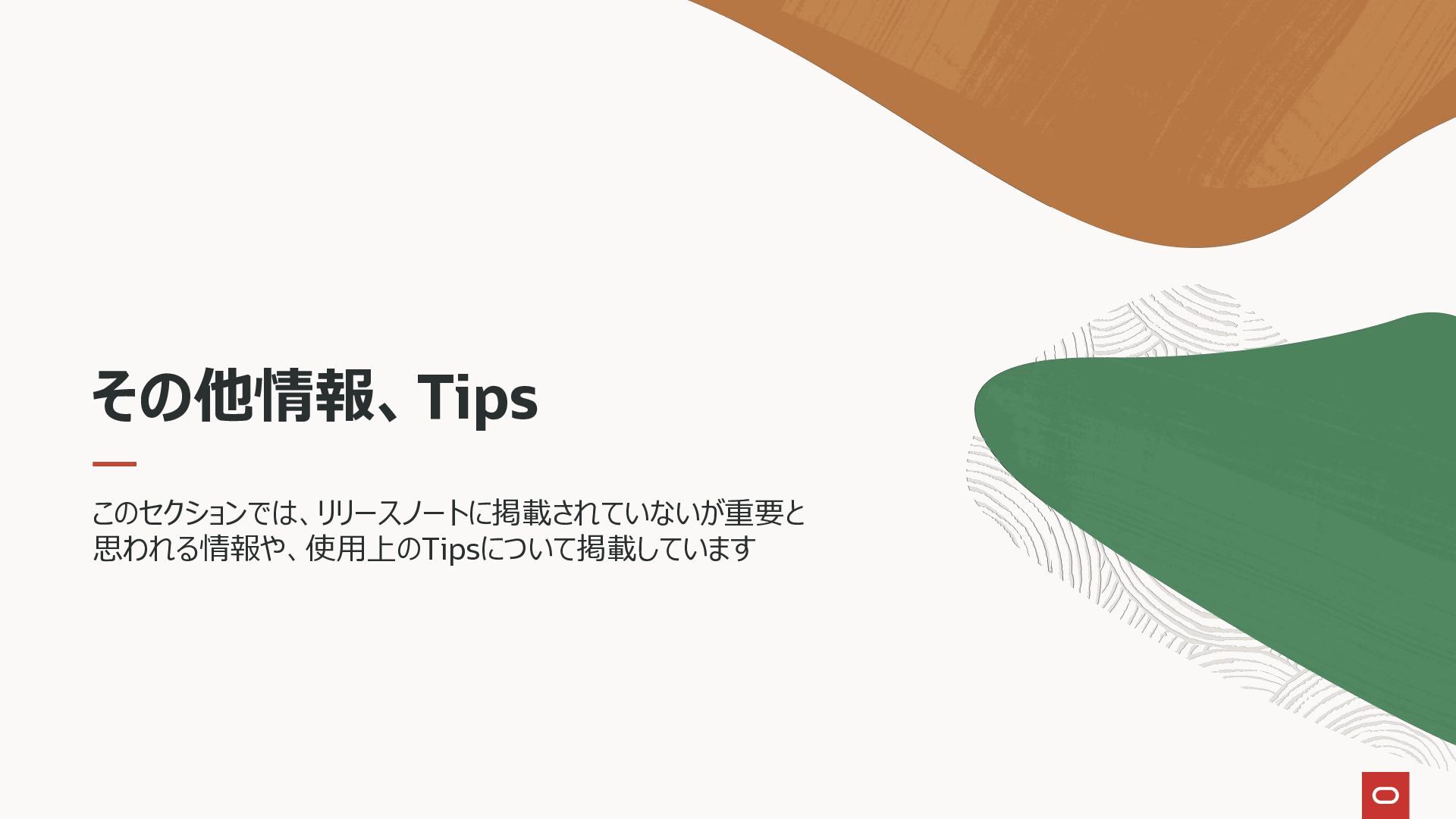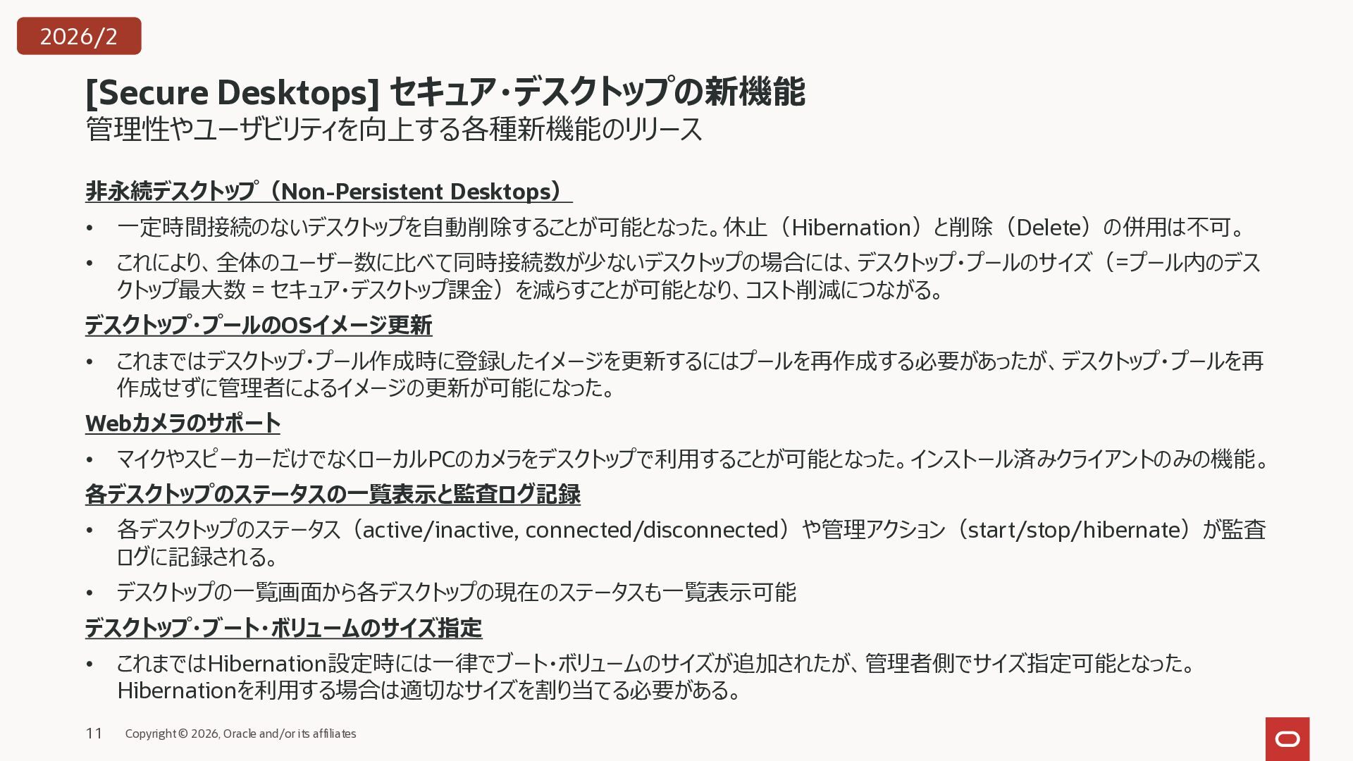 = セキュア・デスクトップ課金)を減らすことが可能となり、コスト削減につながる。 デスクトップ・プールのOSイメージ更新 • これまではデスクトップ・プール作成時に登録したイメージを更新するにはプールを再作成する必要があったが、デスクトップ・プールを再 作成せずに管理者によるイメージの更新が可能になった。 Webカメラのサポート • マイクやスピーカーだけでなくローカルPCのカメラをデスクトップで利用することが可能となった。インストール済みクライアントのみの機能。 各デスクトップのステータスの一覧表示と監査ログ記録 • 各デスクトップのステータス(active/inactive, connected/disconnected)や管理アクション(start/stop/hibernate)が監査 ログに記録される。 • デスクトップの一覧画面から各デスクトップの現在のステータスも一覧表示可能 デスクトップ・ブート・ボリュームのサイズ指定 • これまではHibernation設定時には一律でブート・ボリュームのサイズが追加されたが、管理者側でサイズ指定可能となった。 Hibernationを利用する場合は適切なサイズを割り当てる必要がある。 11 Copyright © 2026, Oracle and/or its affiliates 管理性やユーザビリティを向上する各種新機能のリリース 2026/2