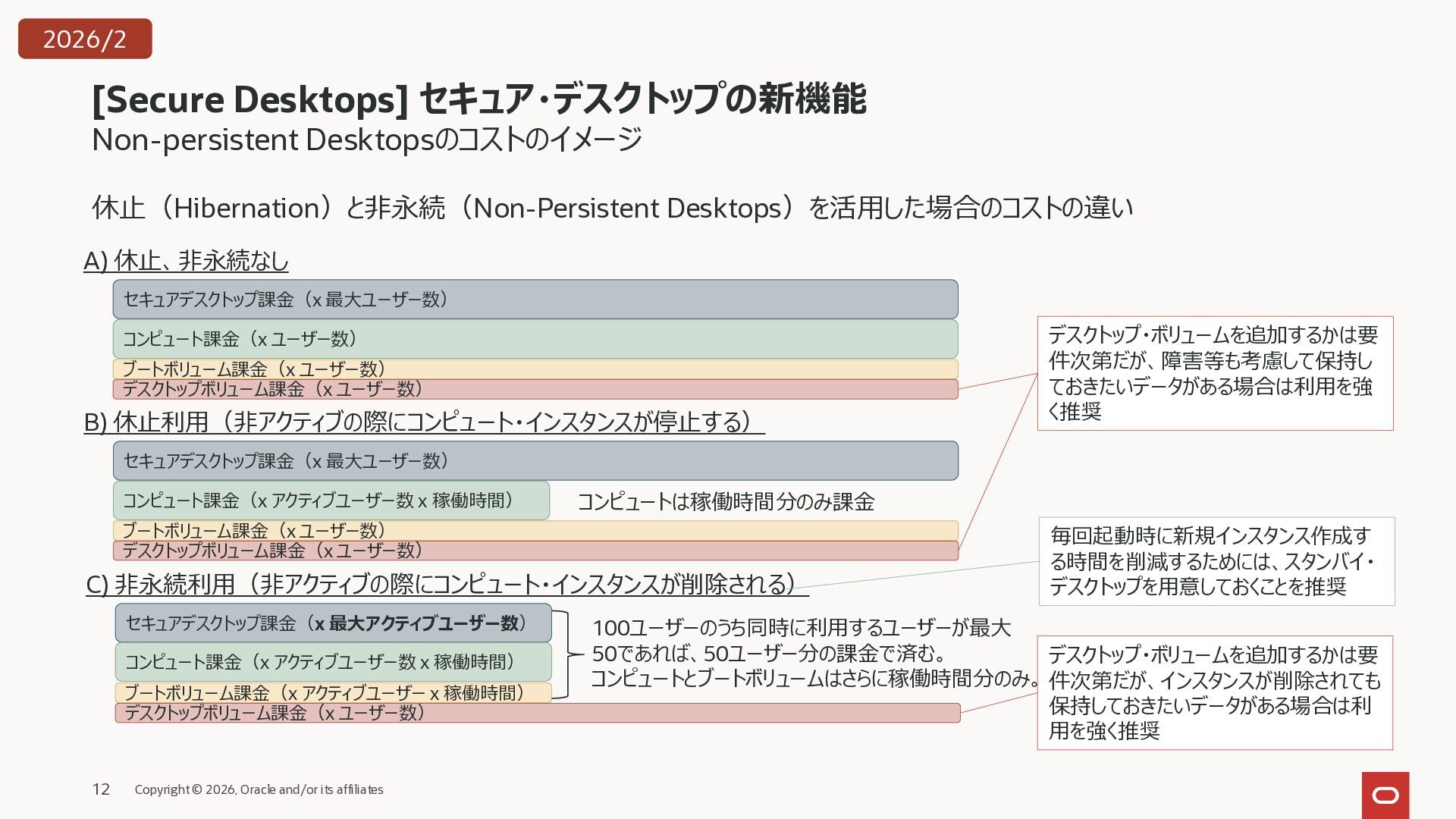 11. [Secure Desktops] セキュア・デスクトップの新機能 休止(Hibernation)と非永続(Non-Persistent Desktops)を活用した場合のコストの違い 12 Copyright © 2026, Oracle