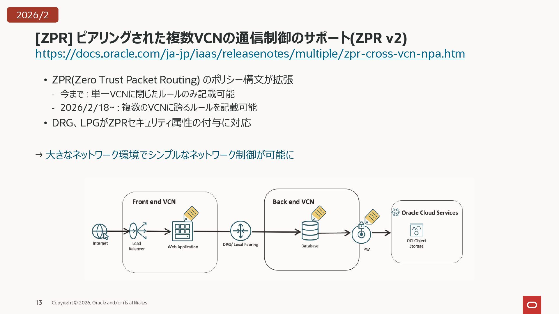 単一VCNに閉じたルールのみ記載可能 - 2026/2/18~ : 複数のVCNに跨るルールを記載可能 • DRG、LPGがZPRセキュリティ属性の付与に対応 → 大きなネットワーク環境でシンプルなネットワーク制御が可能に [ZPR] ピアリングされた複数VCNの通信制御のサポート(ZPR v2) Copyright © 2026, Oracle and/or its affiliates 13 2026/2