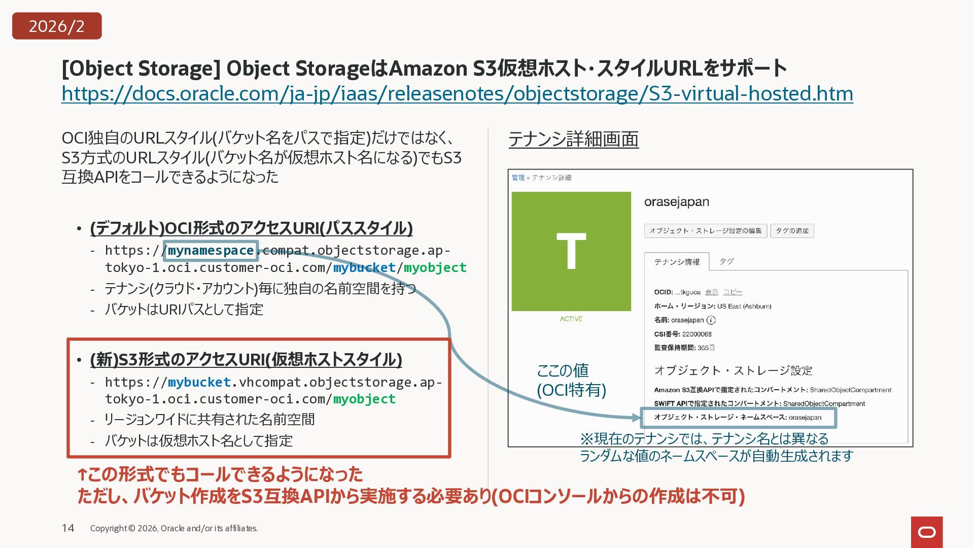 - https://mynamespace.compat.objectstorage.ap- tokyo-1.oci.customer-oci.com/mybucket/myobject - テナンシ(クラウド・アカウント)毎に独自の名前空間を持つ - バケットはURIパスとして指定 • (新)S3形式のアクセスURI(仮想ホストスタイル) - https://mybucket.vhcompat.objectstorage.ap- tokyo-1.oci.customer-oci.com/myobject - リージョンワイドに共有された名前空間 - バケットは仮想ホスト名として指定 テナンシ詳細画面 14 Copyright © 2026, Oracle and/or its affiliates. https://docs.oracle.com/ja-jp/iaas/releasenotes/objectstorage/S3-virtual-hosted.htm ここの値 (OCI特有) ※現在のテナンシでは、テナンシ名とは異なる ランダムな値のネームスペースが自動生成されます ↑この形式でもコールできるようになった ただし、バケット作成をS3互換APIから実施する必要あり(OCIコンソールからの作成は不可) 2026/2