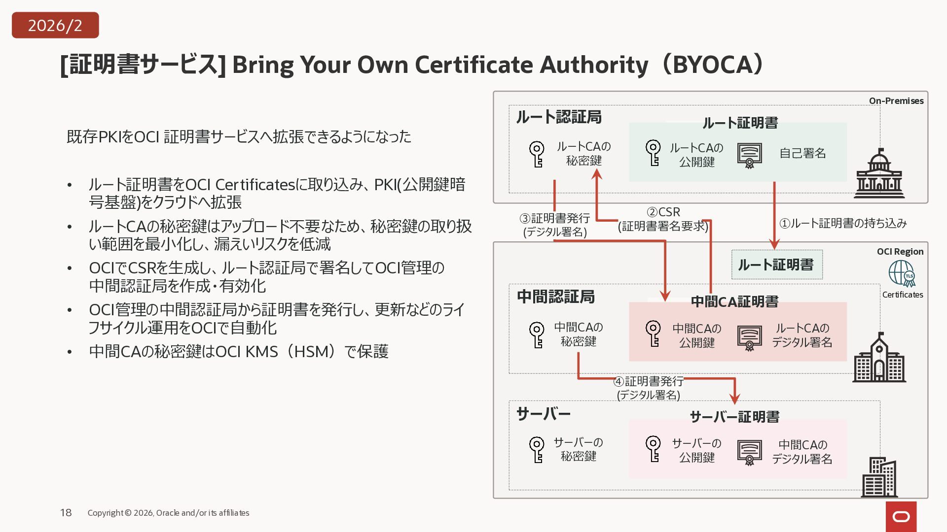 Copyright © 2026, Oracle and/or its affiliates 2026/2 既存PKIをOCI 証明書サービスへ拡張できるようになった • ルート証明書をOCI Certificatesに取り込み、PKI(公開鍵暗 号基盤)をクラウドへ拡張 • ルートCAの秘密鍵はアップロード不要なため、秘密鍵の取り扱 い範囲を最小化し、漏えいリスクを低減 • OCIでCSRを生成し、ルート認証局で署名してOCI管理の 中間認証局を作成・有効化 • OCI管理の中間認証局から証明書を発行し、更新などのライ フサイクル運用をOCIで自動化 • 中間CAの秘密鍵はOCI KMS(HSM)で保護 Certificates ルート認証局 中間認証局 サーバー ルートCAの 秘密鍵 中間CAの 秘密鍵 サーバーの 秘密鍵 ルートCAの 公開鍵 中間CAの 公開鍵 サーバーの 公開鍵 自己署名 ルートCAの デジタル署名 中間CAの デジタル署名 ルート証明書 中間CA証明書 サーバー証明書 ④証明書発行 (デジタル署名) ルート証明書 ③証明書発行 (デジタル署名) ①ルート証明書の持ち込み ②CSR (証明書署名要求)