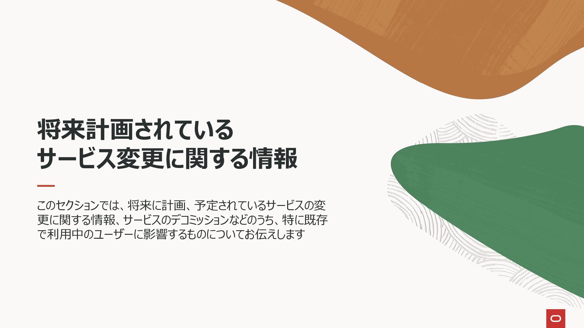 21. https://docs.oracle.com/ja-jp/iaas/Content/Object/Concepts/dedicatedendpoints.htm 発表日 : 2023年10月10日 • セキュリティ強化を目的として、オブジェクト・ストレージの推奨エンドポイントが、他サービスから独立したドメインの専用 エンドポイント *.oci.customer-oci.com に変更 •