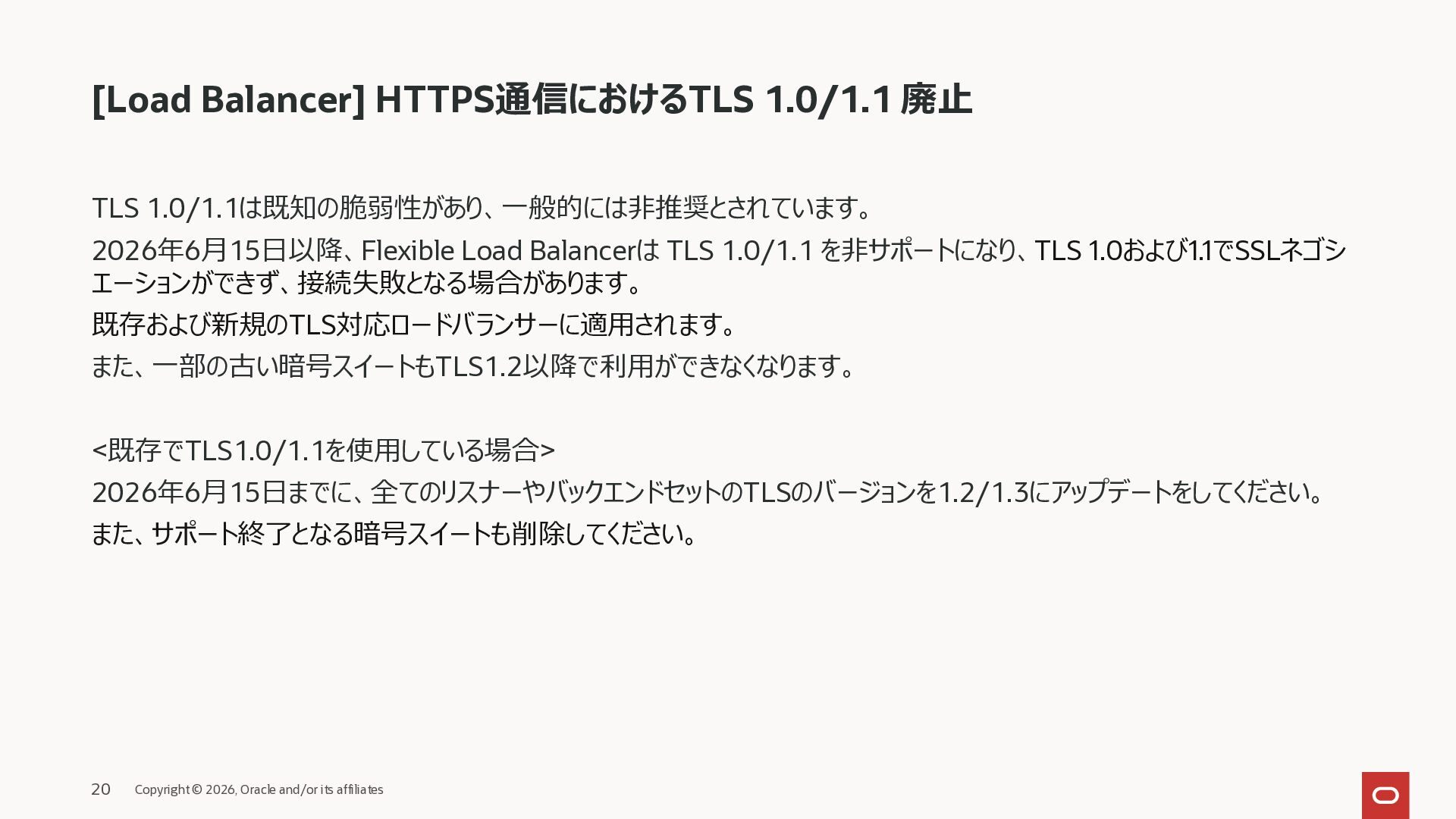 TLS 1.0/1.1 を非サポートになり、TLS 1.0および1.1でSSLネゴシ エーションができず、接続失敗となる場合があります。 既存および新規のTLS対応ロードバランサーに適用されます。 また、一部の古い暗号スイートもTLS1.2以降で利用ができなくなります。 <既存でTLS1.0/1.1を使用している場合> 2026年6月15日までに、全てのリスナーやバックエンドセットのTLSのバージョンを1.2/1.3にアップデートをしてください。 また、サポート終了となる暗号スイートも削除してください。 20 Copyright © 2026, Oracle and/or its affiliates