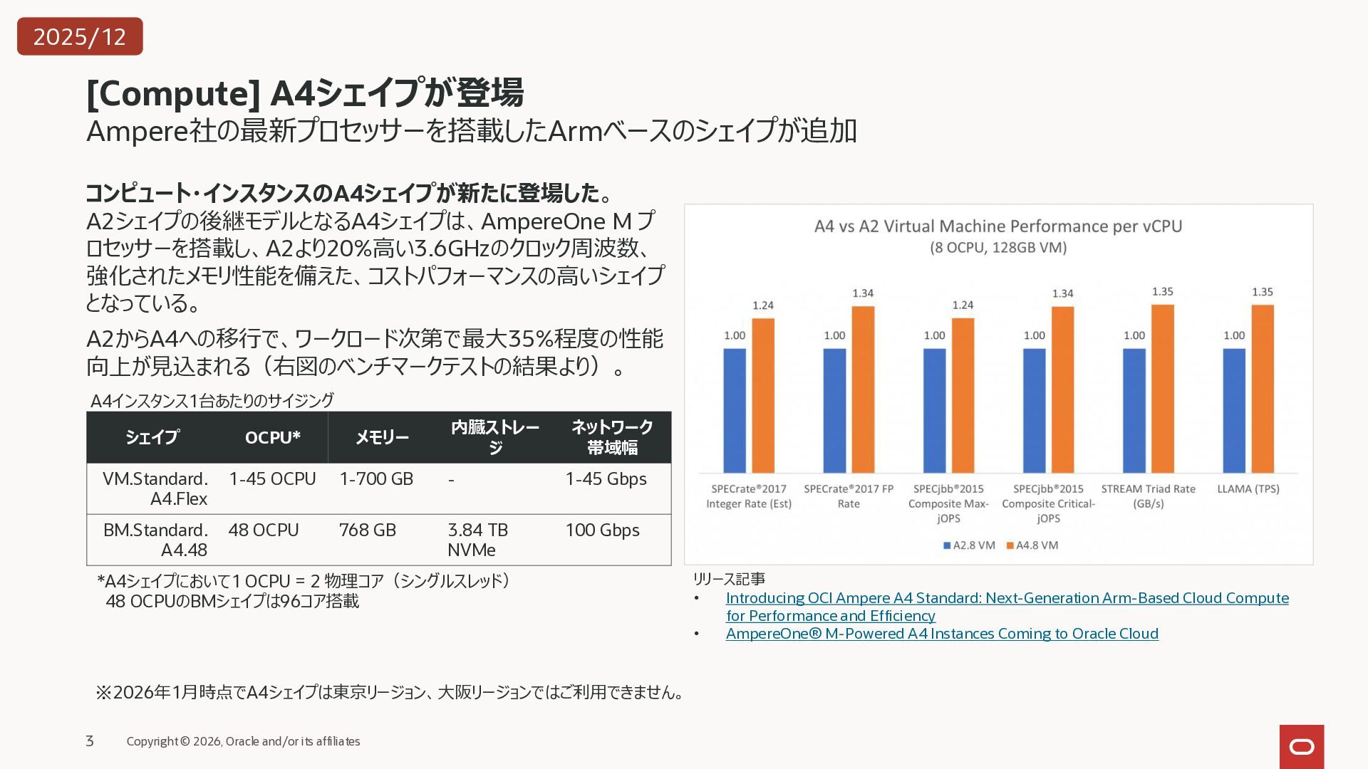 Ampere社の最新プロセッサーを搭載したArmベースのシェイプが追加 2025/12 コンピュート・インスタンスのA4シェイプが新たに登場した。 A2シェイプの後継モデルとなるA4シェイプは、AmpereOne M プ ロセッサーを搭載し、A2より20%高い3.6GHzのクロック周波数、 強化されたメモリ性能を備えた、コストパフォーマンスの高いシェイプ となっている。 A2からA4への移行で、ワークロード次第で最大35%程度の性能 向上が見込まれる(右図のベンチマークテストの結果より)。 リリース記事 • Introducing OCI Ampere A4 Standard: Next-Generation Arm-Based Cloud Compute for Performance and Efficiency • AmpereOne® M-Powered A4 Instances Coming to Oracle Cloud シェイプ OCPU* メモリー 内臓ストレー ジ ネットワーク 帯域幅 VM.Standard. A4.Flex 1-45 OCPU 1-700 GB - 1-45 Gbps BM.Standard. A4.48 48 OCPU 768 GB 3.84 TB NVMe 100 Gbps *A4シェイプにおいて1 OCPU = 2 物理コア(シングルスレッド) 48 OCPUのBMシェイプは96コア搭載 A4インスタンス1台あたりのサイジング ※2026年1月時点でA4シェイプは東京リージョン、大阪リージョンではご利用できません。