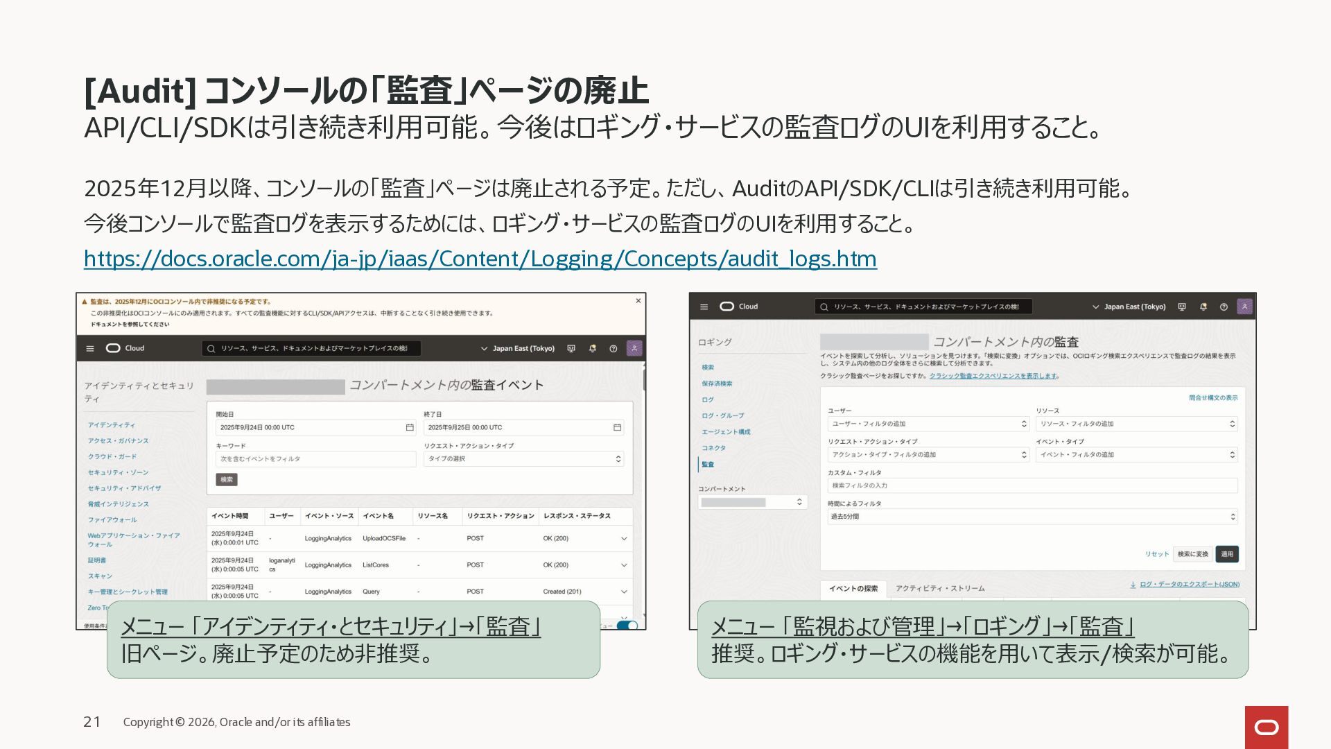 18. [Audit] コンソールの「監査」ページの廃止 2025年12月以降、コンソールの「監査」ページは廃止される予定。ただし、AuditのAPI/SDK/CLIは引き続き利用可能。 今後コンソールで監査ログを表示するためには、ロギング・サービスの監査ログのUIを利用すること。 https://docs.oracle.com/ja-jp/iaas/Content/Logging/Concepts/audit_logs.htm 21 Copyright © 2026, Oracle