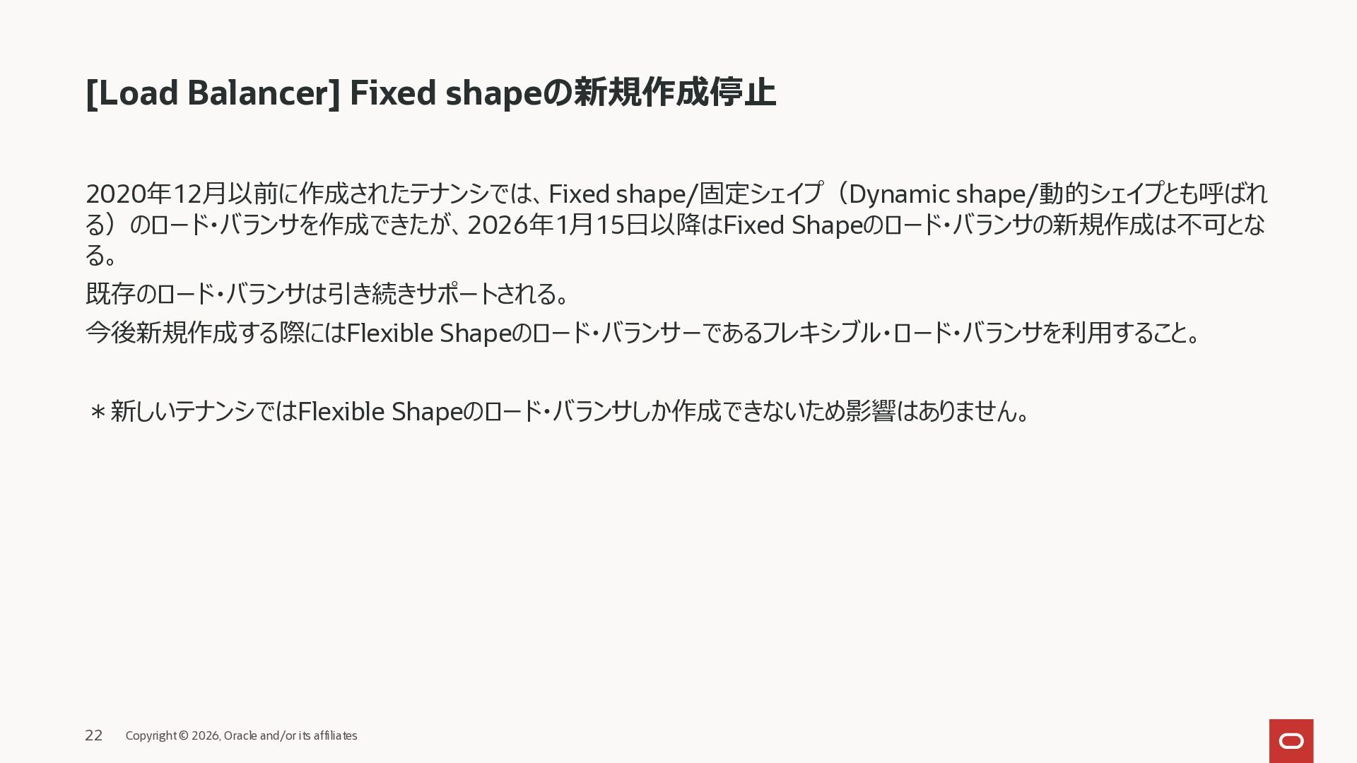 19. [Load Balancer] Fixed shapeの新規作成停止 2020年12月以前に作成されたテナンシでは、Fixed shape/固定シェイプ(Dynamic shape/動的シェイプとも呼ばれ る)のロード・バランサを作成できたが、2026年1月15日以降はFixed Shapeのロード・バランサの新規作成は不可とな る。