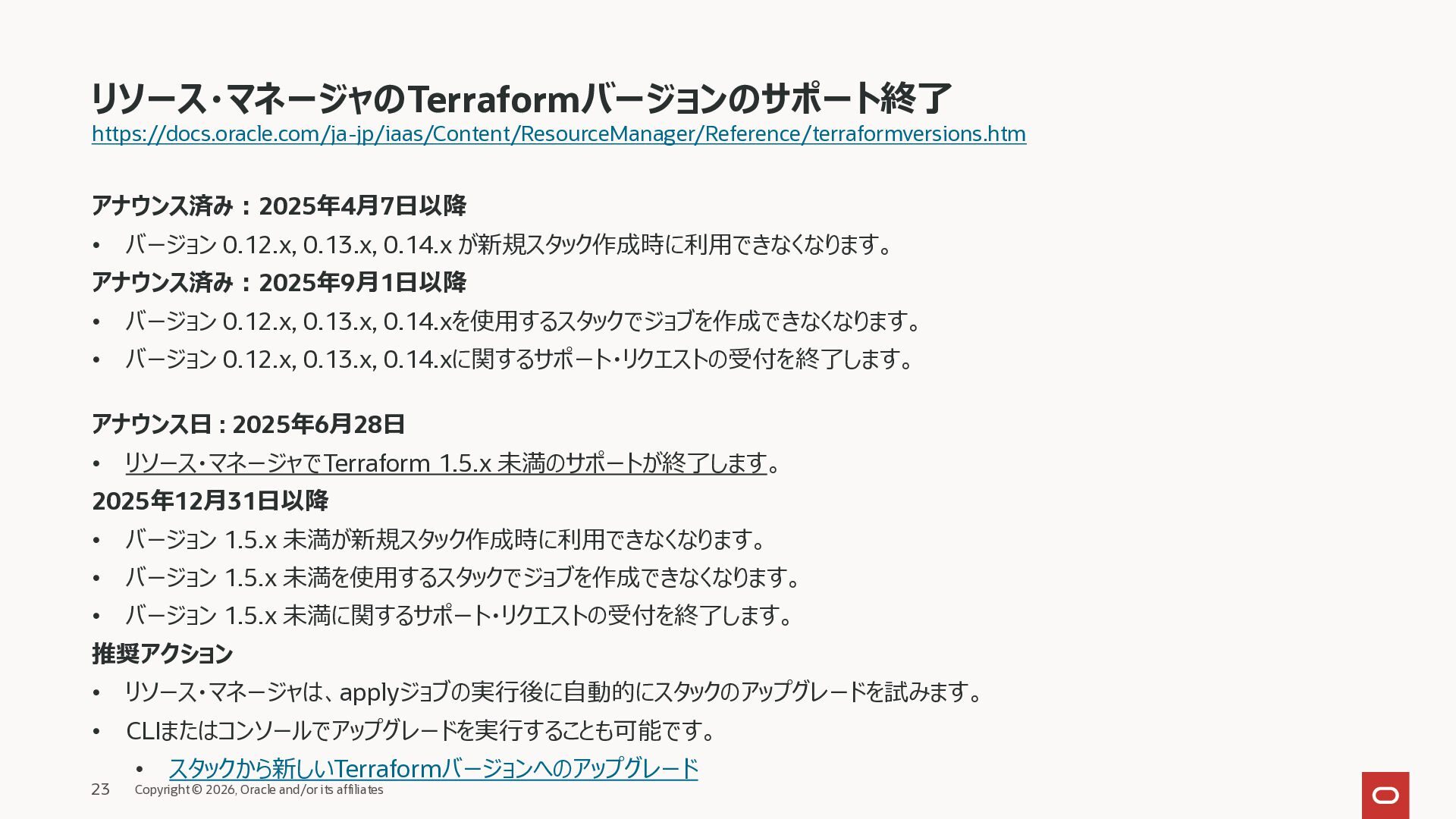 バージョン 0.12.x, 0.13.x, 0.14.xを使用するスタックでジョブを作成できなくなります。 • バージョン 0.12.x, 0.13.x, 0.14.xに関するサポート・リクエストの受付を終了します。 アナウンス日 : 2025年6月28日 • リソース・マネージャでTerraform 1.5.x 未満のサポートが終了します。 2025年12月31日以降 • バージョン 1.5.x 未満が新規スタック作成時に利用できなくなります。 • バージョン 1.5.x 未満を使用するスタックでジョブを作成できなくなります。 • バージョン 1.5.x 未満に関するサポート・リクエストの受付を終了します。 推奨アクション • リソース・マネージャは、applyジョブの実行後に自動的にスタックのアップグレードを試みます。 • CLIまたはコンソールでアップグレードを実行することも可能です。 • スタックから新しいTerraformバージョンへのアップグレード リソース・マネージャのTerraformバージョンのサポート終了 Copyright © 2026, Oracle and/or its affiliates 23