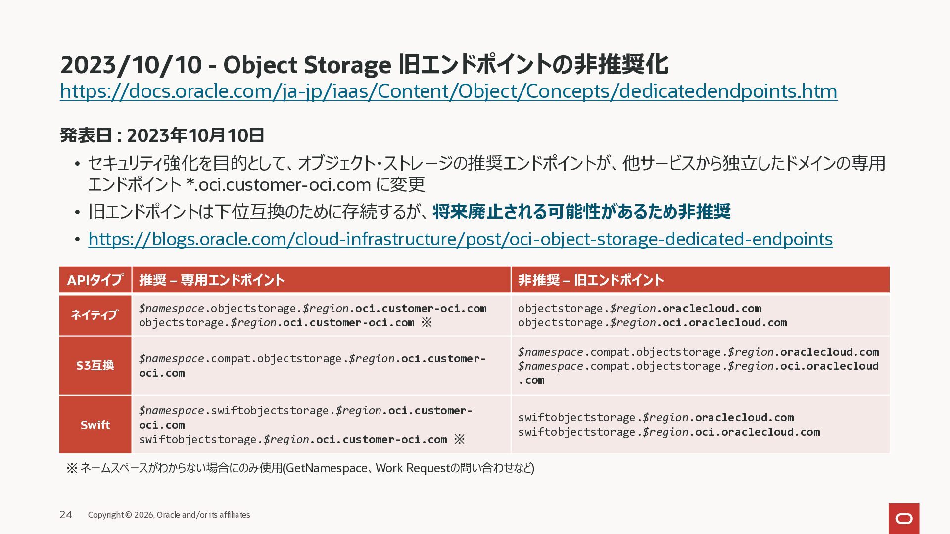 旧エンドポイントは下位互換のために存続するが、将来廃止される可能性があるため非推奨 • https://blogs.oracle.com/cloud-infrastructure/post/oci-object-storage-dedicated-endpoints 2023/10/10 - Object Storage 旧エンドポイントの非推奨化 Copyright © 2026, Oracle and/or its affiliates 24 APIタイプ 推奨 – 専用エンドポイント 非推奨 – 旧エンドポイント ネイティブ $namespace.objectstorage.$region.oci.customer-oci.com objectstorage.$region.oci.customer-oci.com ※ objectstorage.$region.oraclecloud.com objectstorage.$region.oci.oraclecloud.com S3互換 $namespace.compat.objectstorage.$region.oci.customer- oci.com $namespace.compat.objectstorage.$region.oraclecloud.com $namespace.compat.objectstorage.$region.oci.oraclecloud .com Swift $namespace.swiftobjectstorage.$region.oci.customer- oci.com swiftobjectstorage.$region.oci.customer-oci.com ※ swiftobjectstorage.$region.oraclecloud.com swiftobjectstorage.$region.oci.oraclecloud.com ※ ネームスペースがわからない場合にのみ使用(GetNamespace、Work Requestの問い合わせなど)