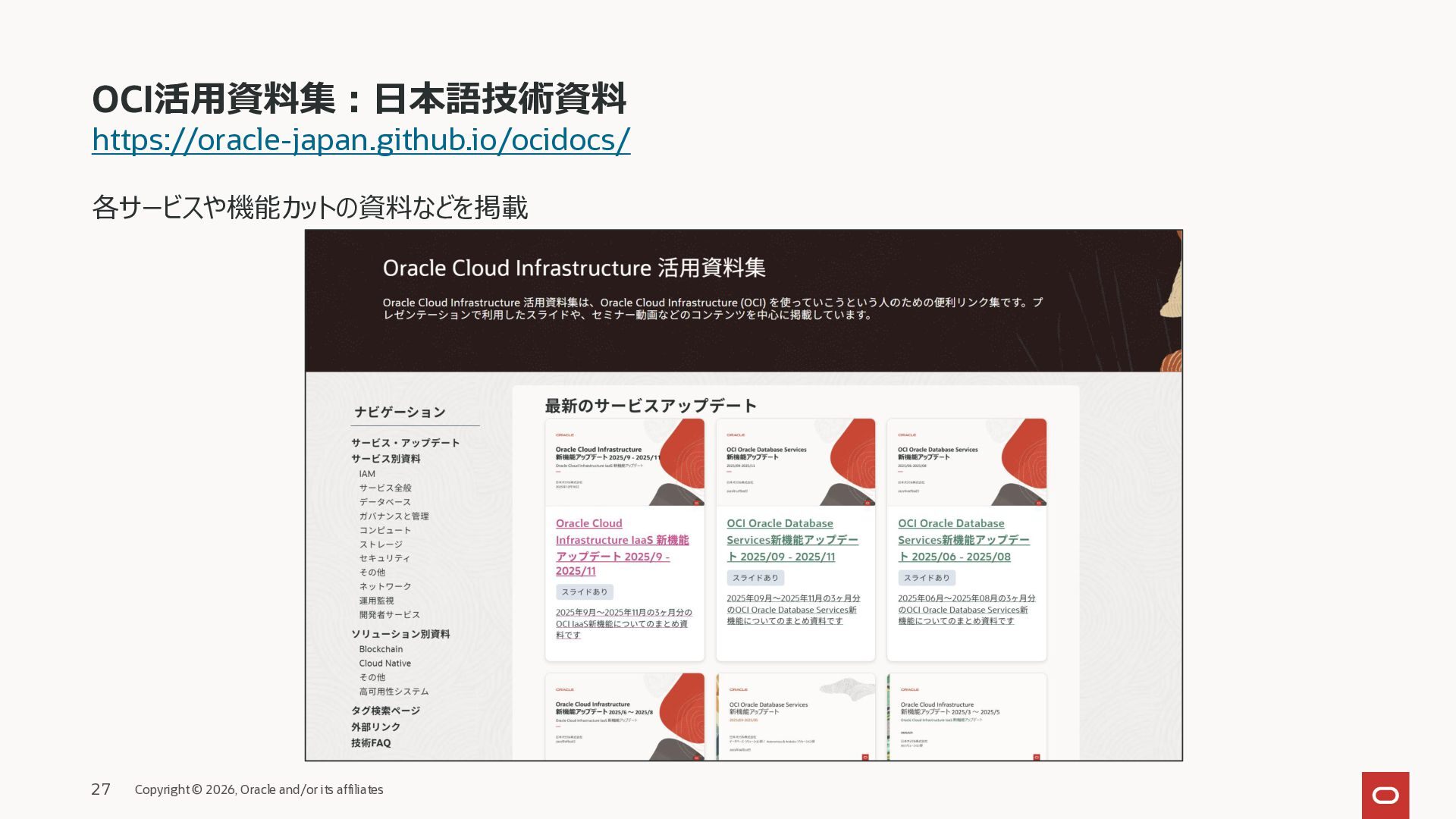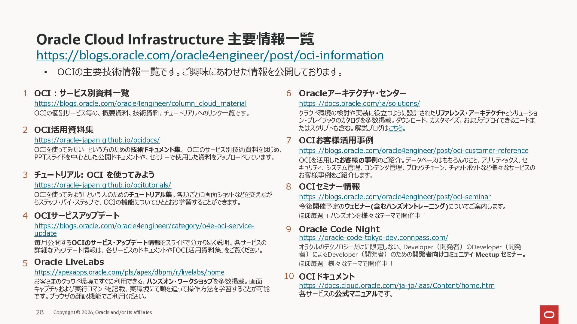 its affiliates https://blogs.oracle.com/oracle4engineer/post/oci-information 1 2 Oracleアーキテクチャ・センター https://docs.oracle.com/ja/solutions/ クラウド環境の検討や実装に役立つように設計されたリファレンス・アーキテクチャとソリューショ ン・プレイブックのカタログを多数掲載。ダウンロード、カスタマイズ、およびデプロイできるコードま たはスクリプトも含む。解説ブログはこちら。 3 OCIサービスアップデート https://blogs.oracle.com/oracle4engineer/category/o4e-oci-service- update 毎月公開するOCIのサービス・アップデート情報をスライドで分かり易く説明。各サービスの 詳細なアップデート情報は、各サービスのドキュメントや「OCI活用資料集」をご覧ください。 5 OCIお客様活用事例 https://blogs.oracle.com/oracle4engineer/post/oci-customer-reference OCIを活用したお客様の事例のご紹介。データベースはもちろんのこと、アナリティックス、セ キュリティ、システム管理、コンテンツ管理、ブロックチェーン、チャットボットなど様々なサービスの お客様事例をご紹介します。 OCI活用資料集 https://oracle-japan.github.io/ocidocs/ OCIを使ってみたい! という方のための技術ドキュメント集。 OCIのサービス別技術資料をはじめ、 PPTスライドを中心とした公開ドキュメントや、セミナーで使用した資料をアップロードしています。 6 OCIセミナー情報 https://blogs.oracle.com/oracle4engineer/post/oci-seminar 今後開催予定のウェビナー(含むハンズオントレーニング)についてご案内します。 ほぼ毎週+ハンズオンを様々なテーマで開催中! チュートリアル: OCI を使ってみよう https://oracle-japan.github.io/ocitutorials/ OCIを使ってみよう! という人のためのチュートリアル集。各項ごとに画面ショットなどを交えなが らステップ・バイ・ステップで、OCIの機能についてひととおり学習することができます。 7 OCIドキュメント https://docs.cloud.oracle.com/ja-jp/iaas/Content/home.htm 各サービスの公式マニュアルです。 8 Oracle Code Night https://oracle-code-tokyo-dev.connpass.com/ オラクルのテクノロジーだけに限定しない、Developer(開発者)のDeveloper(開発 者)によるDeveloper(開発者)のための開発者向けコミュニティ Meetup セミナー。 ほぼ毎週 様々なテーマで開催中! 9 Oracle LiveLabs https://apexapps.oracle.com/pls/apex/dbpm/r/livelabs/home お客さまのクラウド環境ですぐに利用できる、ハンズオン・ワークショップを多数掲載。画面 キャプチャおよび実行コマンドを記載、実環境にて順を追って操作方法を学習することが可能 です。ブラウザの翻訳機能でご利用ください。 4 10 • OCIの主要技術情報一覧です。ご興味にあわせた情報を公開しております。 OCI:サービス別資料一覧 https://blogs.oracle.com/oracle4engineer/column_cloud_material OCIの個別サービス毎の、概要資料、技術資料、チュートリアルへのリンク一覧です。