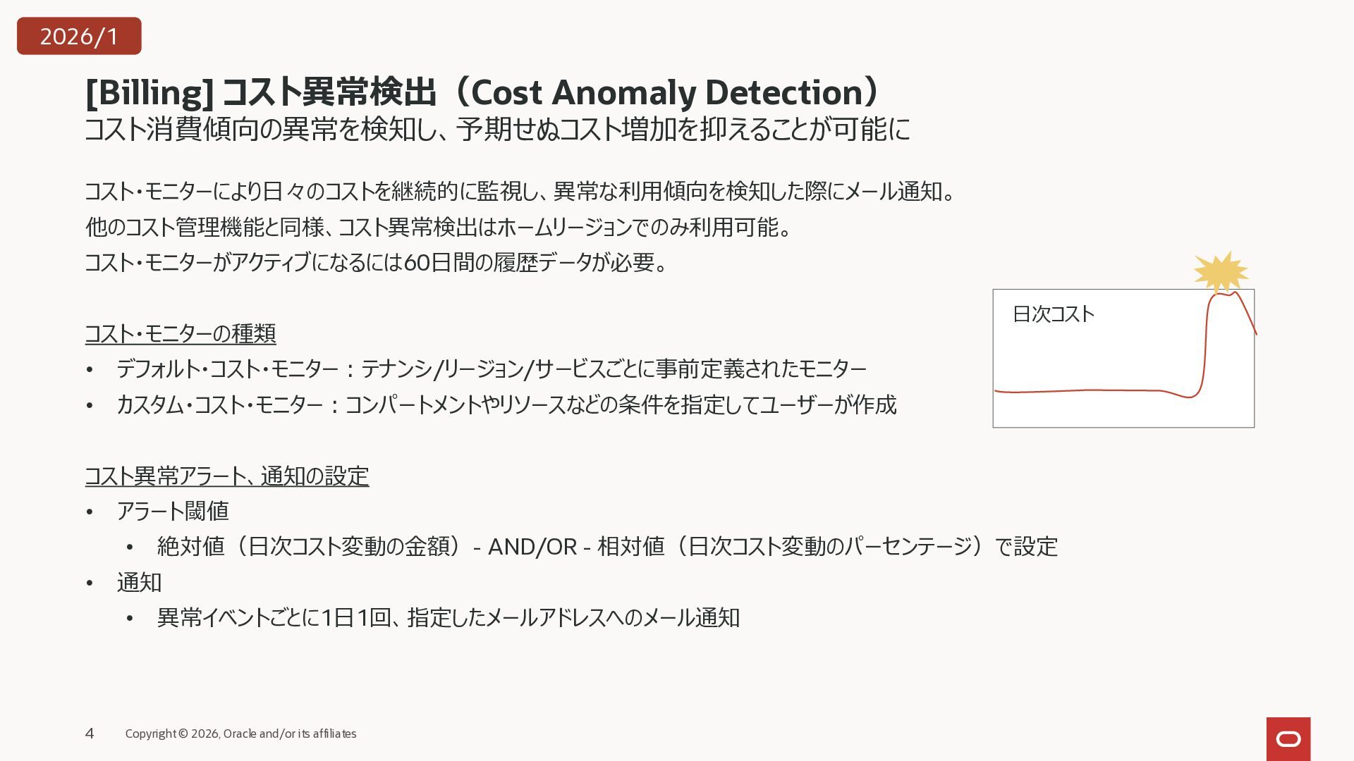 3. [Billing] コスト異常検出(Cost Anomaly Detection) コスト・モニターにより日々のコストを継続的に監視し、異常な利用傾向を検知した際にメール通知。 他のコスト管理機能と同様、コスト異常検出はホームリージョンでのみ利用可能。 コスト・モニターがアクティブになるには60日間の履歴データが必要。 コスト・モニターの種類 • デフォルト・コスト・モニター:テナンシ/リージョン/サービスごとに事前定義されたモニター