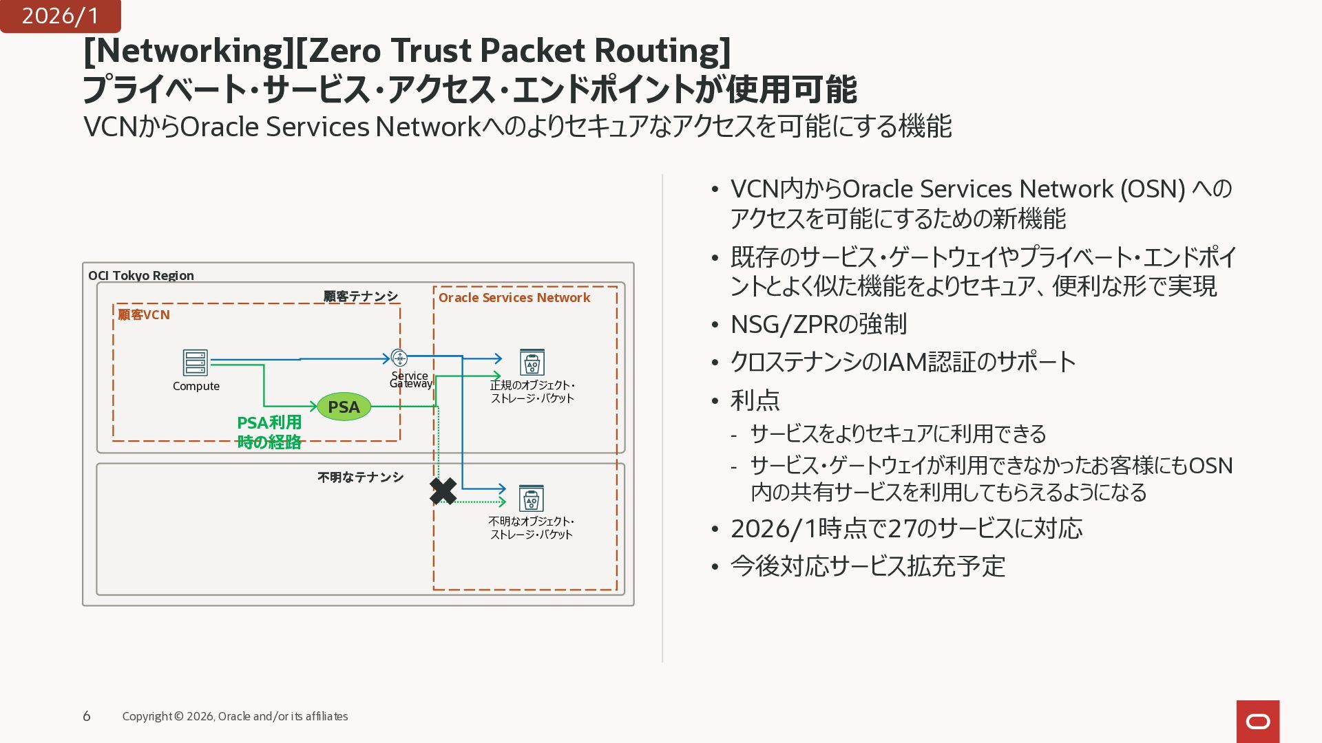 への アクセスを可能にするための新機能 • 既存のサービス・ゲートウェイやプライベート・エンドポイ ントとよく似た機能をよりセキュア、便利な形で実現 • NSG/ZPRの強制 • クロステナンシのIAM認証のサポート • 利点 - サービスをよりセキュアに利用できる - サービス・ゲートウェイが利用できなかったお客様にもOSN 内の共有サービスを利用してもらえるようになる • 2026/1時点で27のサービスに対応 • 今後対応サービス拡充予定 6 Copyright © 2026, Oracle and/or its affiliates VCNからOracle Services Networkへのよりセキュアなアクセスを可能にする機能 OCI Tokyo Region 不明なテナンシ 顧客テナンシ Oracle Services Network 顧客VCN Service Gateway Compute PSA PSA利用 時の経路 正規のオブジェクト・ ストレージ・バケット 不明なオブジェクト・ ストレージ・バケット 2026/1