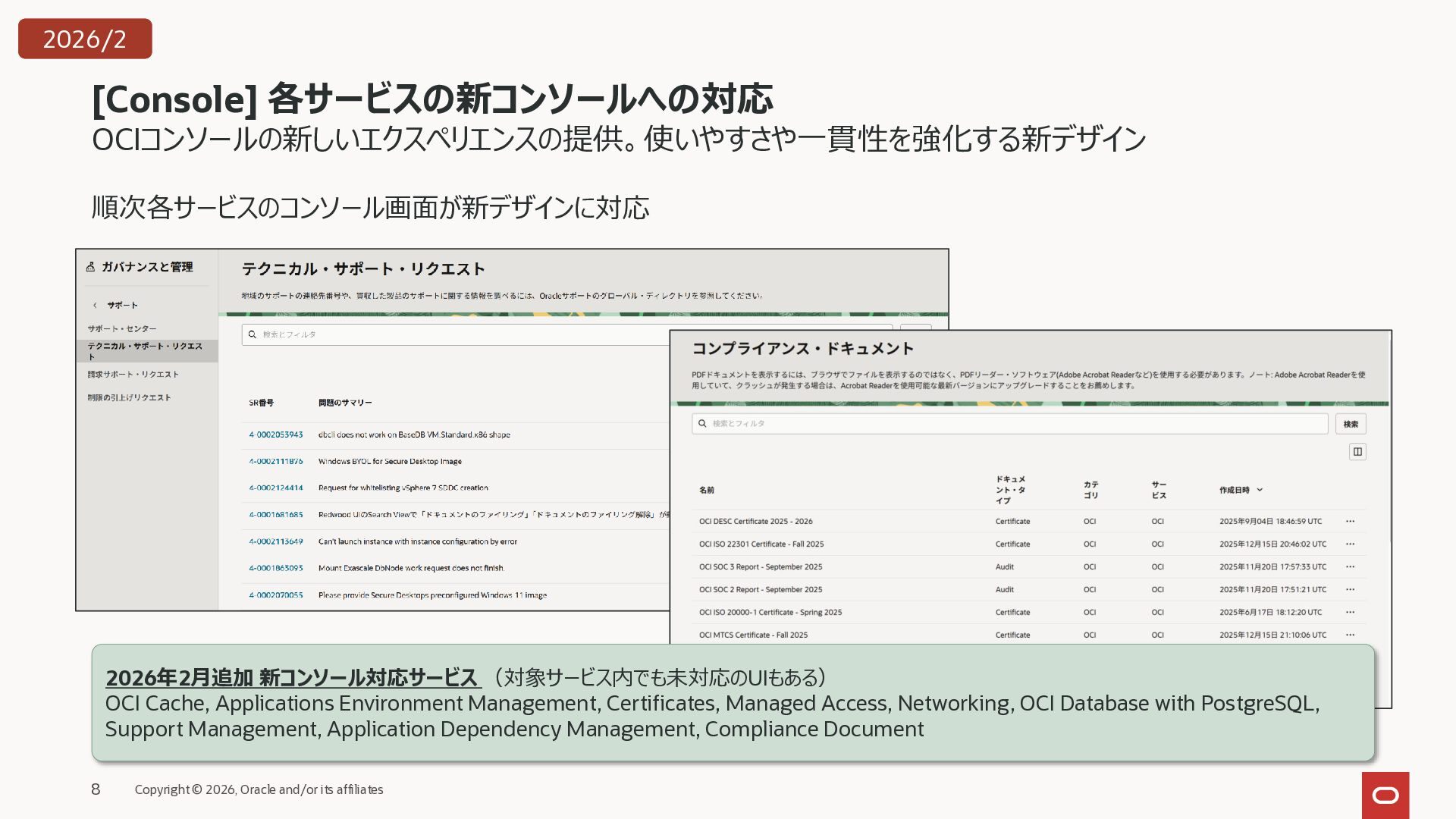 7. [Console] 各サービスの新コンソールへの対応 順次各サービスのコンソール画面が新デザインに対応 8 Copyright © 2026, Oracle and/or its
