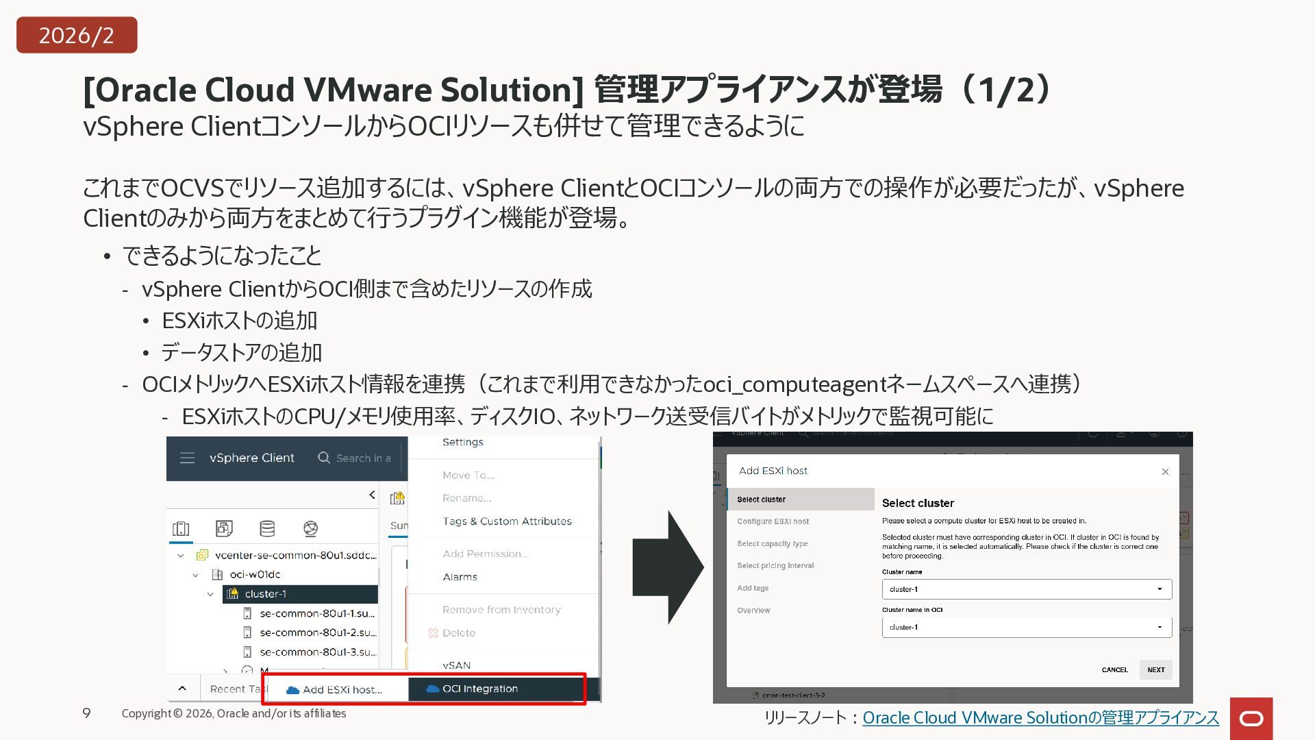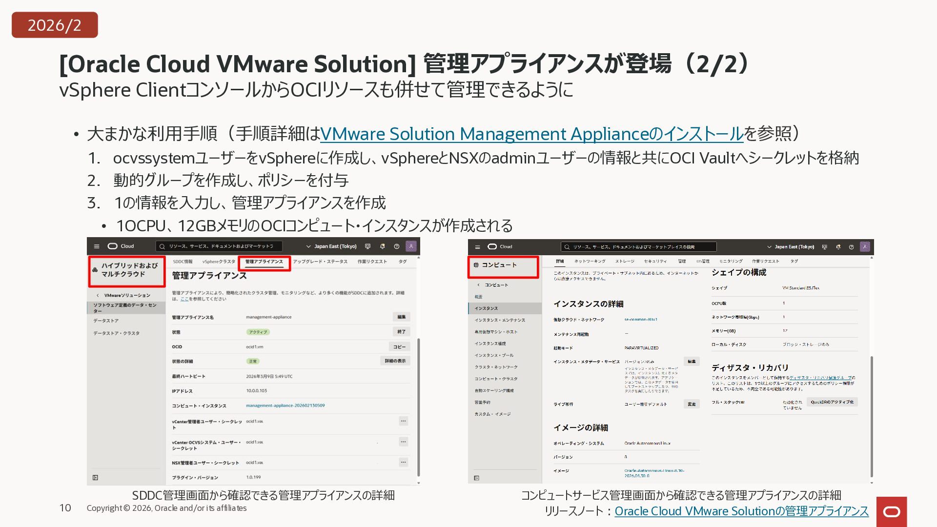 - vSphere ClientからOCI側まで含めたリソースの作成 • ESXiホストの追加 • データストアの追加 - OCIメトリックへESXiホスト情報を連携(これまで利用できなかったoci_computeagentネームスペースへ連携) - ESXiホストのCPU/メモリ使用率、ディスクIO、ネットワーク送受信バイトがメトリックで監視可能に 9 Copyright © 2026, Oracle and/or its affiliates vSphere ClientコンソールからOCIリソースも併せて管理できるように リリースノート:Oracle Cloud VMware Solutionの管理アプライアンス 2026/2