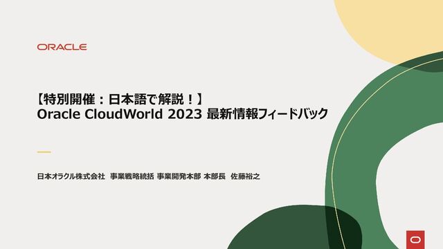 2023, Oracle and/or its affiliates CREATE JSON DUALITY VIEW student_schedule AS student {{ student : stuid name : sname major : major schedule : student_courses [ { course { time : time course : cname courseId : cid room : room teacher @unnest { teacher : tname } } } ] }; ビューの定義で JSONの PUT / GET に対応, 動的に変換 あらゆる JSONフォーマットに 対応 { "student" : "S3245", "name" : "ジル", "major" : "数学", "schedule" : [ { "time" : "14:00", "course" : "数学201", "room" : "A102", "teacher" : "アダム" }, { "time" : "16:00", "course” : "サイエンス102", "room” : "B405", "teacher” : "アニタ" } ] } スケジュール: ジル 変換