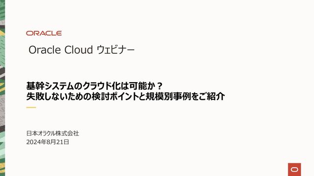 仮想マシン (Web) * 2 • データベース・サービス (PaaS) • ブロックストレージ • ロードバランサー ロードバランサー WEBサーバー WEBサーバー データベース サーバー ストレージ * as of July 2024, Tokyo Region データベース・サービスのみならず、 システム全体での⾼いコストパフォマンスを 実現できるのがOCIのメリット OCIの強み(コスト) Copyright © 2024, Oracle and/or its affiliates 64 OCI BaseDB 他社クラウド (Oracle Database) 他社クラウド (PostgreSQL) 仮想マシン (Web) 19,165円 VM.Standard.E5 (Linux, 4vCPU, 16GB) 62,384円 仮想マシン(Linux, 4vCPU, 16GB) 62,384円 仮想マシン(Linux, 4vCPU, 16GB) データベース・サー ビス 44,789円 (4vCPU, 32GB) 115,826円 (4vCPU, 32GB) 62,496円 (4vCPU, 32GB) ブロックストレージ 5,950円 Block Volume (1TB, 25,000 IOPS) 13,440円 ブロックストレージ (1TB, 3,000 IOPS) 13,440円 ブロックストレージ (1TB, 3,000 IOPS) ロードバランサー 2,219円 (100Mbps, 処理量課⾦無し) 2,531円 (処理量課⾦が別途 必要) 2,531円 (処理量課⾦が別途 必要) 合計 (⽉額) 72,123円 194,181円 (2.7倍) 140,851円 (1.9倍) サポート 含む 別途必要 別途必要 商⽤Linux 無償 別途必要 別途必要 データ転送料 別途必要 (10TB無償) 別途必要 (100GB無償) 別途必要 (100GB無償)