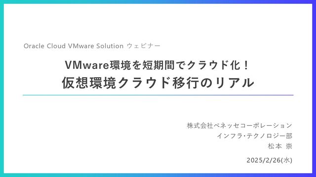 VMware Solution VMware Cloud on AWS Google Cloud VMware Engine Azure VMware Solution 提供ライセンス VMware License NSX-T, vSphere, vSAN, vCenter, HCX (全ベンダー共通) セキュリティ Root パスワード ユーザーが保持 AWSが保持 GCPが保持 Azureが保持 メタデータ ユーザーが保持 AWSが保持 GCPが保持 Azureが保持 配置されるネットワーク ユーザーの仮想ネットワーク内 別ネットワーク 別ネットワーク 別ネットワーク 管理 / 制御 管理 / 制御形態 お客様による制御 VMware が管理 GCP が管理 Azure が管理 vCenterアクセス 管理者権限によるアクセス 制限アクセス 制限アクセス 制限アクセス ESXiホストへのアクセス あり なし なし なし パッチ/アップグレード ユーザーが決定/実施 AWS が決定/実施 GCP が決定/実施 Azure が決定/実施 その他 国内可能リージョン 東京、大阪 東京、大阪 東京 東京、大阪 Oracle DB - PaaS あり あり(AWS) なし あり(東京, Exadata) 構成 Intel/AMD Dense シェイプ Intel/AMD Standard シェイプ Intel GPUシェイプ Intel Denseシェイプのみ Intel Denseシェイプのみ Intel Denseシェイプのみ スケーラビリティ • クラスタあたり64台 • クラスタあたり16台 • クラスタあたり32台 • クラスタあたり16台 他社クラウドVMwareサービス比較 Oracle Cloud VMware Solutionは、 ユーザーが制限のない管理者アクセスを保持 移行手段の選択・構成の自由度が高く、ニーズにあわせやすい
